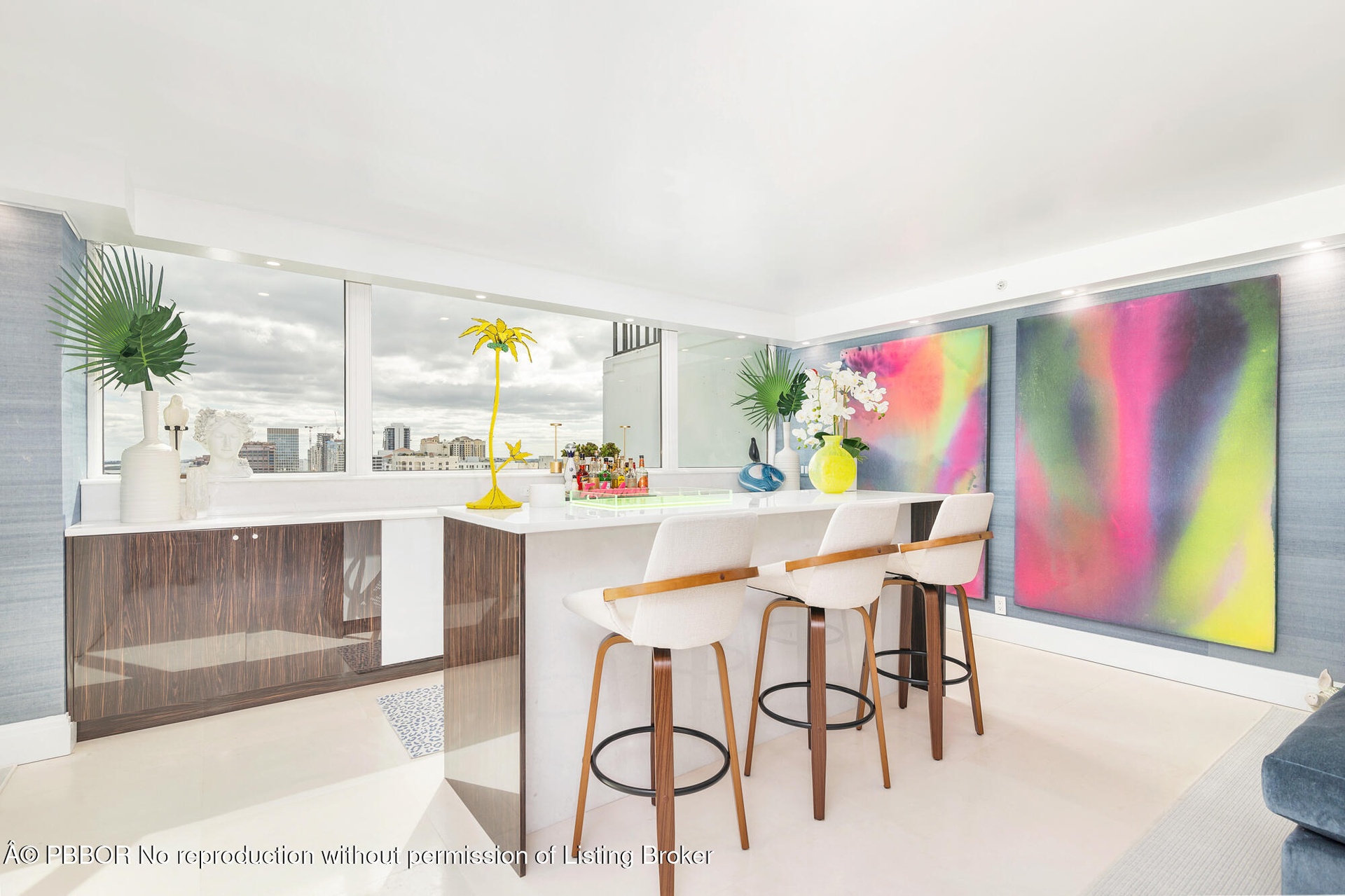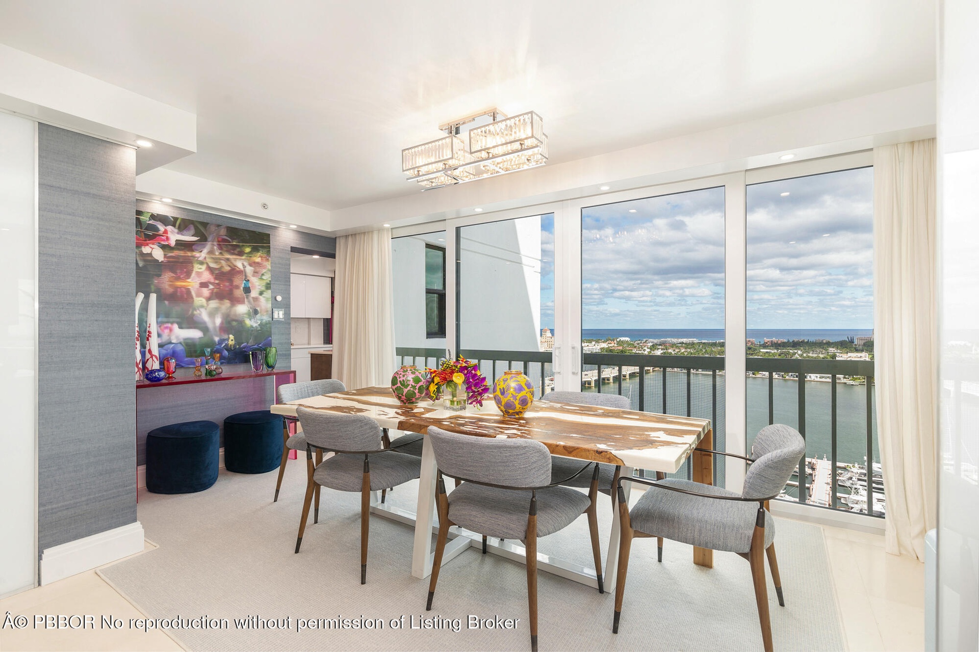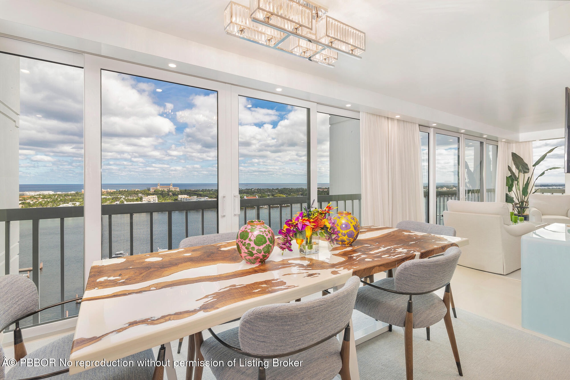 Located in one of only four direct waterfront buildings in downtown West Palm Beach, this penthouse offers sweeping, mesmerizing water views from every room, including the Intracoastal, ocean, marina and city vistas. The residence has undergone a complete high-end renovation, featuring a quartz entertaining bar with under-mount LED lighting, a modern kitchen, Thermador wine refrigerator, multiple living and entertaining areas, spacious bedrooms, and a large walk-in closet in the primary suite. Ideally located near the North Bridge, Royal Poinciana Plaza, Palm Harbor Marina, shopping, and dining. Includes two garage parking spaces. Full-service, pet-friendly building with 24/7 doorman and security, valet parking, swimming pool, tennis and pickle ball court. DISCLAIMER: The written and verbal information provided including but not limited to prices, measurements, square footages, lot sizes, calculations and statistics have been obtained and conveyed from third parties such as the applicable Multiple Listing Service, public records as well as other sources. All information including that produced by the Sellers or Listing Company are subject to errors, omissions or changes without notice and should be independently verified by any prospect for the purchase of a Property. The Sellers and Listing Company expressly disclaim any warranty or representation regarding all information. Prospective purchasers' use of this or any written and verbal information is acknowledgement of this disclaimer and that Prospects shall perform their own due diligence. Prospective purchasers shall not rely on any written or verbal information provided when entering a contract for sale and purchase. Some affiliations may not be applicable to certain geographic areas. Copyright 2023 Listing Company. All Rights Reserved.
