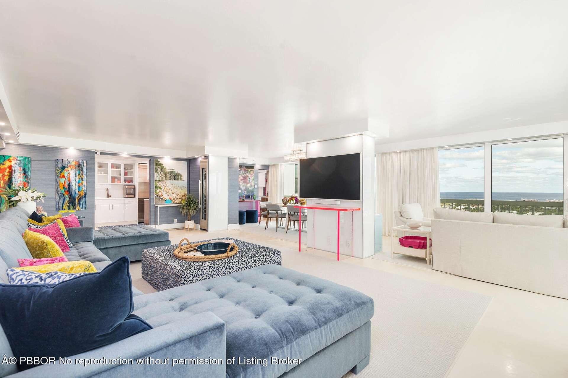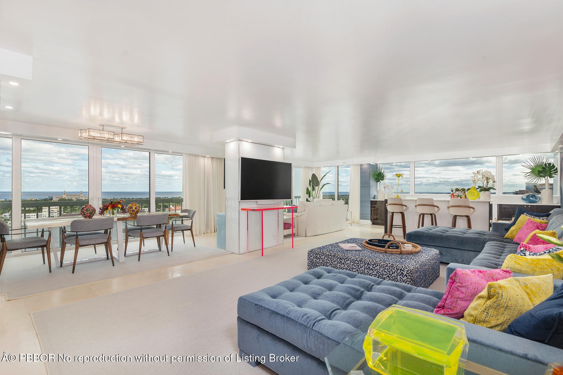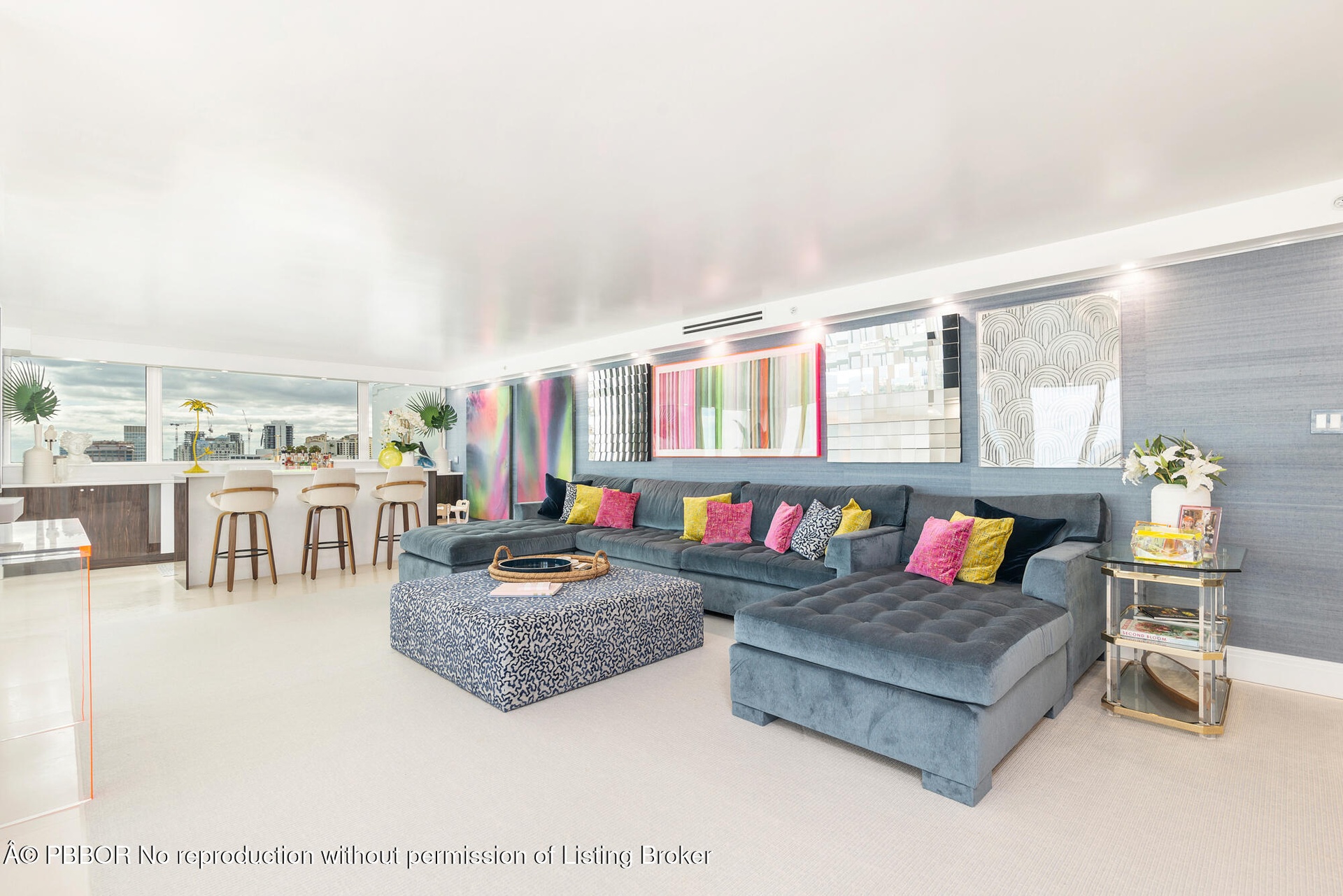 Located in one of only four direct waterfront buildings in downtown West Palm Beach, this penthouse offers sweeping, mesmerizing water views from every room, including the Intracoastal, ocean, marina and city vistas. The residence has undergone a complete high-end renovation, featuring a quartz entertaining bar with under-mount LED lighting, a modern kitchen, Thermador wine refrigerator, multiple living and entertaining areas, spacious bedrooms, and a large walk-in closet in the primary suite. Ideally located near the North Bridge, Royal Poinciana Plaza, Palm Harbor Marina, shopping, and dining. Includes two garage parking spaces. Full-service, pet-friendly building with 24/7 doorman and security, valet parking, swimming pool, tennis and pickle ball court. DISCLAIMER: The written and verbal information provided including but not limited to prices, measurements, square footages, lot sizes, calculations and statistics have been obtained and conveyed from third parties such as the applicable Multiple Listing Service, public records as well as other sources. All information including that produced by the Sellers or Listing Company are subject to errors, omissions or changes without notice and should be independently verified by any prospect for the purchase of a Property. The Sellers and Listing Company expressly disclaim any warranty or representation regarding all information. Prospective purchasers' use of this or any written and verbal information is acknowledgement of this disclaimer and that Prospects shall perform their own due diligence. Prospective purchasers shall not rely on any written or verbal information provided when entering a contract for sale and purchase. Some affiliations may not be applicable to certain geographic areas. Copyright 2023 Listing Company. All Rights Reserved.