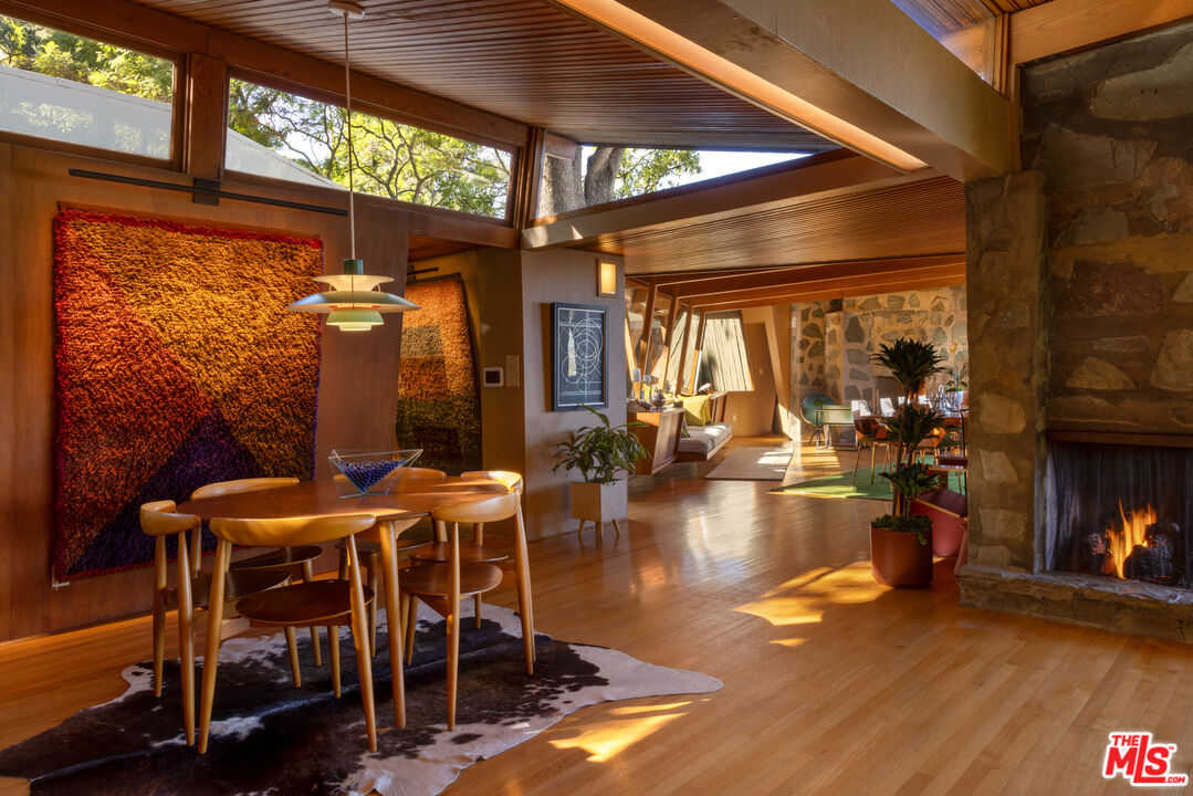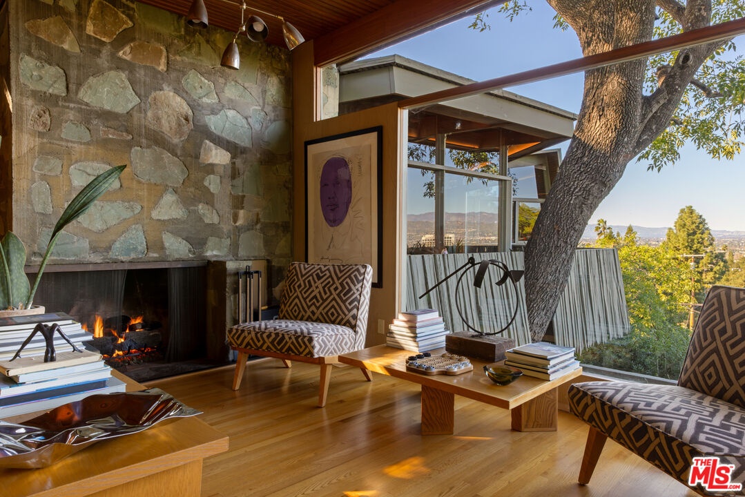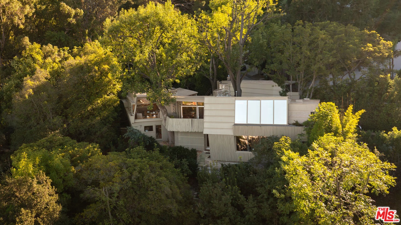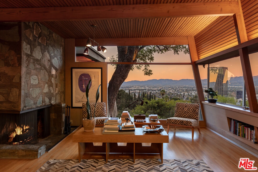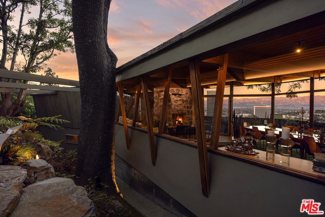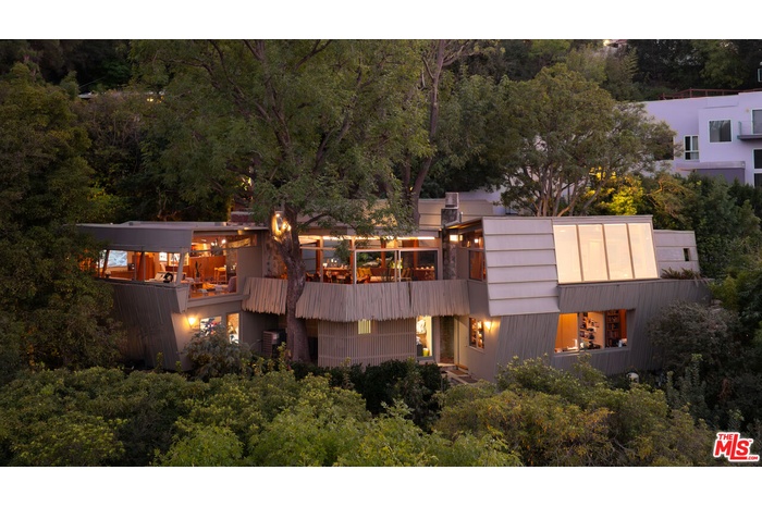 Designed in 1946 by renowned architect Rudolph Schindler, the Kallis-Sharlin Residence is a striking example of site-driven modernism, dramatically set into a steep hillside with expansive views over the San Fernando Valley. Originally built for artist and film art director Mischa Kallis, the home follows the natural contours of the land, with layered volumes, terraces, and walls of glass that connect the interiors to the surrounding landscape. Inside, Schindler's signature design language is on full display, with unconventional angles, abundant natural light, and a strong sense of flow between spaces. The iconic butterfly roof brings in clerestory light throughout the home, while warm materials - most notably mahogany and Douglas fir walls, ceilings and built-in furniture - add richness and character. Distinctive grape-stake cladding wraps portions of the exterior, allowing the home to blend seamlessly into its wooded setting while enhancing privacy. Additional features include four fireplaces, a spa-like steam shower, a mahogany soaking tub, a glass-enclosed office, climate-controlled basement storage, a rare private bocce court and a swimmers pool and jacuzzi. Designated Los Angeles Historic-Cultural Monument #860, the Kallis-Sharlin Residence underwent a thoughtful, multi-year restoration from 2017-2022 in collaboration with Barbara Bestor and Jeff Fink. The result is a beautifully preserved and highly livable architectural landmark - offering a rare opportunity to own a significant and celebrated piece of Los Angeles design history.