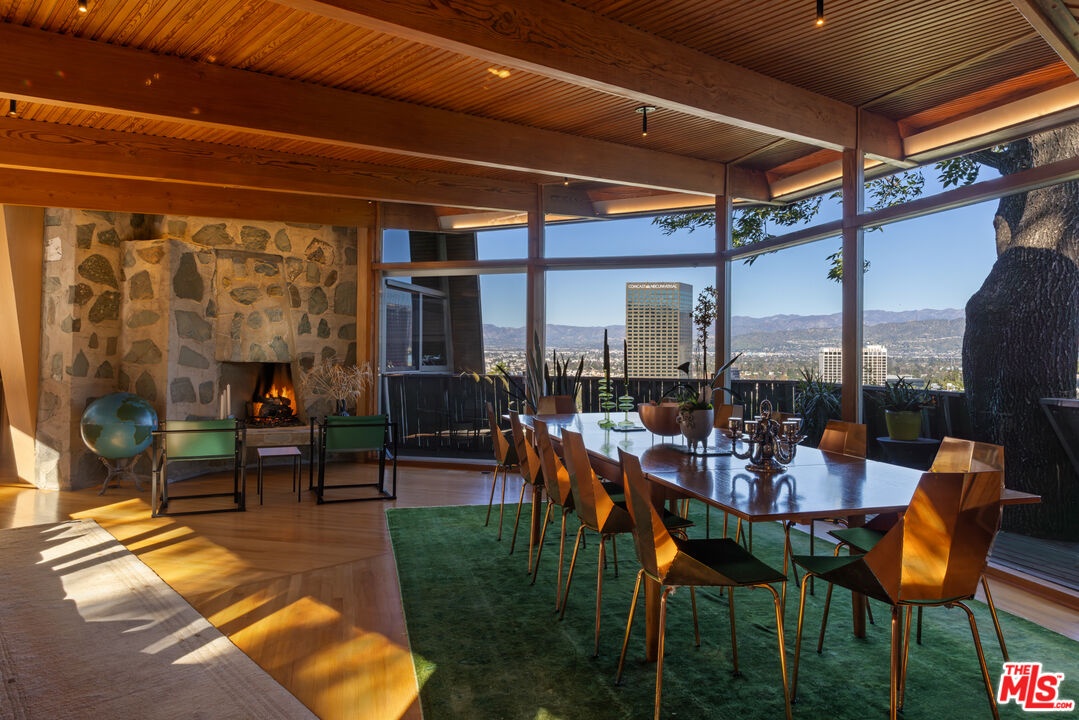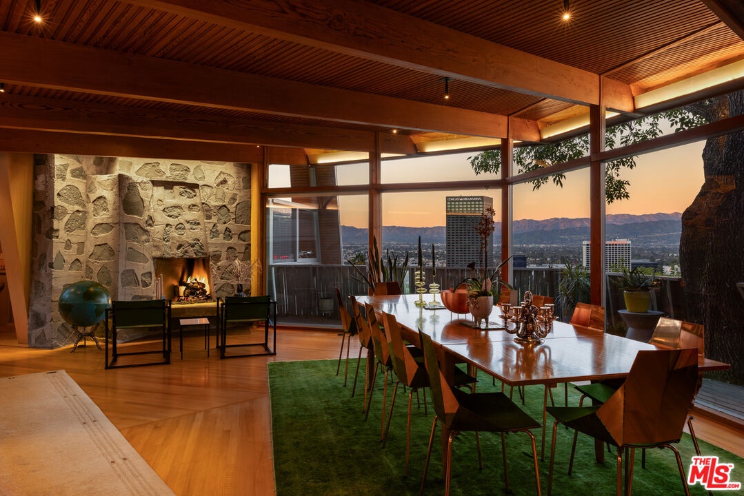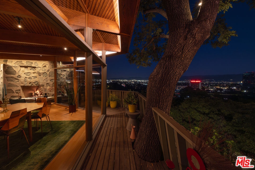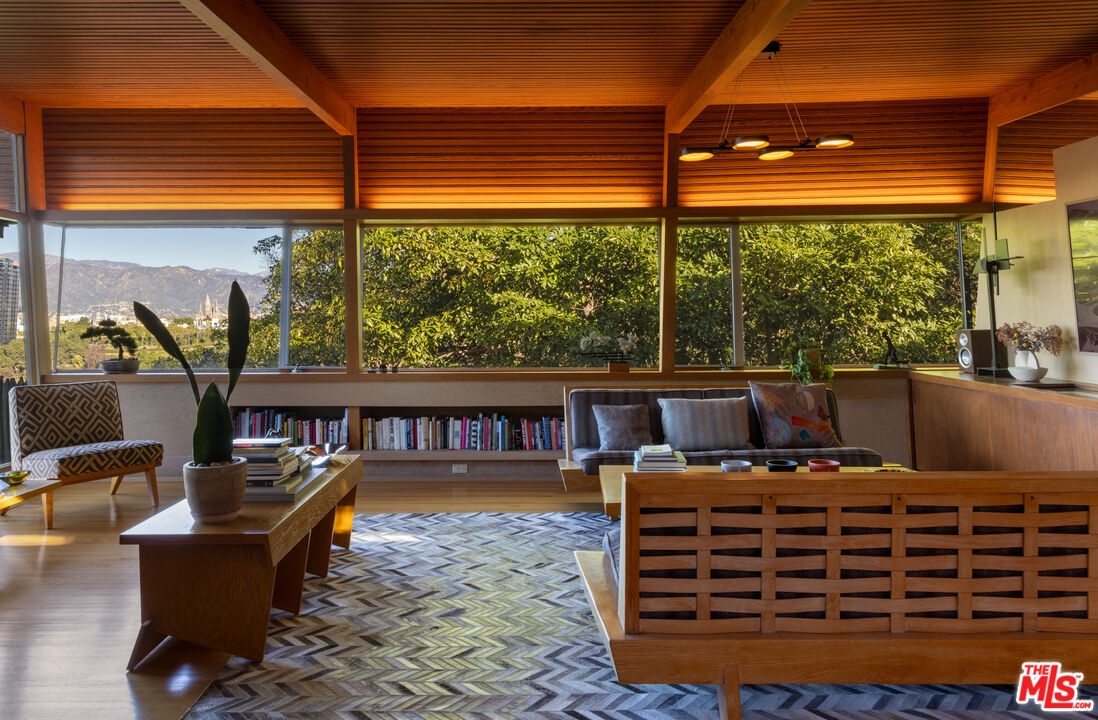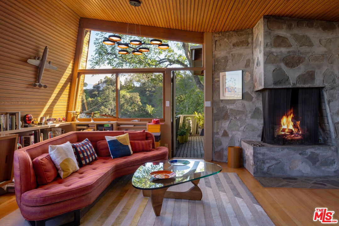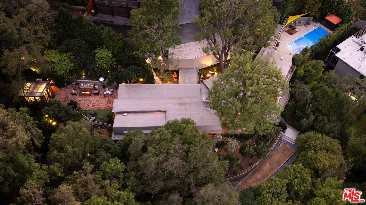 Designed in 1946 by renowned architect Rudolph Schindler, the Kallis-Sharlin Residence is a striking example of site-driven modernism, dramatically set into a steep hillside with expansive views over the San Fernando Valley. Originally built for artist and film art director Mischa Kallis, the home follows the natural contours of the land, with layered volumes, terraces, and walls of glass that connect the interiors to the surrounding landscape. Inside, Schindler's signature design language is on full display, with unconventional angles, abundant natural light, and a strong sense of flow between spaces. The iconic butterfly roof brings in clerestory light throughout the home, while warm materials - most notably mahogany and Douglas fir walls, ceilings and built-in furniture - add richness and character. Distinctive grape-stake cladding wraps portions of the exterior, allowing the home to blend seamlessly into its wooded setting while enhancing privacy. Additional features include four fireplaces, a spa-like steam shower, a mahogany soaking tub, a glass-enclosed office, climate-controlled basement storage, a rare private bocce court and a swimmers pool and jacuzzi. Designated Los Angeles Historic-Cultural Monument #860, the Kallis-Sharlin Residence underwent a thoughtful, multi-year restoration from 2017-2022 in collaboration with Barbara Bestor and Jeff Fink. The result is a beautifully preserved and highly livable architectural landmark - offering a rare opportunity to own a significant and celebrated piece of Los Angeles design history.