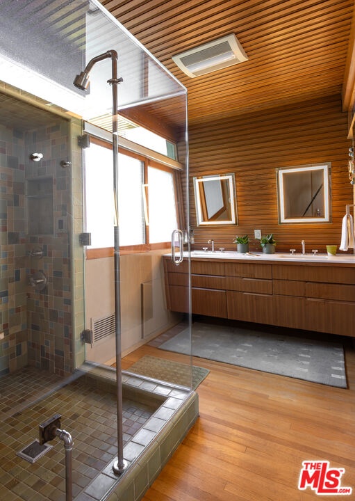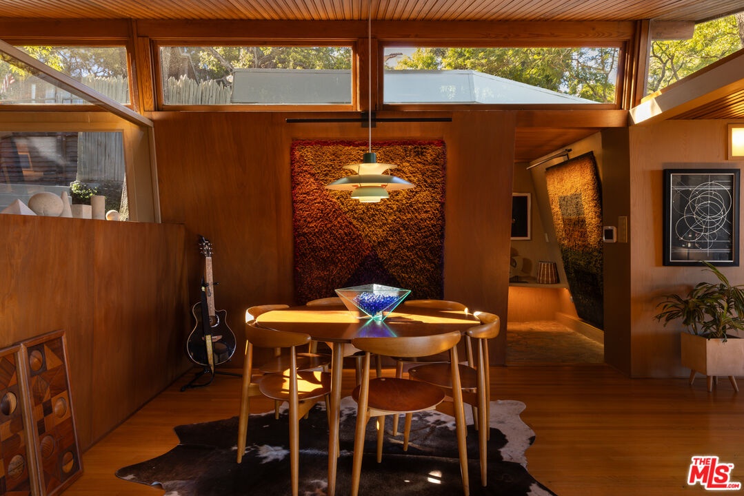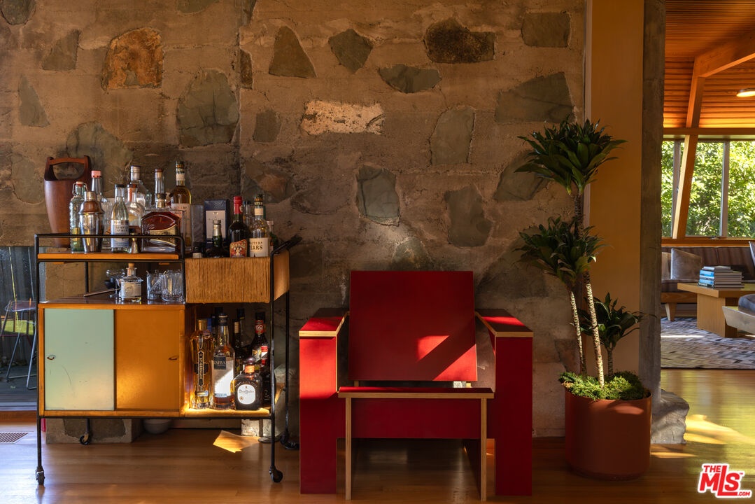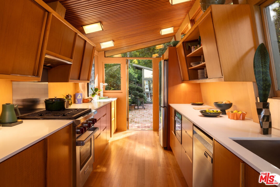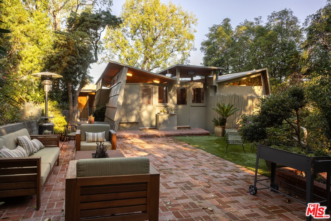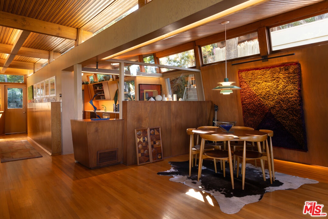 Designed in 1946 by renowned architect Rudolph Schindler, the Kallis-Sharlin Residence is a striking example of site-driven modernism, dramatically set into a steep hillside with expansive views over the San Fernando Valley. Originally built for artist and film art director Mischa Kallis, the home follows the natural contours of the land, with layered volumes, terraces, and walls of glass that connect the interiors to the surrounding landscape. Inside, Schindler's signature design language is on full display, with unconventional angles, abundant natural light, and a strong sense of flow between spaces. The iconic butterfly roof brings in clerestory light throughout the home, while warm materials - most notably mahogany and Douglas fir walls, ceilings and built-in furniture - add richness and character. Distinctive grape-stake cladding wraps portions of the exterior, allowing the home to blend seamlessly into its wooded setting while enhancing privacy. Additional features include four fireplaces, a spa-like steam shower, a mahogany soaking tub, a glass-enclosed office, climate-controlled basement storage, a rare private bocce court and a swimmers pool and jacuzzi. Designated Los Angeles Historic-Cultural Monument #860, the Kallis-Sharlin Residence underwent a thoughtful, multi-year restoration from 2017-2022 in collaboration with Barbara Bestor and Jeff Fink. The result is a beautifully preserved and highly livable architectural landmark - offering a rare opportunity to own a significant and celebrated piece of Los Angeles design history.