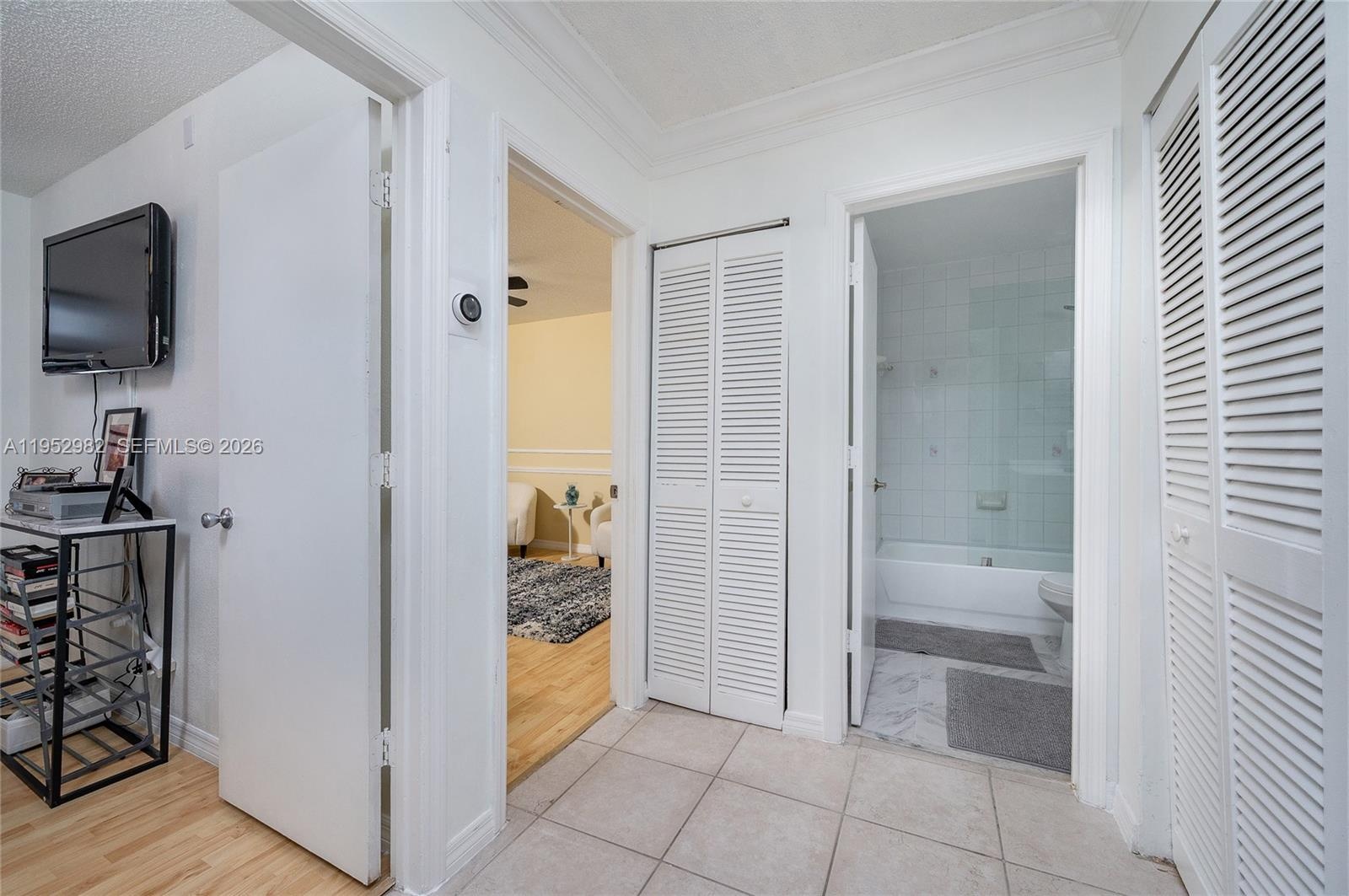 You'll Love It! This spacious corner 3/2 unit offers natural light throughout, updated kitchen with pine wood cabinetry, washer/dryer. Features 2 master bedrooms and updated bathrooms. Crown moldings, hurricane panels. Large walk-in closet. Access to attic for additional storage. Two assigned parking spaces with plenty of guest parking. Enjoy the array of amenities, 2 community pools, kids playground and security. ASSOCIATION HAS RESERVES.