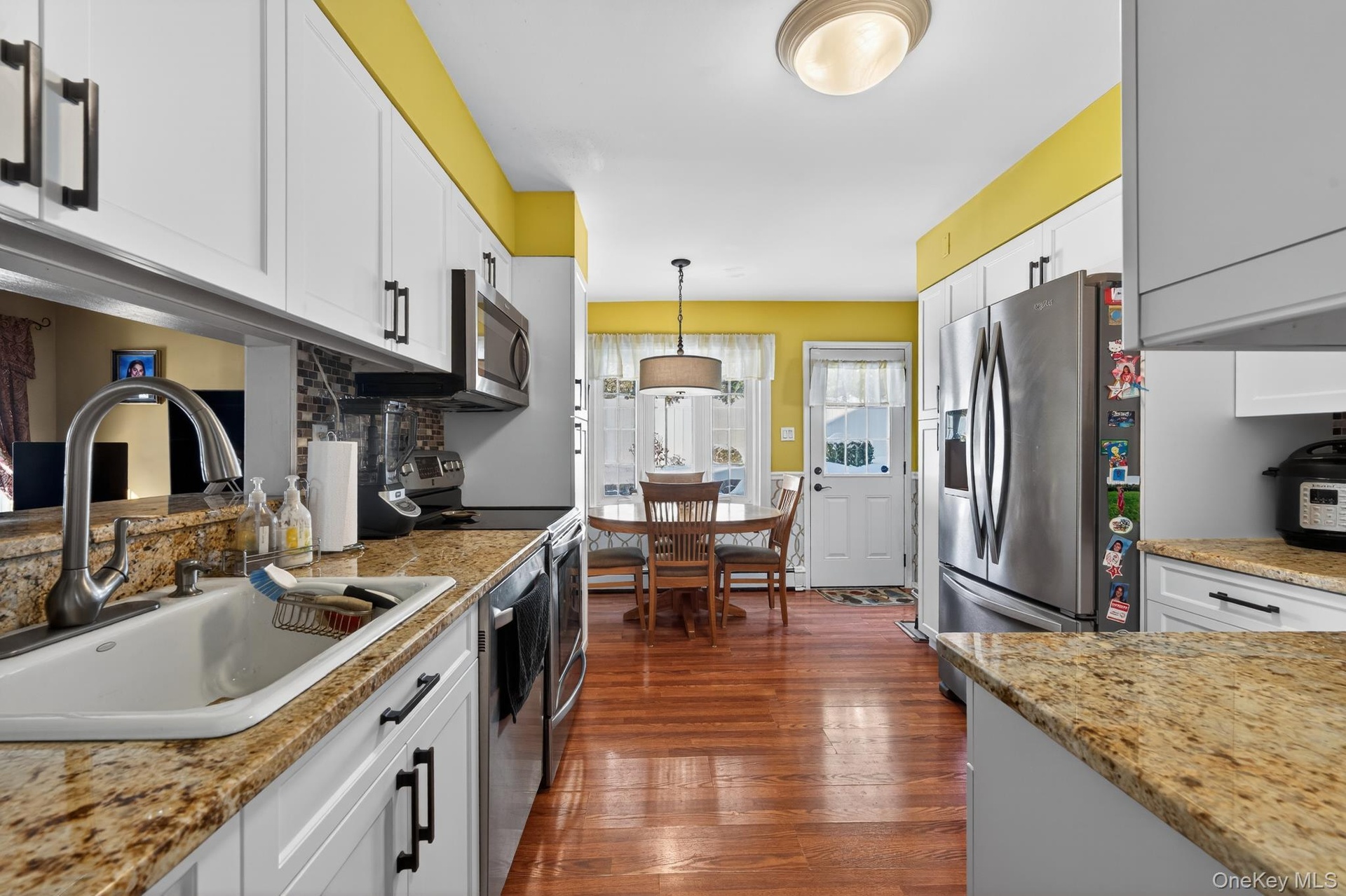 The upgraded eat-in kitchen (2021) includes granite countertops and stainless steel appliances. Major improvements include a new driveway and walkway (2025), 22 SEER heat pump and AC system (2022), and roof, siding, PVC fencing, gutters, and above ground 30x30 pool with Hayward motor/filter (2015). Additional highlights include oil baseboard heat, 200-amp electric service, two-car garage with new garage door openers, 6-zone in-ground sprinkler system, 12x12 outdoor shed, wireless upgraded home security system, and a 2-stage snowblower left by the seller.