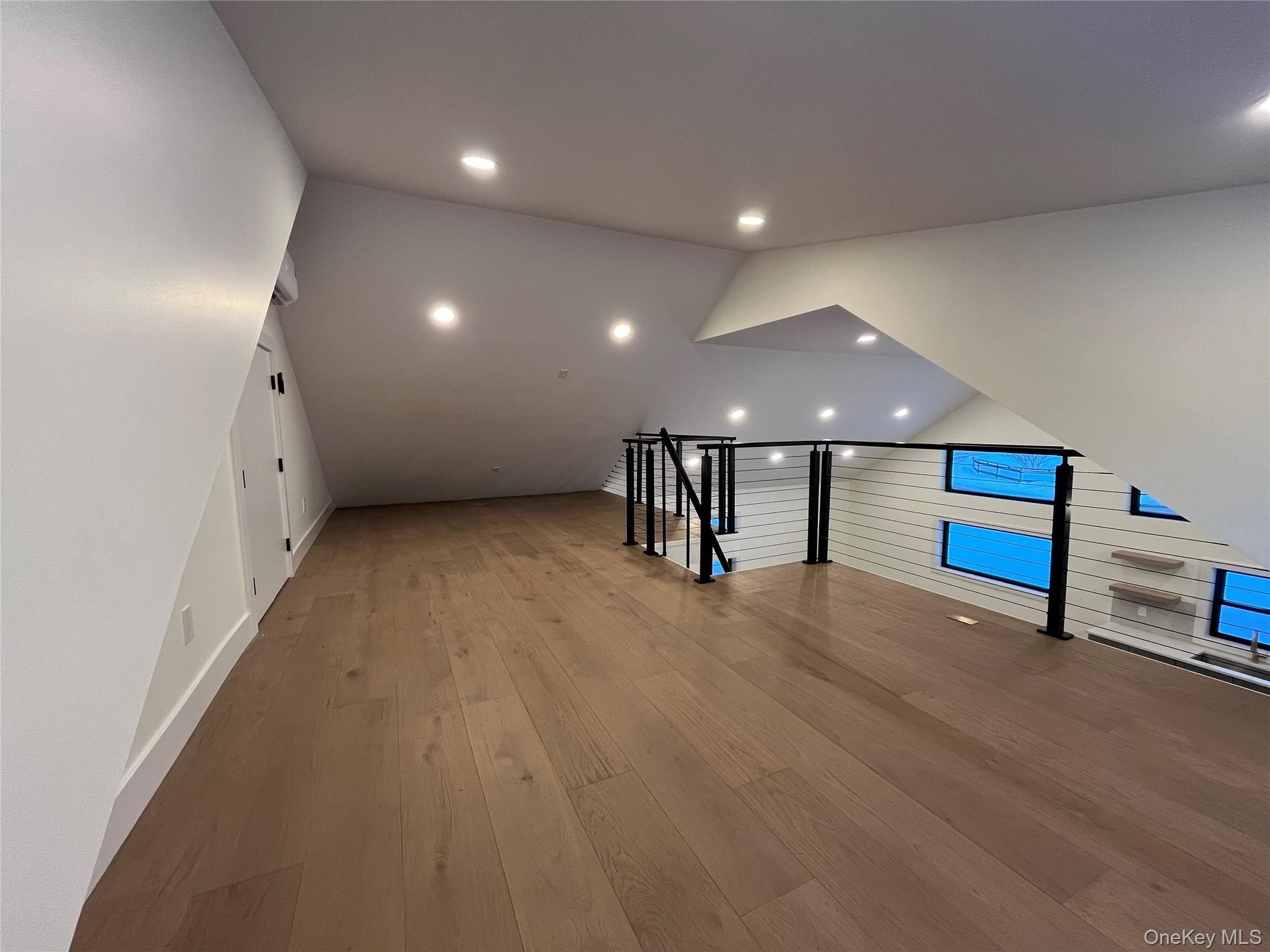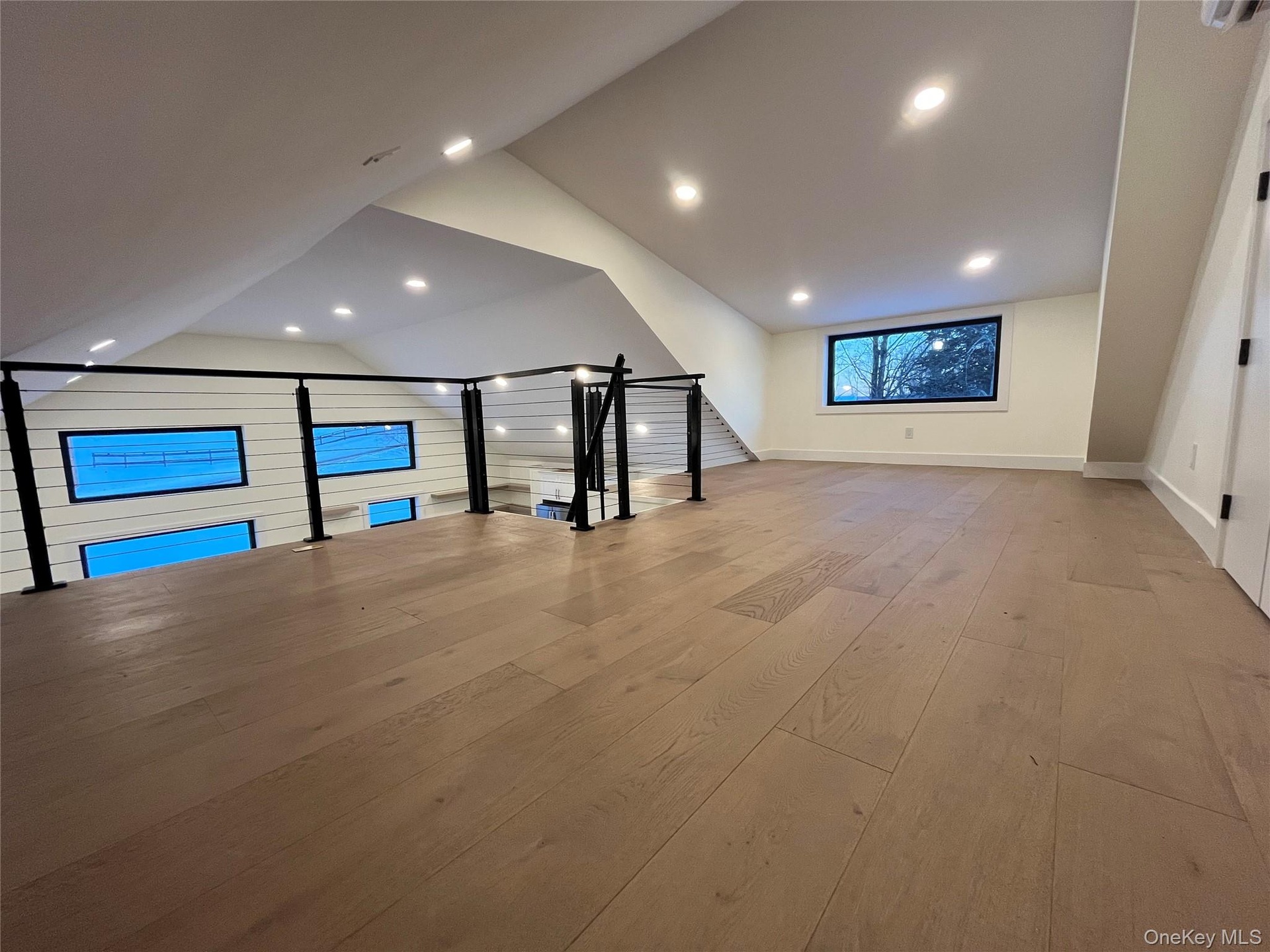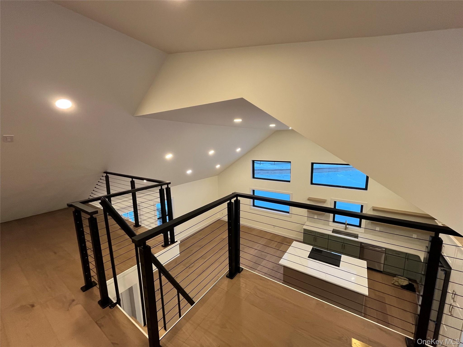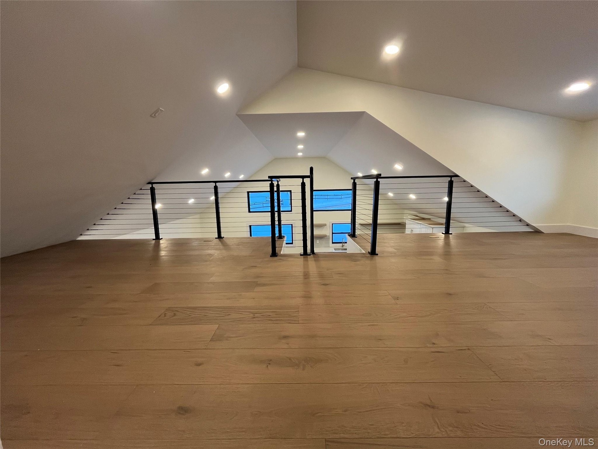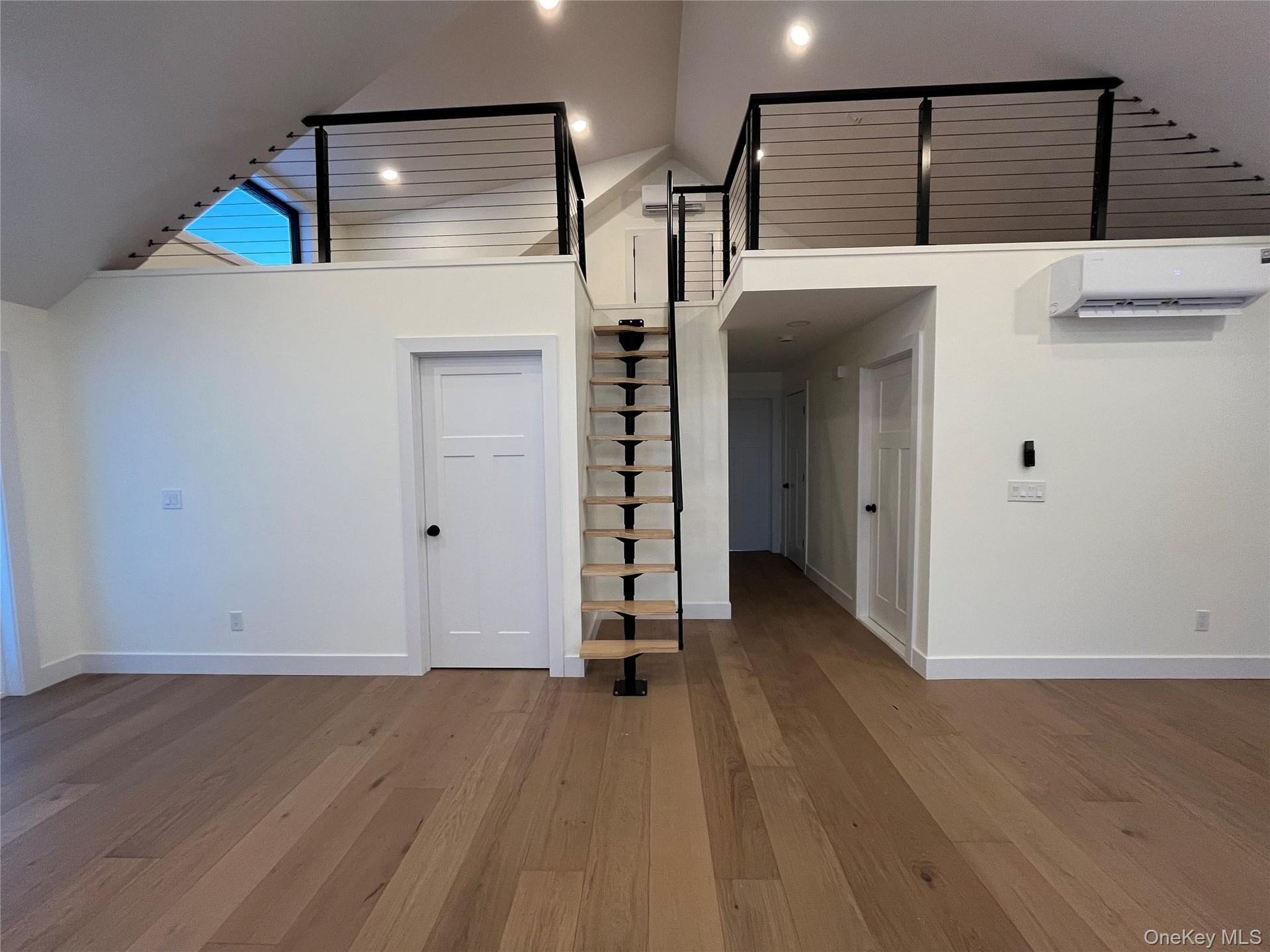 Inside, the wow factor hits immediately. The main living space features soaring 17-foot ceilings, expansive walls of windows, and wide-plank hardwood floors that flood the home with natural light and elevate the entire experience. A 475-square-foot loft with sleek modern cable railings overlooks the living area—perfect for a home office, media lounge, or creative studio.