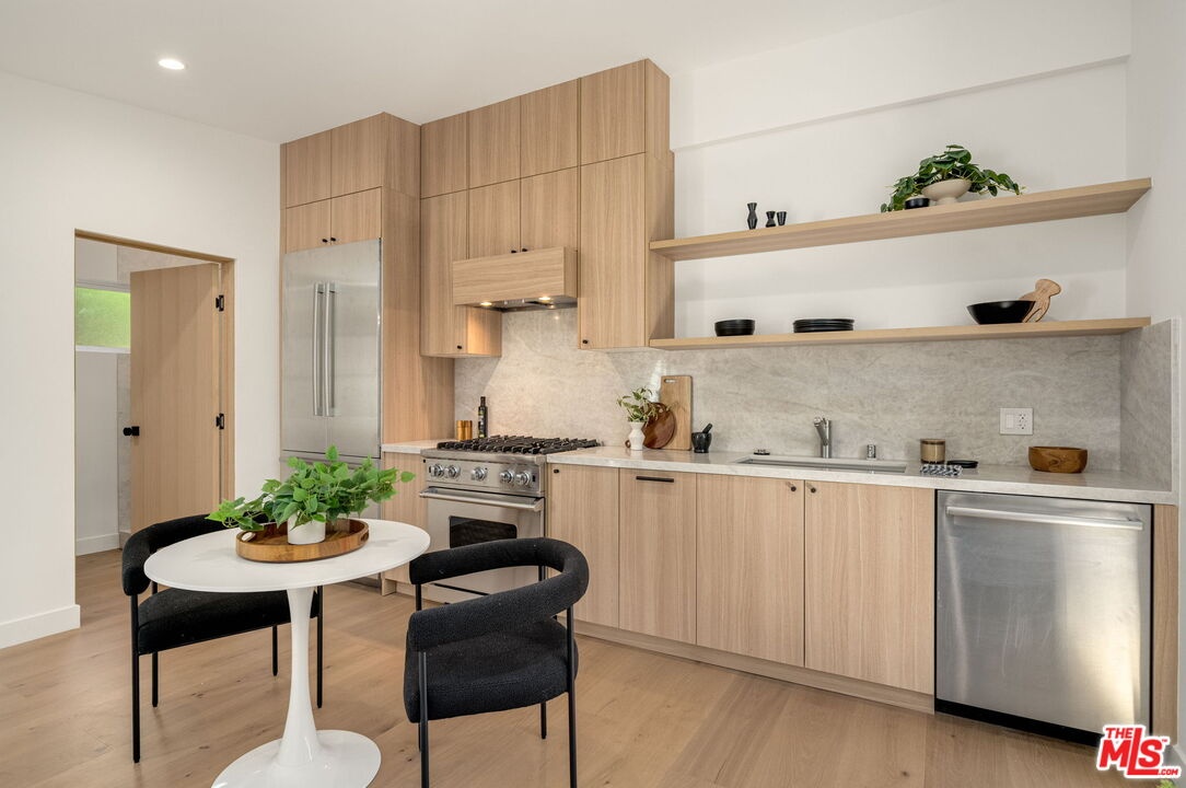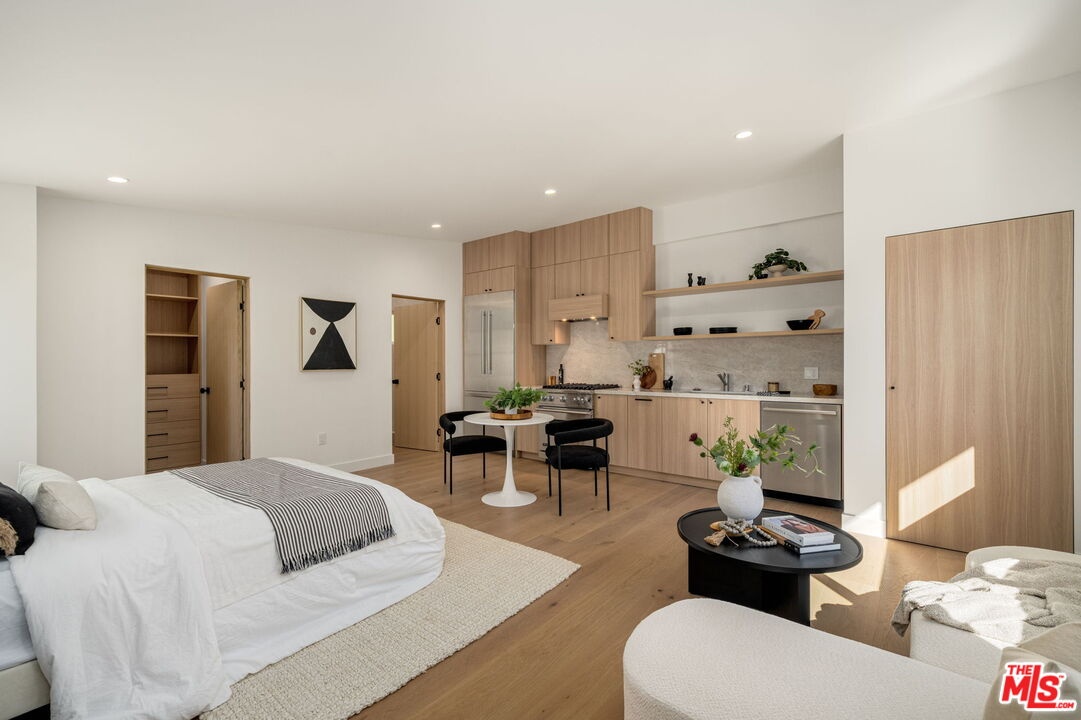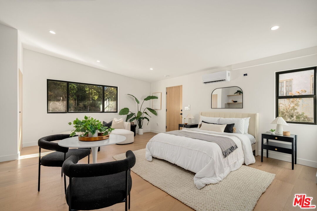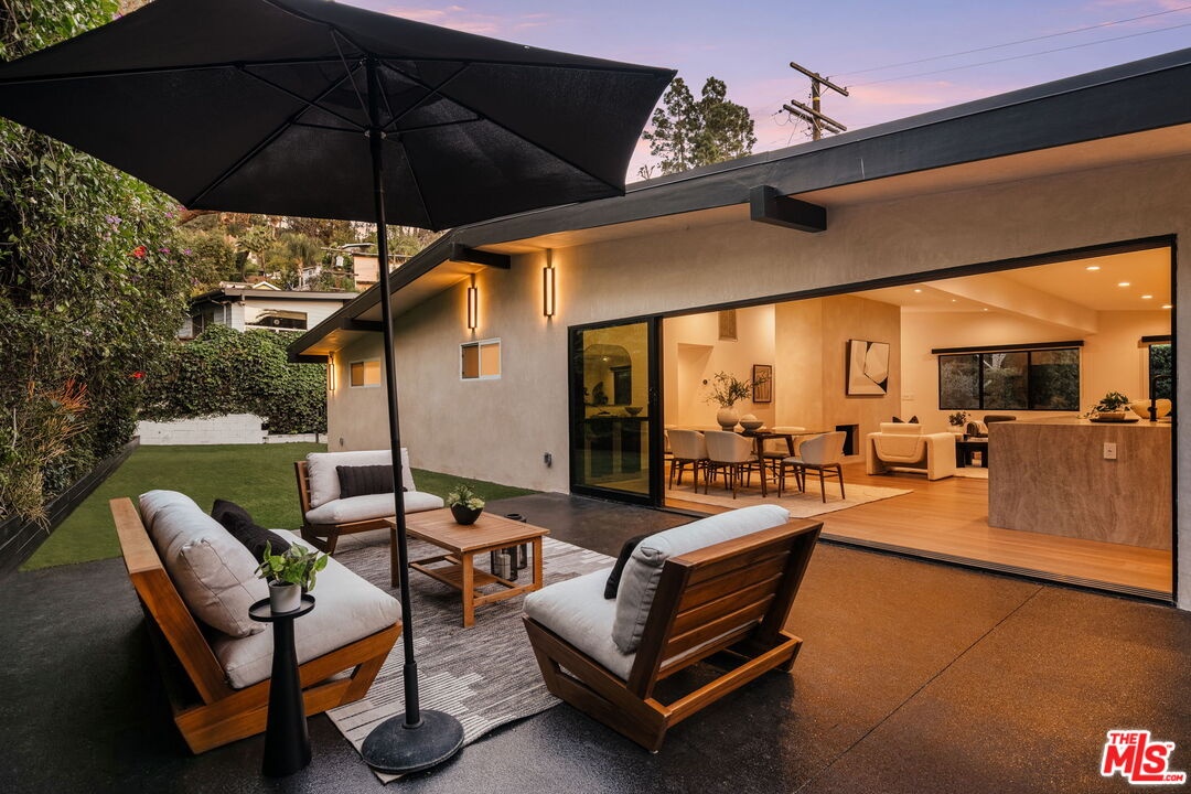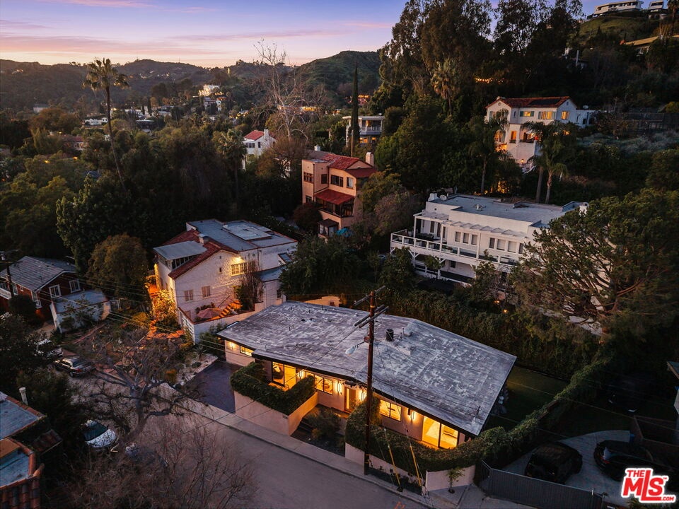 Introducing a rare ultra-luxury modern retreat in the Hollywood Hills, thoughtfully designed with no expense spared. This fully reimagined compound features a 2-bedroom, 2-bath main residence complemented by a separate, fully permitted 1-bedroom, 1-bath ADU offering exceptional privacy and versatility. Blending refined architecture, premium finishes, and seamless functionality, the property is designed for today's most discerning buyer. The main residence showcases meticulous craftsmanship throughout, highlighted by wide-plank Carrara hardwood flooring, hand-plastered detailing, and a dramatic plaster fireplace that anchors the living space. The designer kitchen serves as a true centerpiece, featuring custom cabinetry, an oversized island, honed Taj Mahal stone surfaces, and a full suite of high-end Thermador appliances, perfectly suited for both everyday living and elevated entertaining. Expansive sliding glass doors open on both sides of the space, creating effortless indoor-outdoor flow and an ideal setting for al fresco dining under the stars. Down the hall, spa-inspired bathrooms impress with custom plaster finishes, luxury stone countertops, and elevated hardware selections. Thoughtful details throughout the home include custom closets, surround sound, recessed lighting, and integrated climate features that enhance comfort and sophistication. The spacious primary suite offers a private outdoor retreat and a luxurious ensuite bathroom complete with a double vanity, a large walk-in shower with dual Axor shower heads, and a generously sized walk-in closet with custom lighting. The permitted 1-bedroom, 1-bath ADU features its own address and separate entrance delivers exceptional flexibility with a high-end kitchen, premium appliances, modern finishes that match the main residence, and a custom walk-in closet, making it ideal for rental income, guests, or a private office. Multiple outdoor spaces are designed for low-maintenance living and entertaining, featuring mature drought-tolerant landscaping, desert-inspired design elements, a sleek fire fit w a dedicated pre-plumbed gas line, an epoxy-finished concrete yard, and a large grassy area perfect for relaxation. Driveway with parking for three cars! Enhanced with modern security and smart entry features, this turnkey property offers luxury without compromise. A truly one-of-a-kind opportunity to own a private modern compound in the Hollywood Hills, offering exceptional quality, flexibility, income potential, and elevated Los Angeles living. This rare offering is not to be missed!