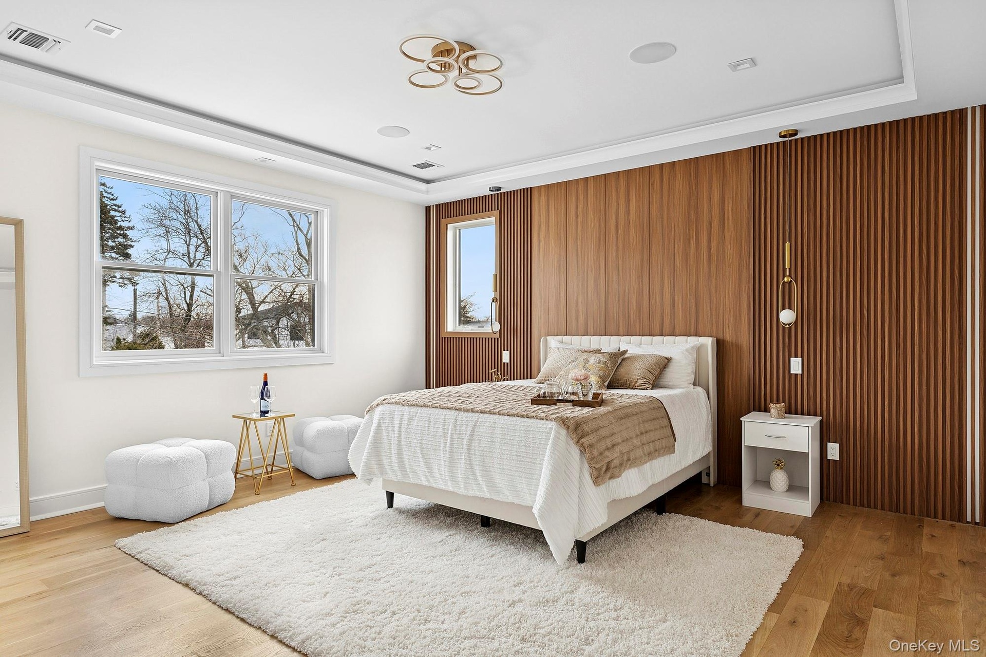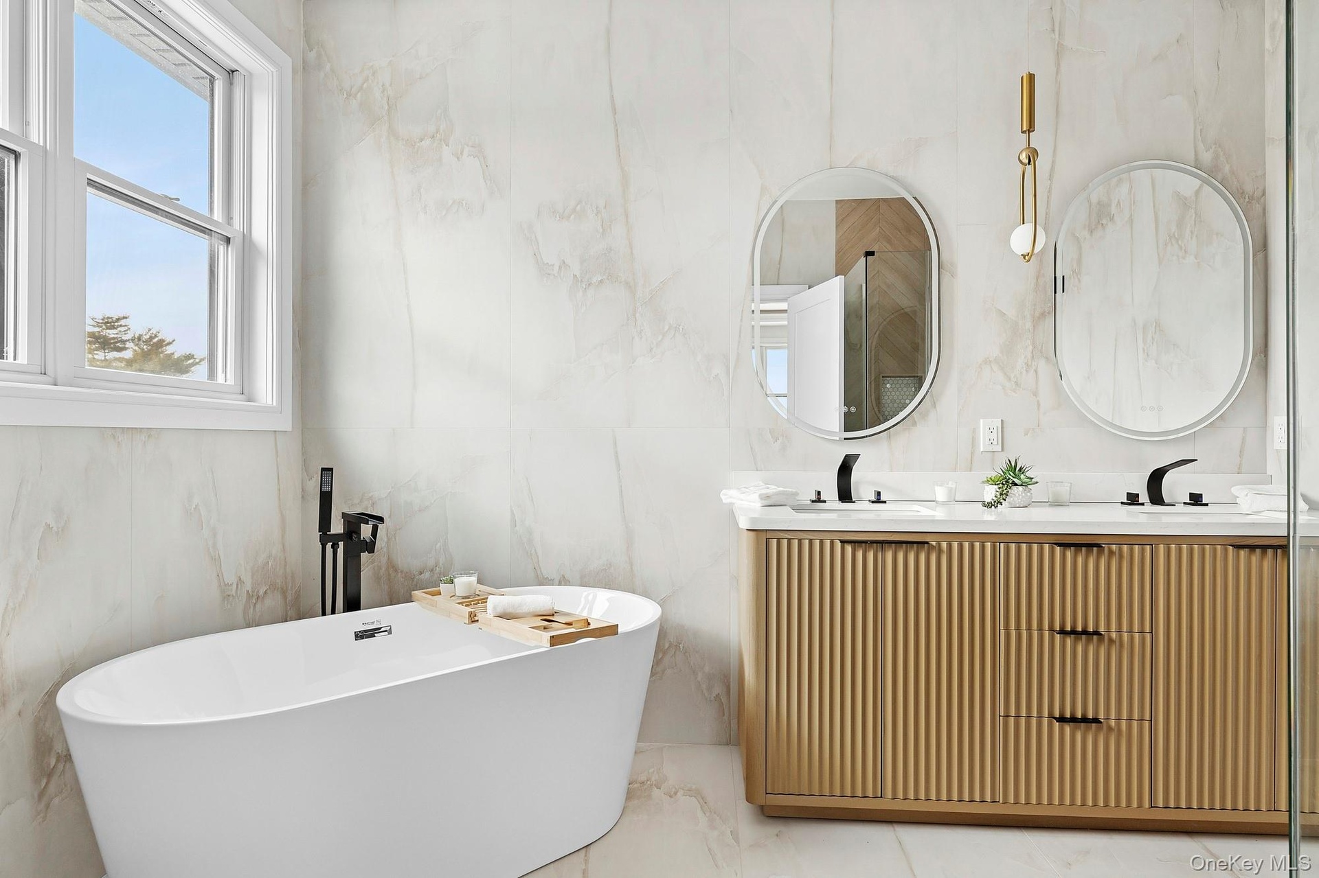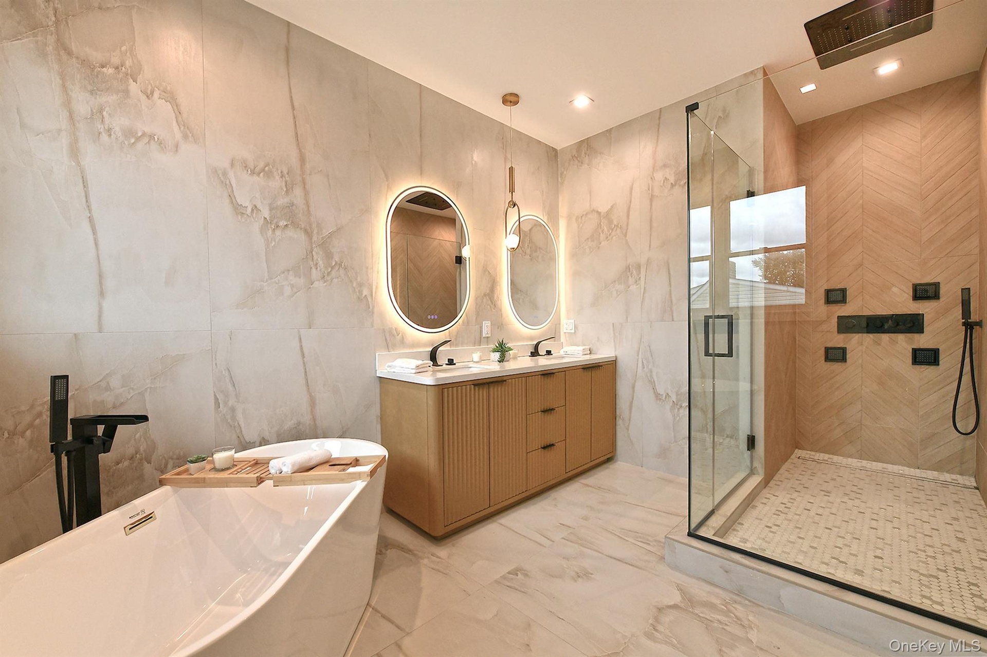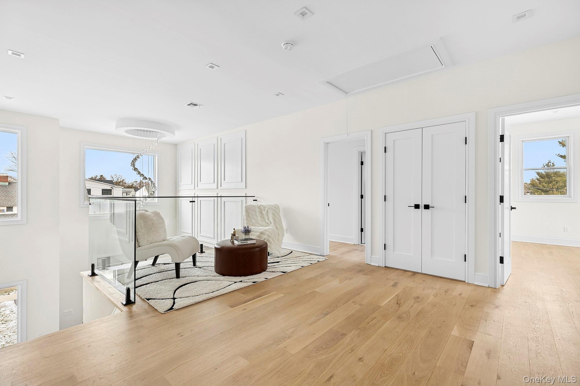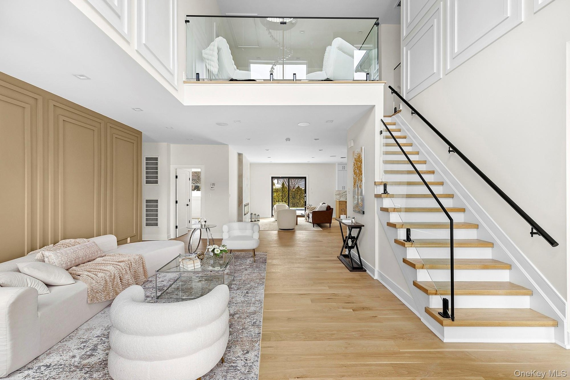 A modern staircase with custom glass railings leads to the second floor, where a large living area offers additional gathering space. the primary syuite is a true retreat, with custom wall treatments, pendent lighting, and a large walk in closet. The spa inspired primary bathroom features a freestanding soaking tub, double vanity, rainfall shower system,a sanctuary for relaxation. Three additional large bedroom suites, each with modern full bathrooms, completes tge upper level.