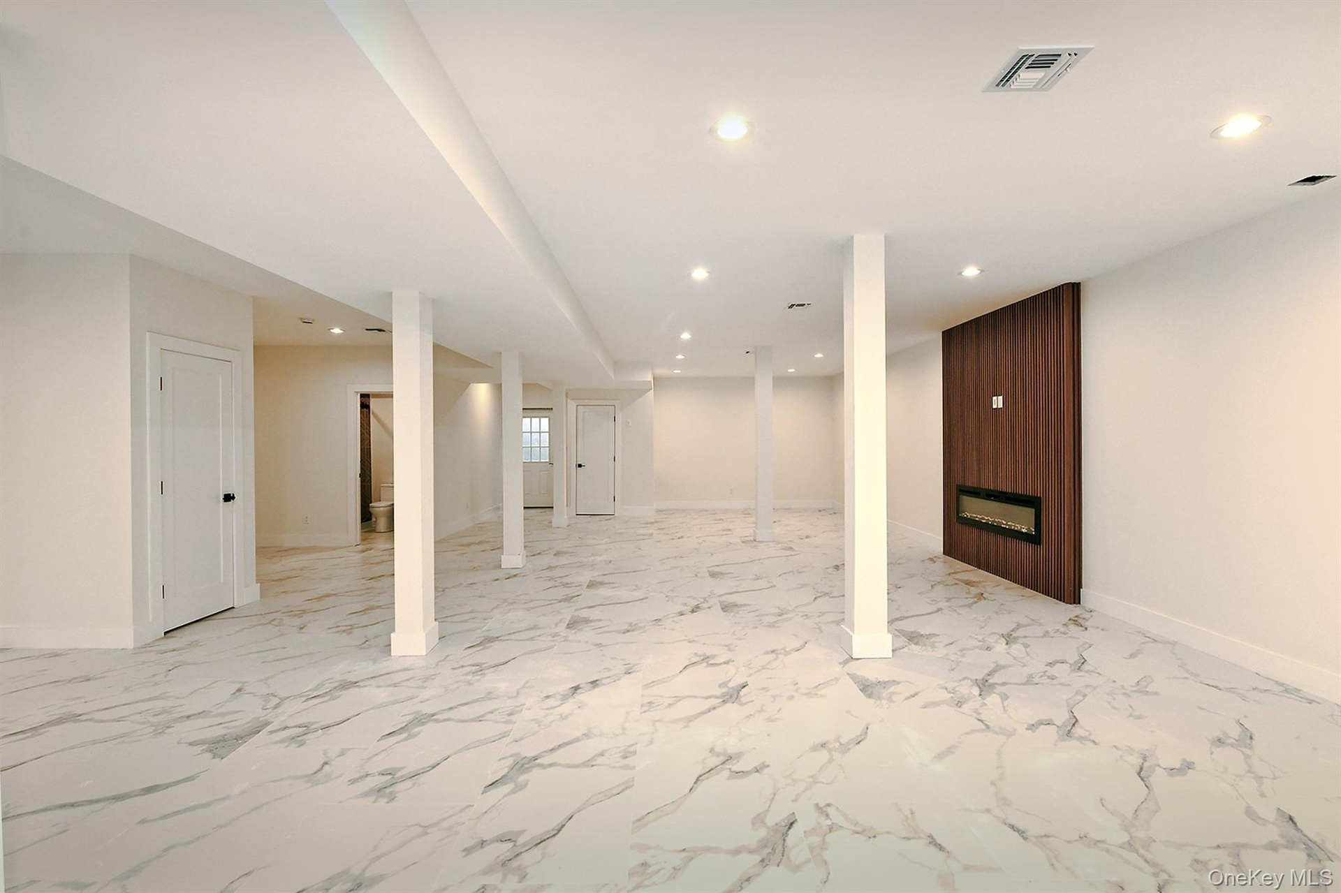 The fully finished basement with nine foot ceiling provides a generous living area with large windiws, and electric fireplace, and a full bathroom. There's ample space for a gym, home theater, or entertainment lounge, and the basement offers an outside entrance with direct access to the backyard.