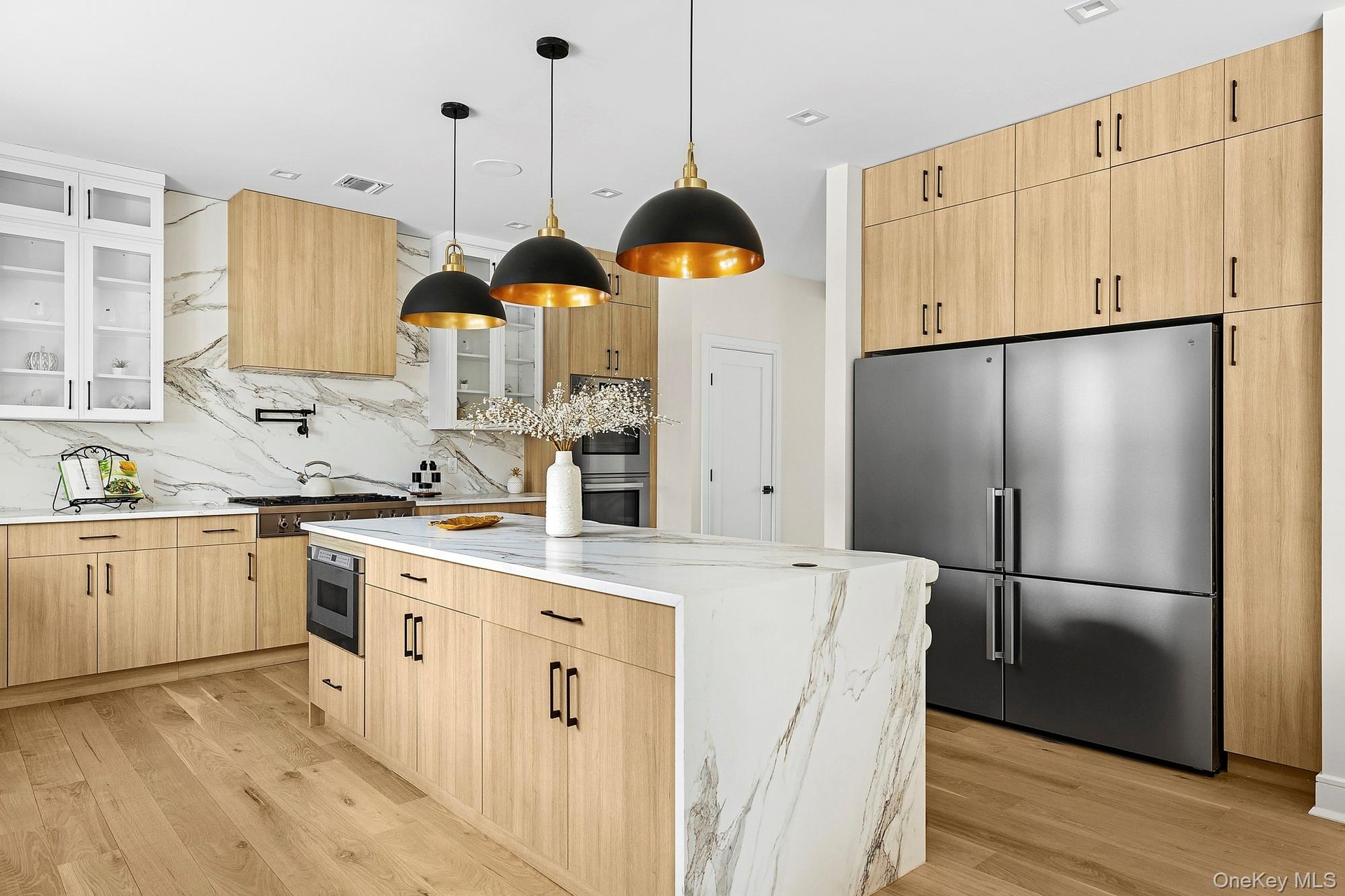 The chef's dream kitchen is outfitted with high end appliances, including oversized refrigerator and freezer, double wall oven, large island, two tone cabinetry, quartz countertops, and a designer backsplash, walk in custom pantry. The adjoining living room features electric fireplace, adding warmth and ambiance.