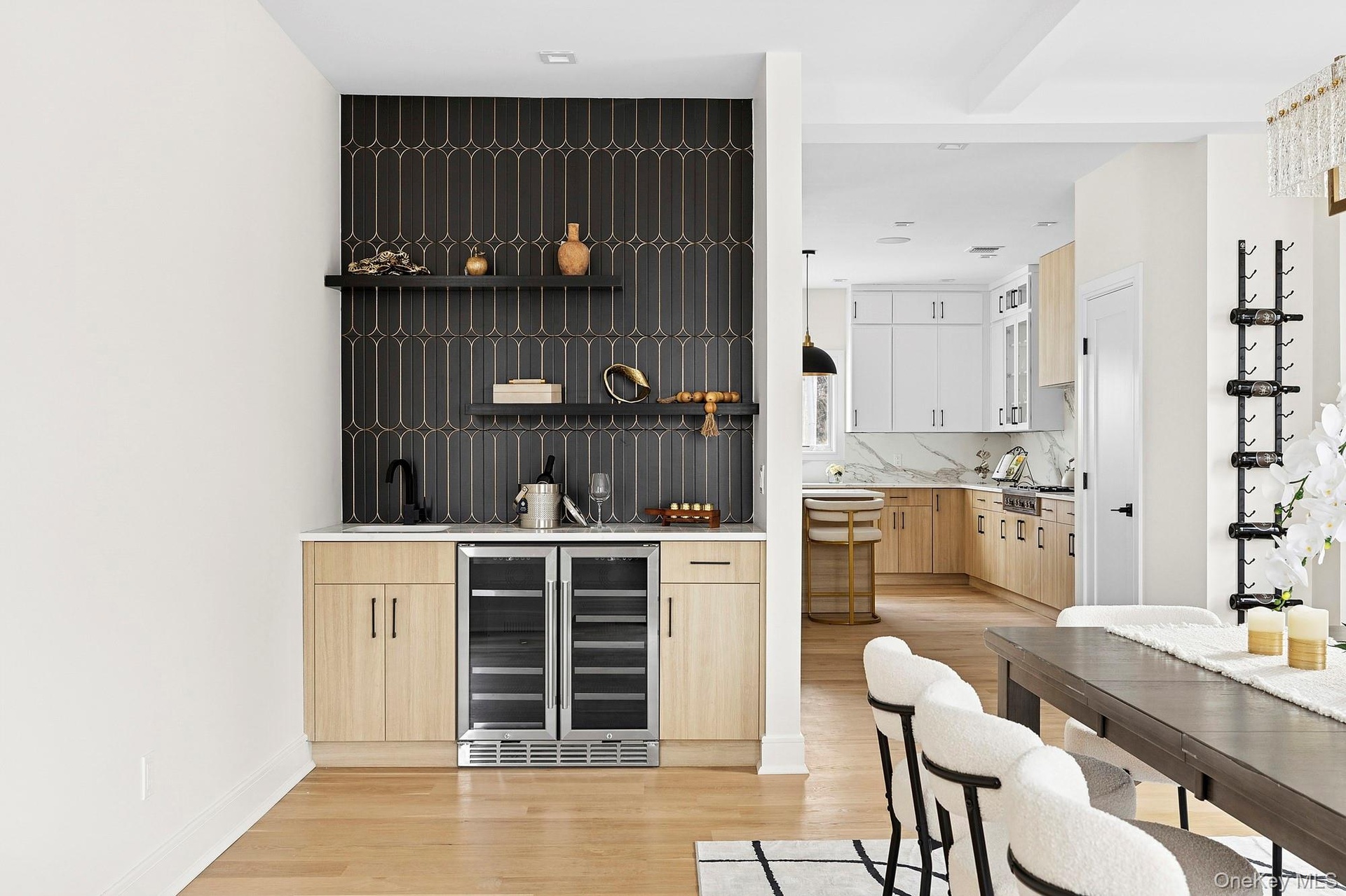 The Heart of home is a spacious living room with a custom accent wall, connected to an elegant oversized dining area with coffered ceiling and a built in wet bar featuring dual zone wine and beverage refrigerator and wine rack.