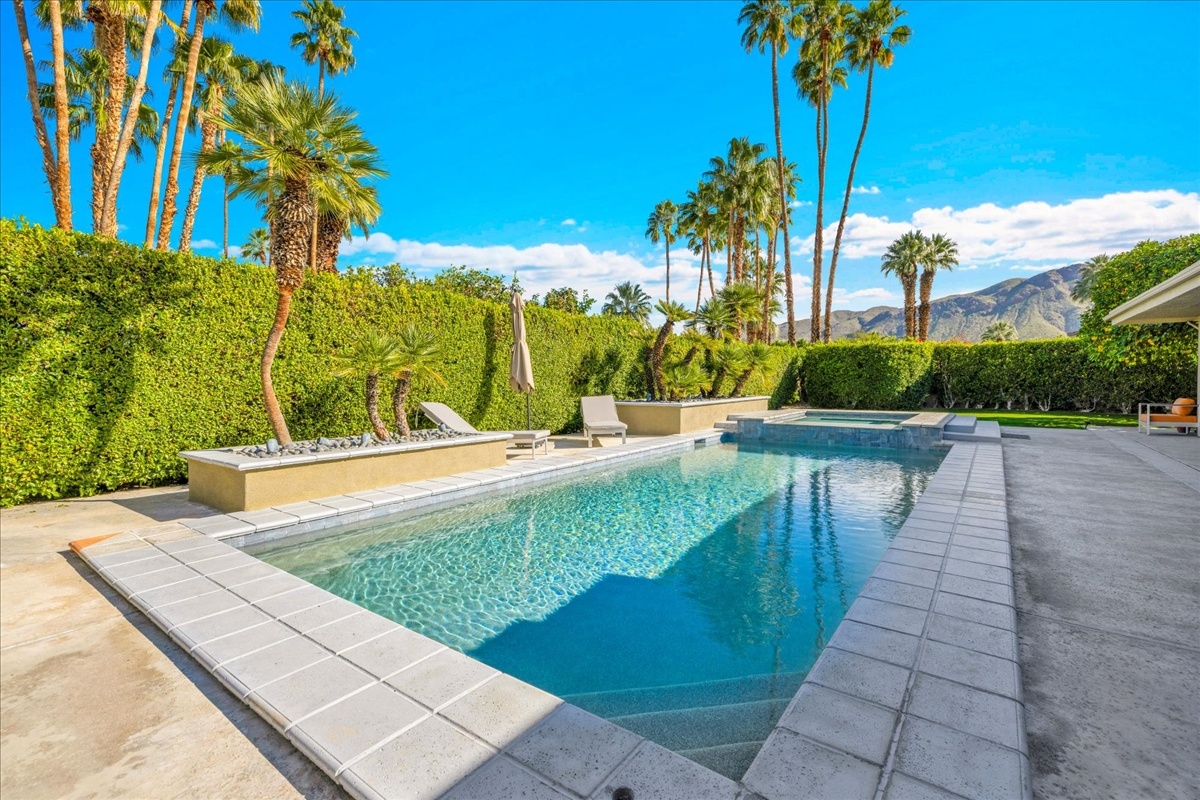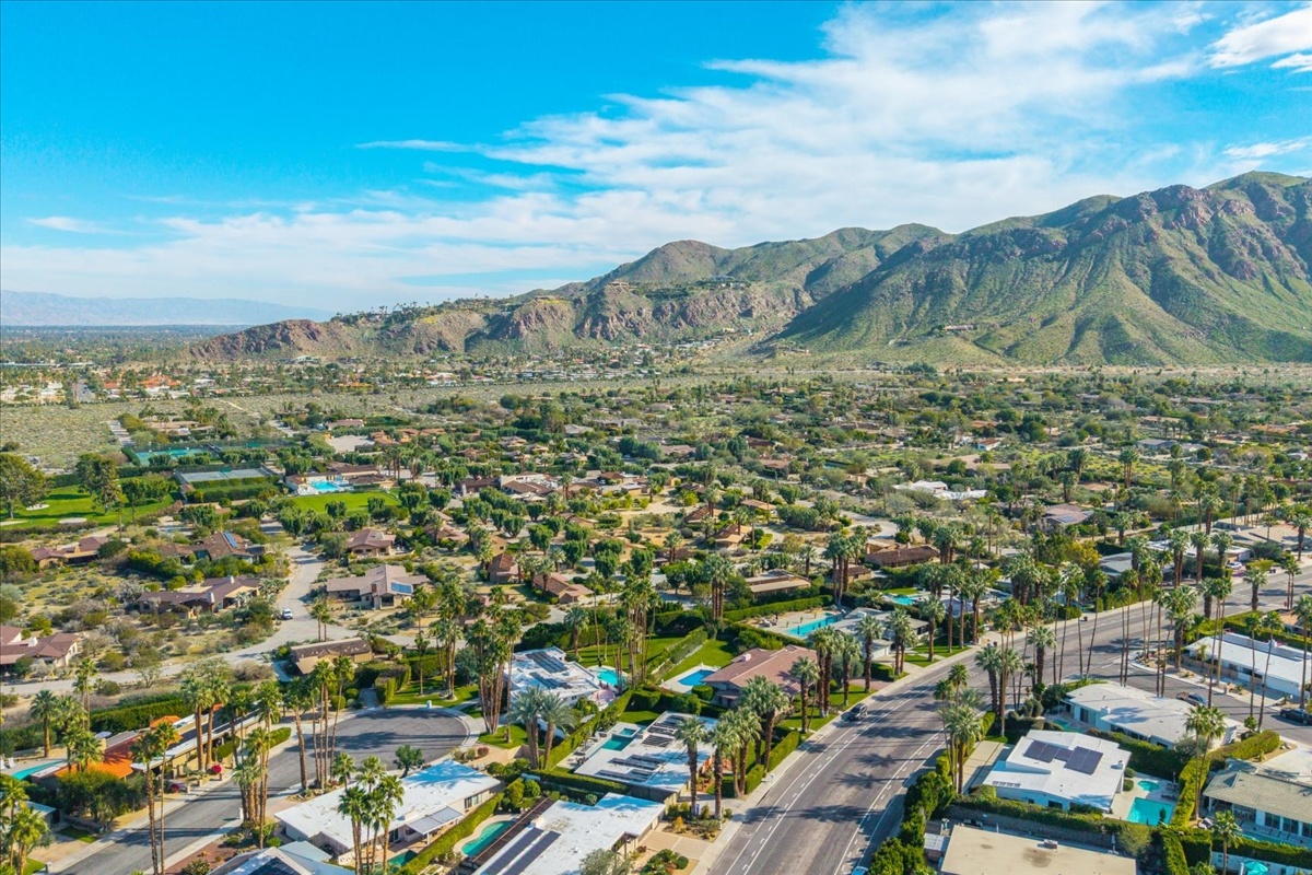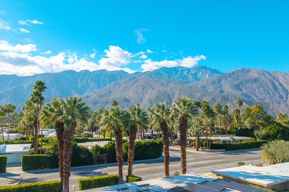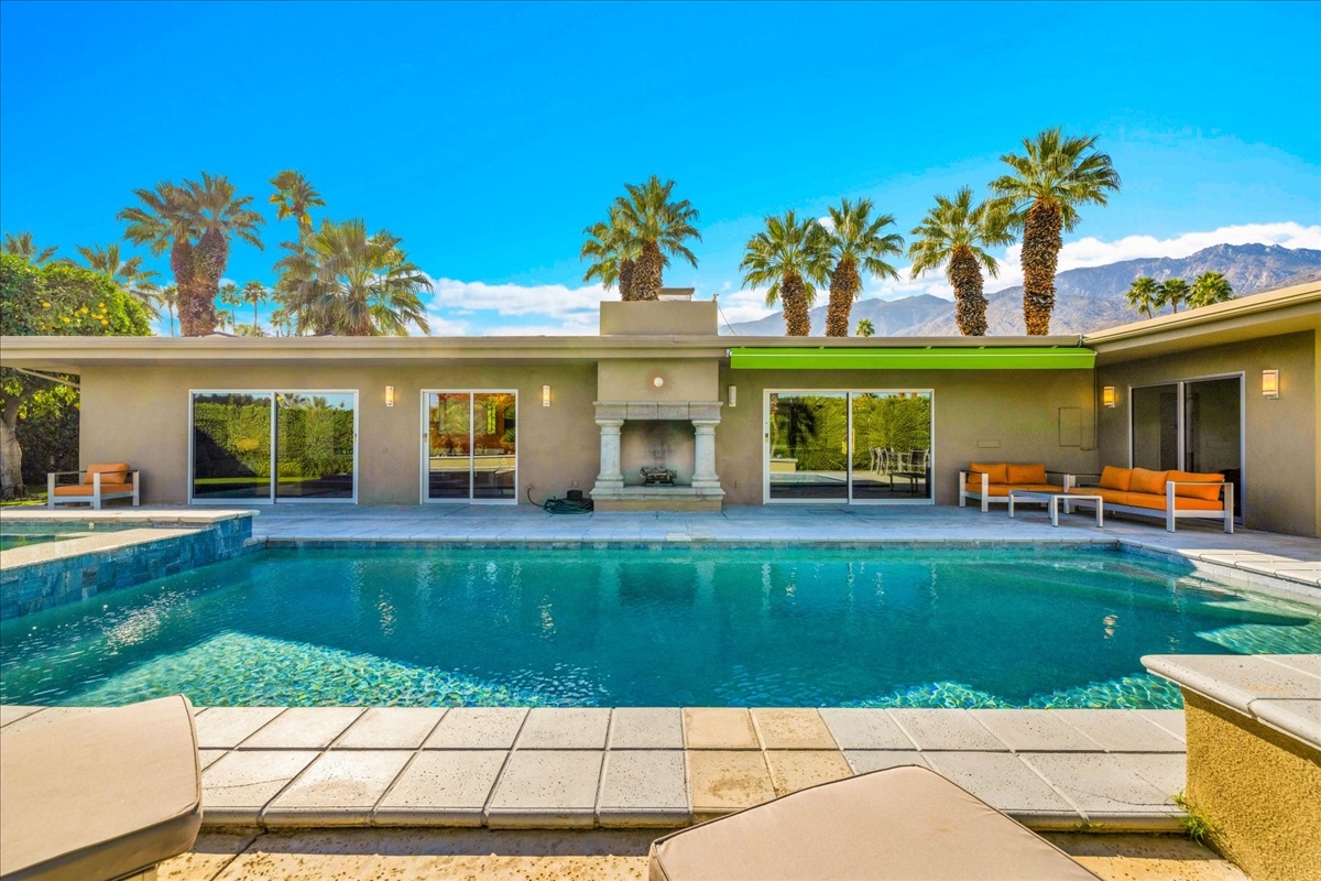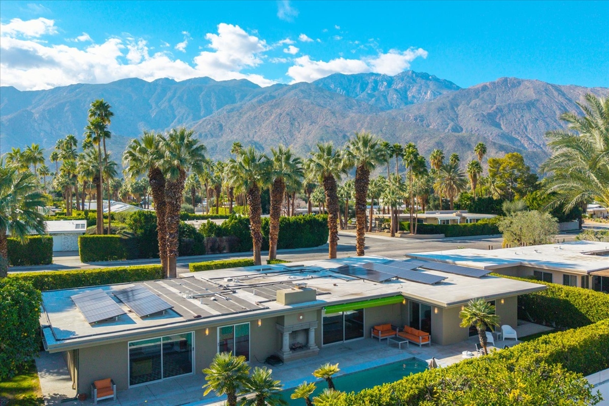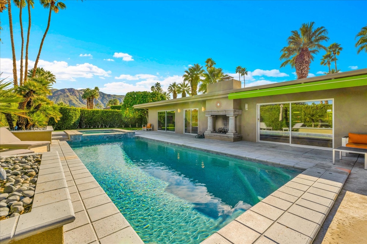 An authentic Mid-Century home invites you to embrace the lifestyle that only Palm Springs can offer. Set in the famous Indian Canyons neighborhood, this remodeled 4-bedroom, 3-bathroom residence sits on an oversized lot where you own the land and pay no HOA fees. Framed by breathtaking, unobstructed views of the San Jacinto Mountains, the backdrop feels straight out of a postcard. Designed for effortless desert living, the home blends iconic Mid-Century architecture with tasteful modern updates. The open-concept living and kitchen area is ideal for entertaining, where seamless indoor-outdoor living takes center stage. The newly remodeled chef's kitchen, featuring custom teak cabinetry, quartz countertops, stainless steel appliances, and a central island are perfect for morning coffee or sunset cocktails. Sleek flooring flows throughout, creating a cohesive and sophisticated aesthetic. Now with two primary suites that offers bright, inviting retreats, each with walk-in closets and direct access to the private yard. The vibrant renovated custom bathrooms make a statement with accent tiles, quartz vanities and backlit mirrors. Energy-efficient upgrades include paid solar panels, Fleetwood sliders, dual-pane windows, custom shades throughout, a Trane A/C , tankless water heater, and a new separate A/C system in the primary bedroom keeping comfort high and utility costs low. Step outside and let the sunshine bathe you in warmth as the sparkling pool and spa beckon. The private, serene yard is a true oasis, complete with fruit trees, multiple lounging areas, and the perfect setting for evening stargazing. Located in desirable South Palm Springs, away from the windy zone and in an active area, within walking distance to shops, dining, and hiking trails. This is the home you have been dreaming of.