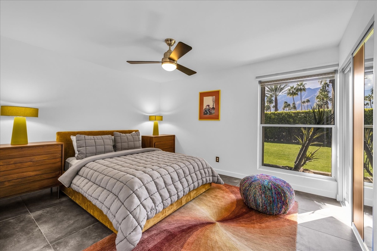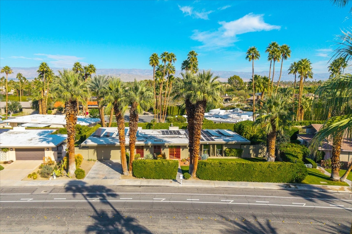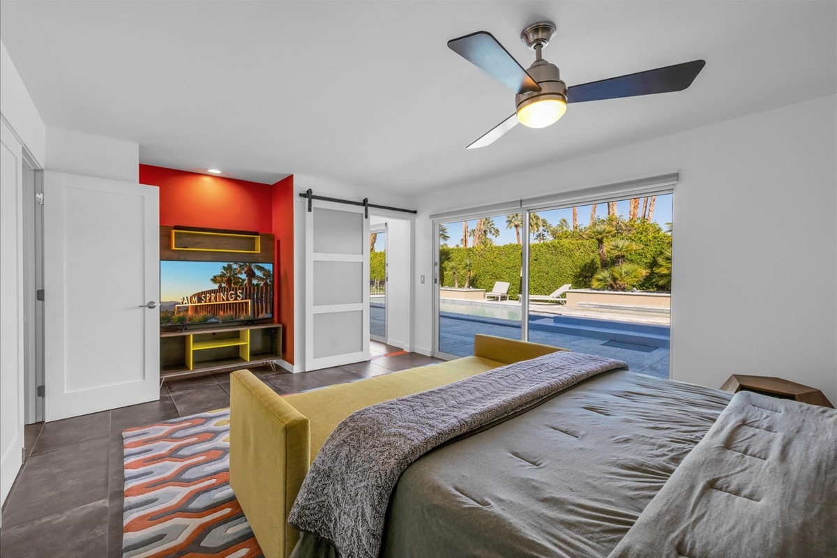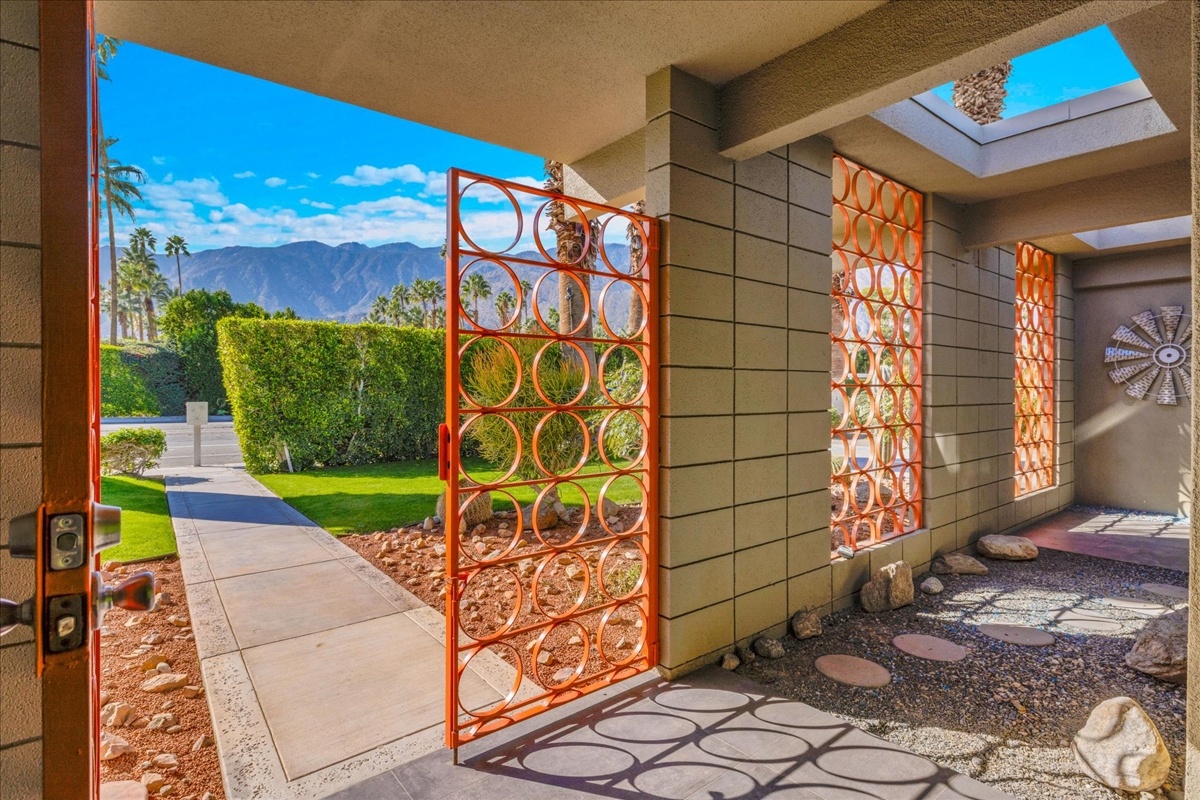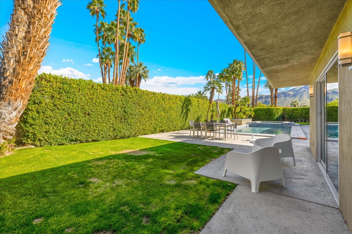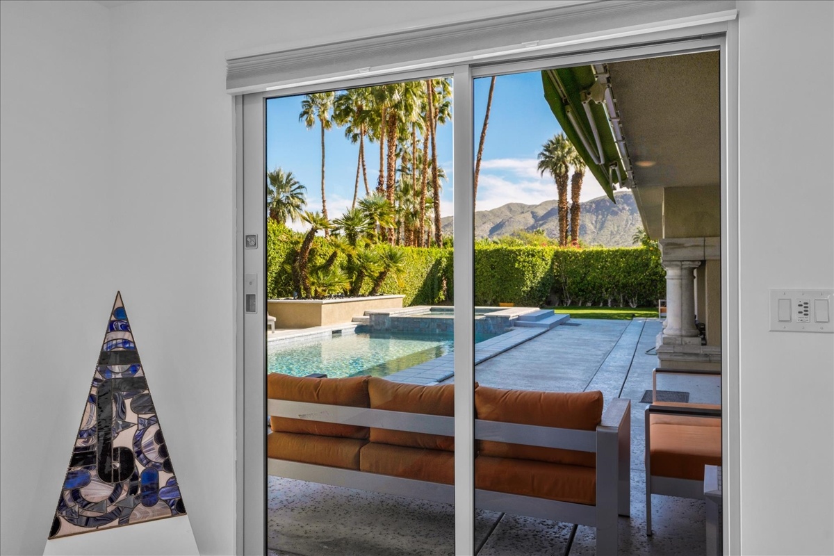 An authentic Mid-Century home invites you to embrace the lifestyle that only Palm Springs can offer. Set in the famous Indian Canyons neighborhood, this remodeled 4-bedroom, 3-bathroom residence sits on an oversized lot where you own the land and pay no HOA fees. Framed by breathtaking, unobstructed views of the San Jacinto Mountains, the backdrop feels straight out of a postcard. Designed for effortless desert living, the home blends iconic Mid-Century architecture with tasteful modern updates. The open-concept living and kitchen area is ideal for entertaining, where seamless indoor-outdoor living takes center stage. The newly remodeled chef's kitchen, featuring custom teak cabinetry, quartz countertops, stainless steel appliances, and a central island are perfect for morning coffee or sunset cocktails. Sleek flooring flows throughout, creating a cohesive and sophisticated aesthetic. Now with two primary suites that offers bright, inviting retreats, each with walk-in closets and direct access to the private yard. The vibrant renovated custom bathrooms make a statement with accent tiles, quartz vanities and backlit mirrors. Energy-efficient upgrades include paid solar panels, Fleetwood sliders, dual-pane windows, custom shades throughout, a Trane A/C , tankless water heater, and a new separate A/C system in the primary bedroom keeping comfort high and utility costs low. Step outside and let the sunshine bathe you in warmth as the sparkling pool and spa beckon. The private, serene yard is a true oasis, complete with fruit trees, multiple lounging areas, and the perfect setting for evening stargazing. Located in desirable South Palm Springs, away from the windy zone and in an active area, within walking distance to shops, dining, and hiking trails. This is the home you have been dreaming of.