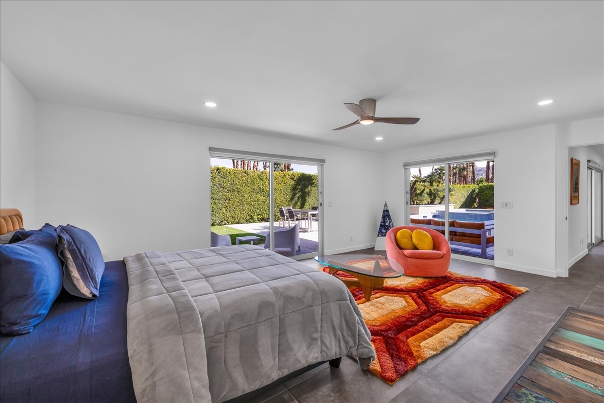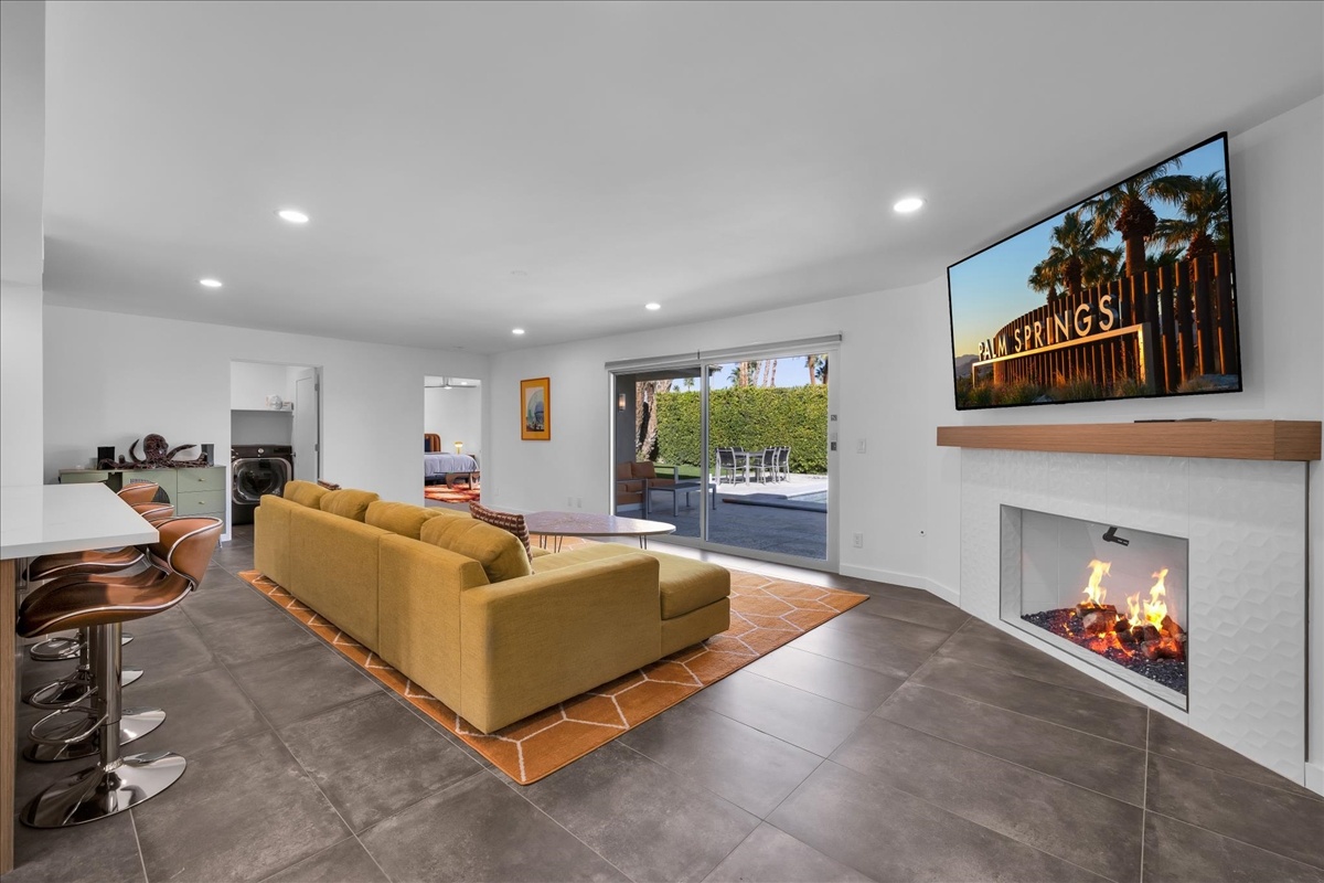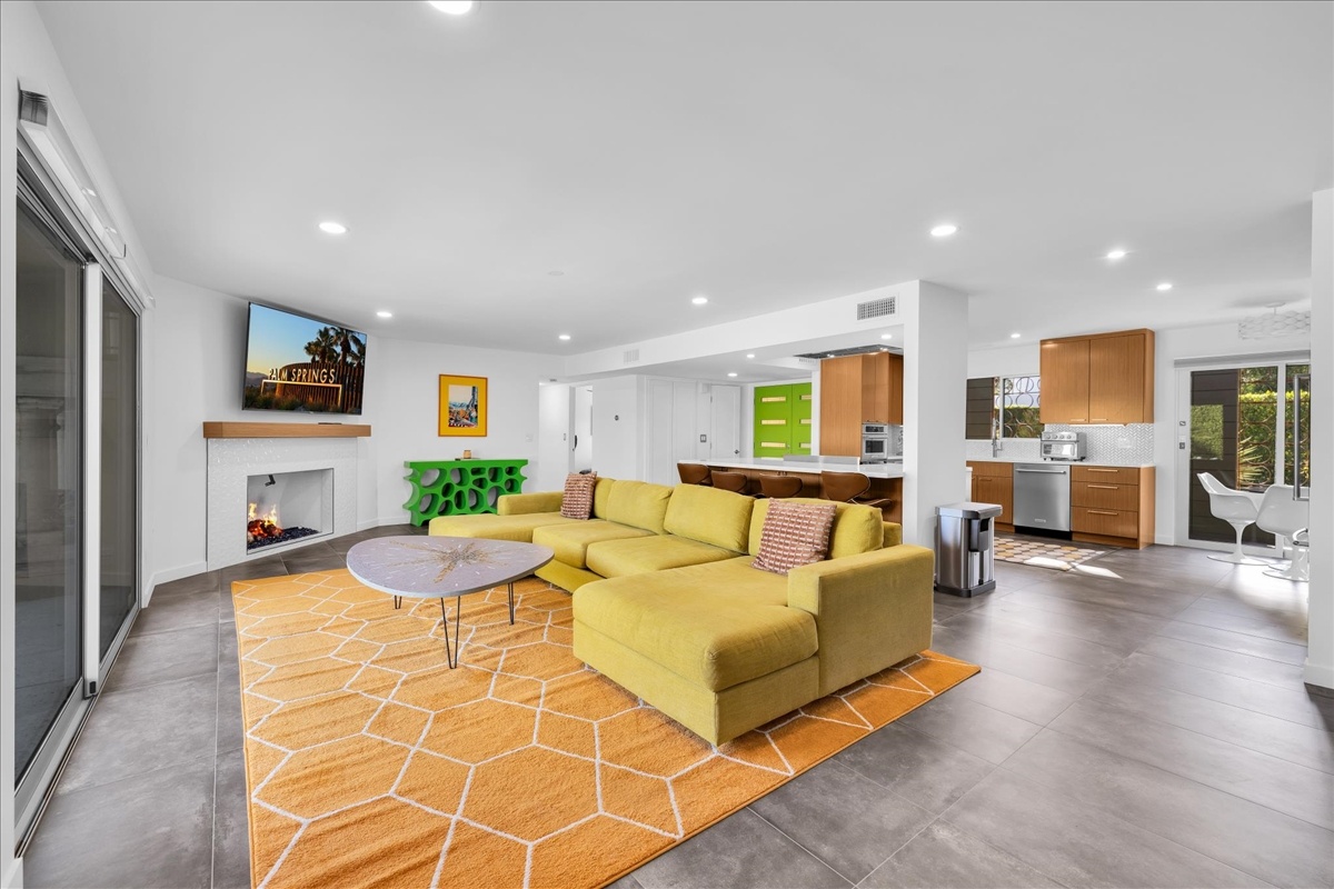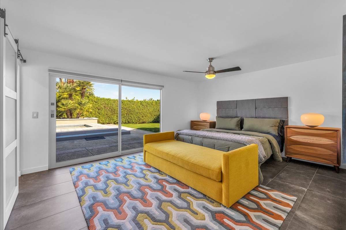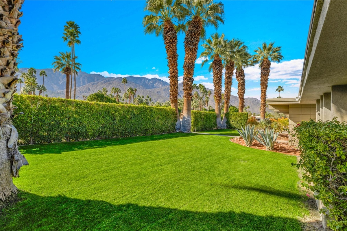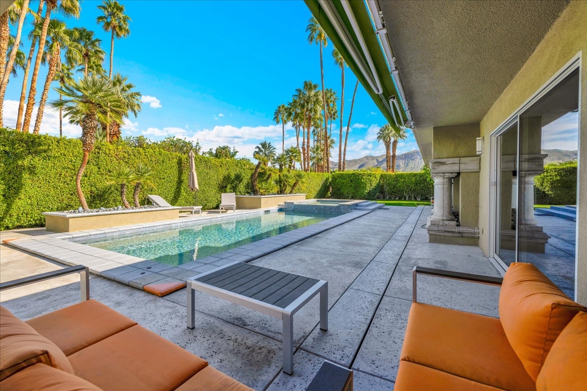 An authentic Mid-Century home invites you to embrace the lifestyle that only Palm Springs can offer. Set in the famous Indian Canyons neighborhood, this remodeled 4-bedroom, 3-bathroom residence sits on an oversized lot where you own the land and pay no HOA fees. Framed by breathtaking, unobstructed views of the San Jacinto Mountains, the backdrop feels straight out of a postcard. Designed for effortless desert living, the home blends iconic Mid-Century architecture with tasteful modern updates. The open-concept living and kitchen area is ideal for entertaining, where seamless indoor-outdoor living takes center stage. The newly remodeled chef's kitchen, featuring custom teak cabinetry, quartz countertops, stainless steel appliances, and a central island are perfect for morning coffee or sunset cocktails. Sleek flooring flows throughout, creating a cohesive and sophisticated aesthetic. Now with two primary suites that offers bright, inviting retreats, each with walk-in closets and direct access to the private yard. The vibrant renovated custom bathrooms make a statement with accent tiles, quartz vanities and backlit mirrors. Energy-efficient upgrades include paid solar panels, Fleetwood sliders, dual-pane windows, custom shades throughout, a Trane A/C , tankless water heater, and a new separate A/C system in the primary bedroom keeping comfort high and utility costs low. Step outside and let the sunshine bathe you in warmth as the sparkling pool and spa beckon. The private, serene yard is a true oasis, complete with fruit trees, multiple lounging areas, and the perfect setting for evening stargazing. Located in desirable South Palm Springs, away from the windy zone and in an active area, within walking distance to shops, dining, and hiking trails. This is the home you have been dreaming of.