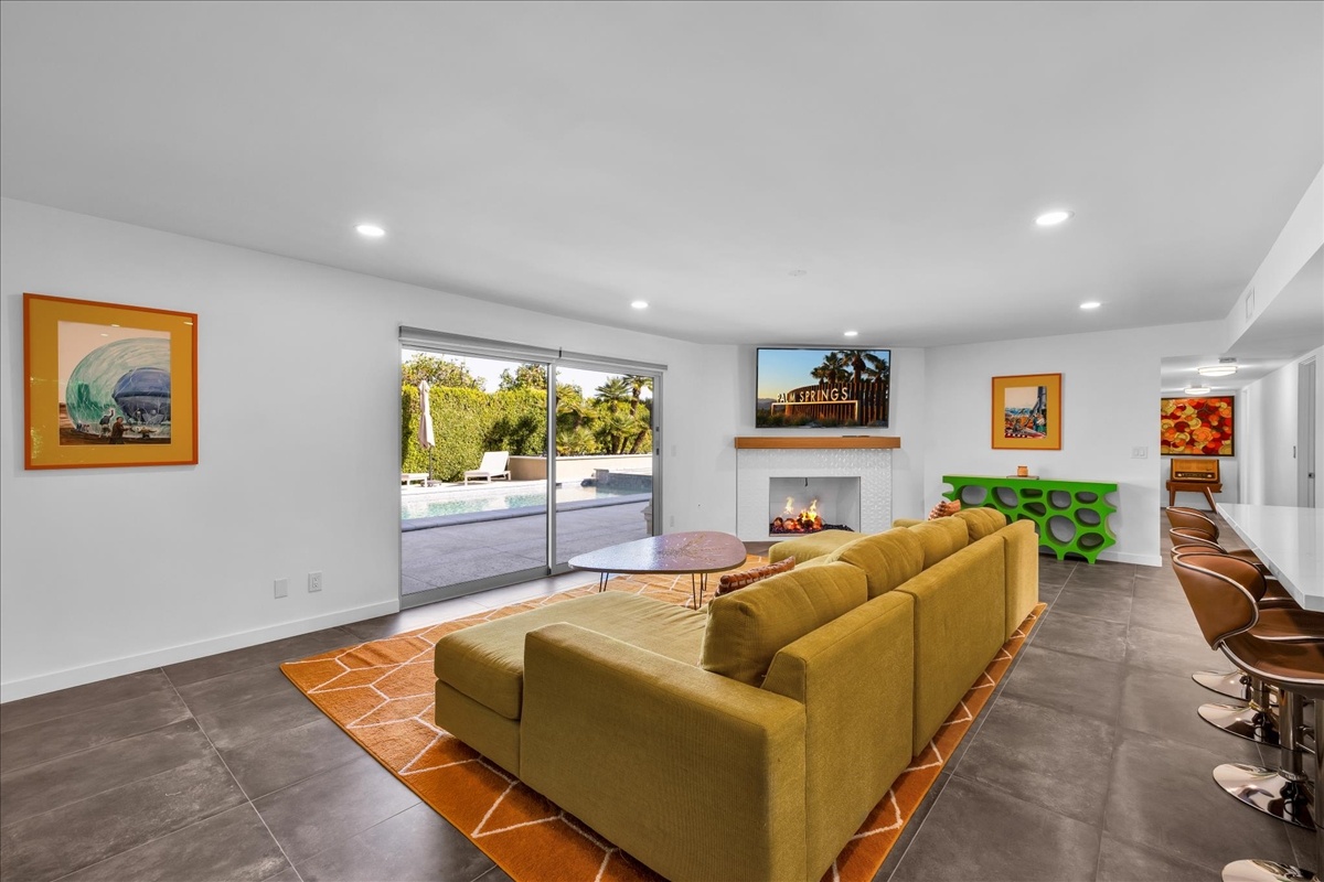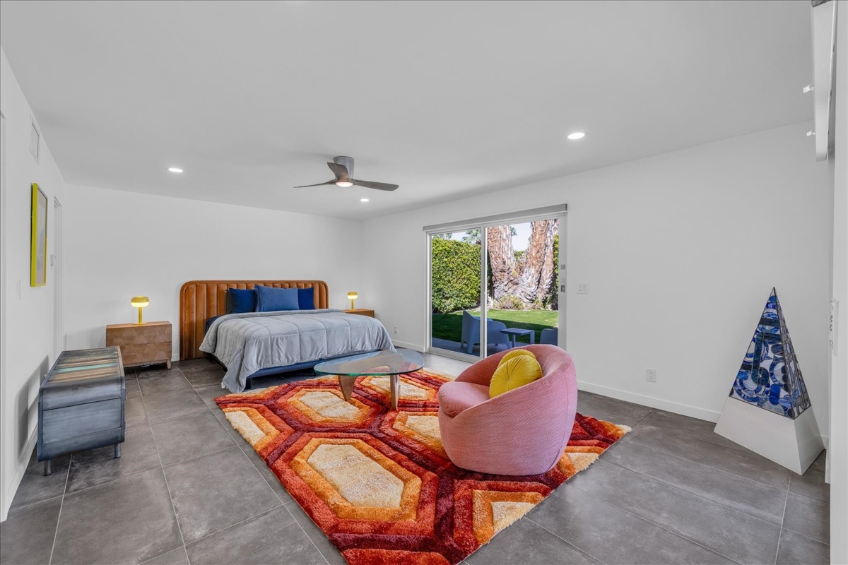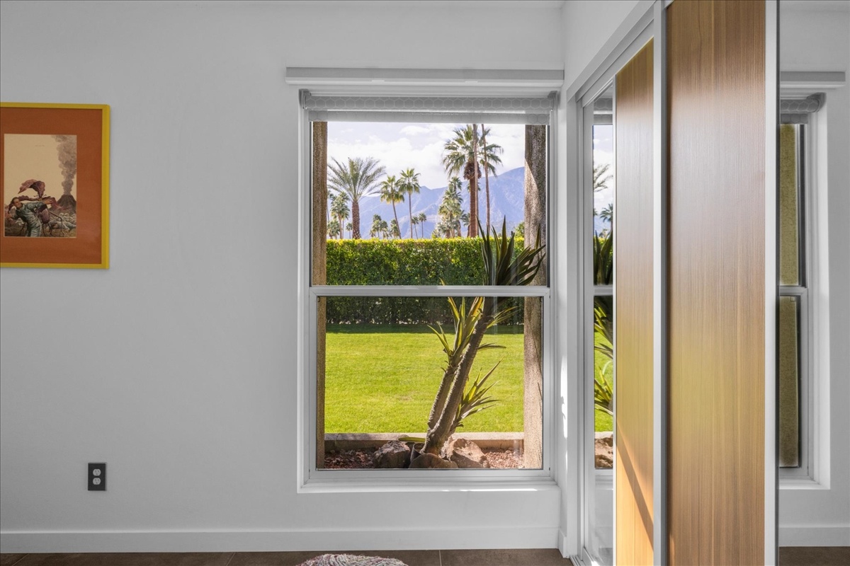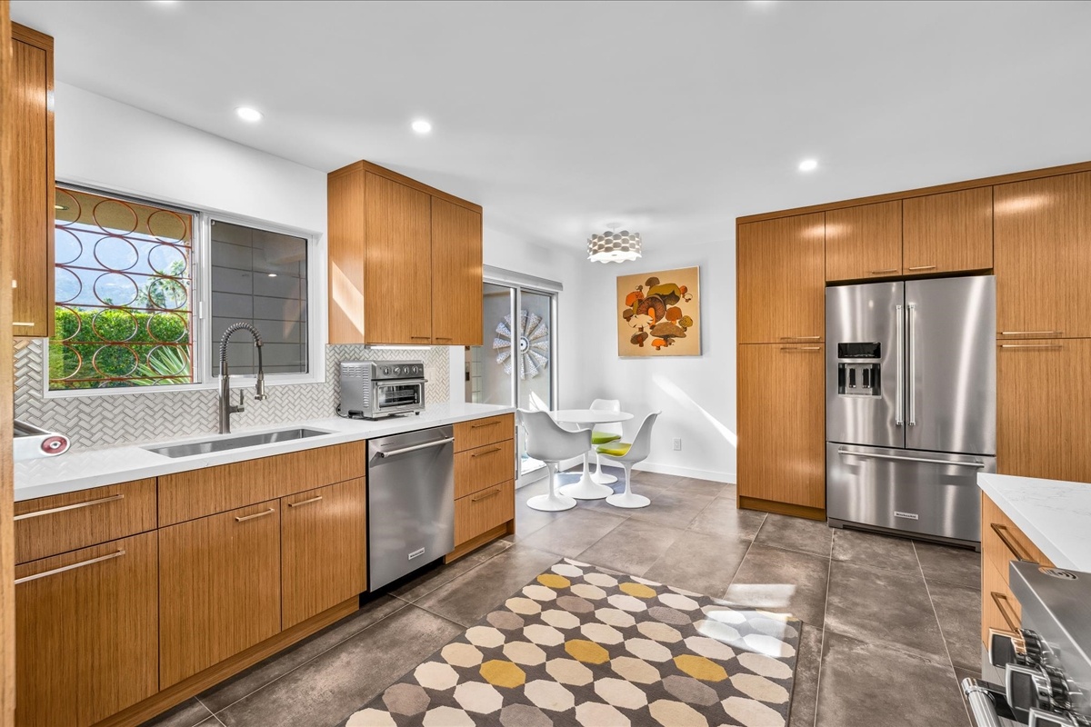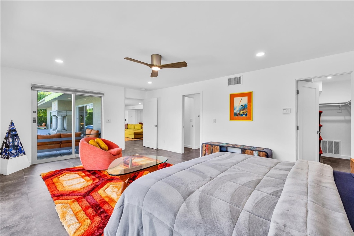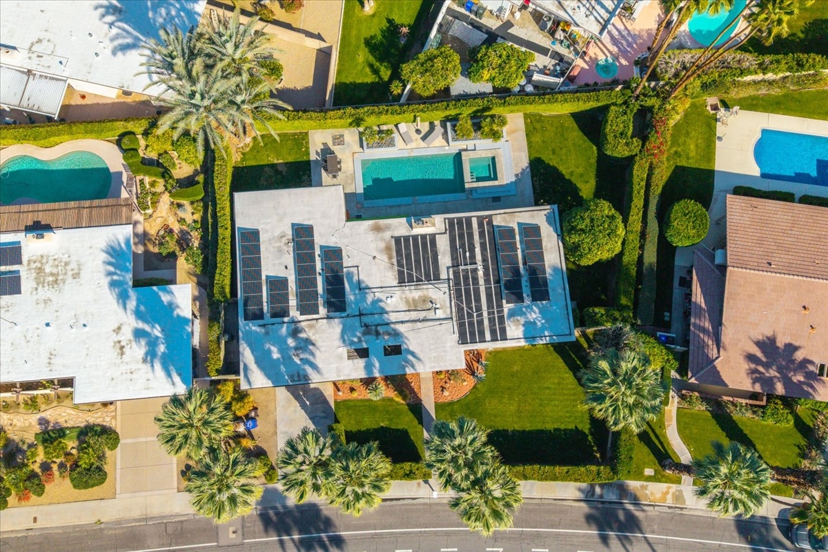 An authentic Mid-Century home invites you to embrace the lifestyle that only Palm Springs can offer. Set in the famous Indian Canyons neighborhood, this remodeled 4-bedroom, 3-bathroom residence sits on an oversized lot where you own the land and pay no HOA fees. Framed by breathtaking, unobstructed views of the San Jacinto Mountains, the backdrop feels straight out of a postcard. Designed for effortless desert living, the home blends iconic Mid-Century architecture with tasteful modern updates. The open-concept living and kitchen area is ideal for entertaining, where seamless indoor-outdoor living takes center stage. The newly remodeled chef's kitchen, featuring custom teak cabinetry, quartz countertops, stainless steel appliances, and a central island are perfect for morning coffee or sunset cocktails. Sleek flooring flows throughout, creating a cohesive and sophisticated aesthetic. Now with two primary suites that offers bright, inviting retreats, each with walk-in closets and direct access to the private yard. The vibrant renovated custom bathrooms make a statement with accent tiles, quartz vanities and backlit mirrors. Energy-efficient upgrades include paid solar panels, Fleetwood sliders, dual-pane windows, custom shades throughout, a Trane A/C , tankless water heater, and a new separate A/C system in the primary bedroom keeping comfort high and utility costs low. Step outside and let the sunshine bathe you in warmth as the sparkling pool and spa beckon. The private, serene yard is a true oasis, complete with fruit trees, multiple lounging areas, and the perfect setting for evening stargazing. Located in desirable South Palm Springs, away from the windy zone and in an active area, within walking distance to shops, dining, and hiking trails. This is the home you have been dreaming of.