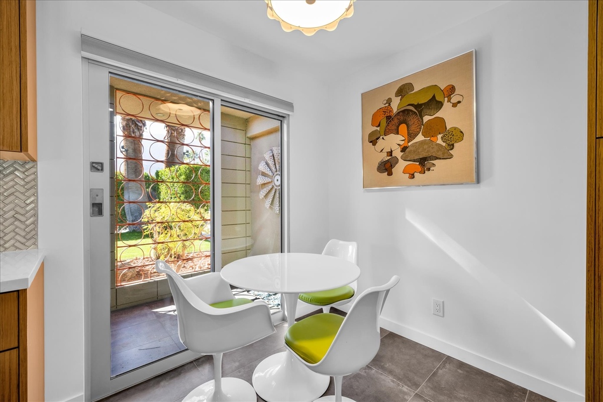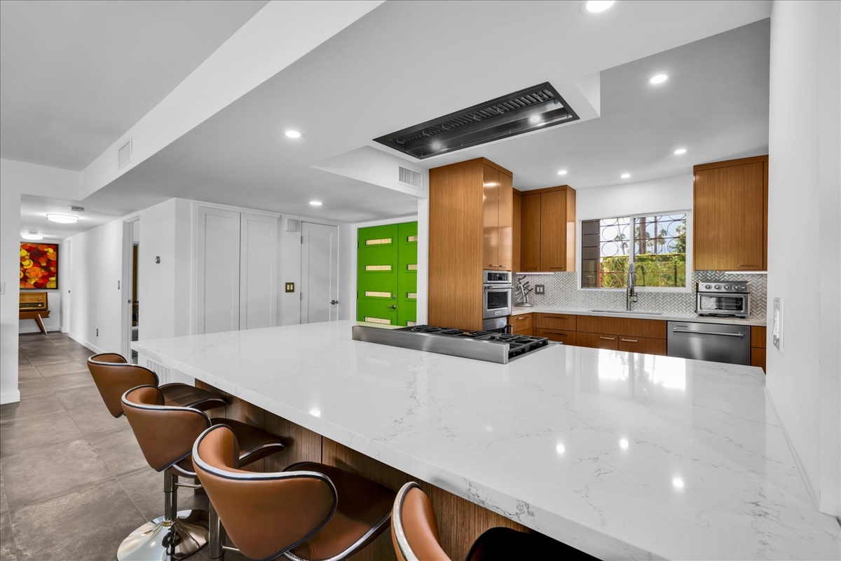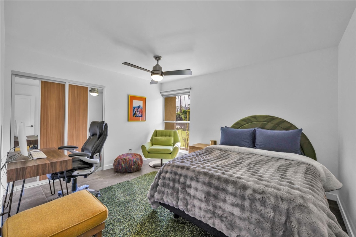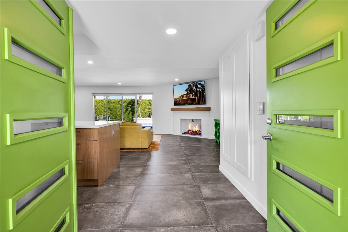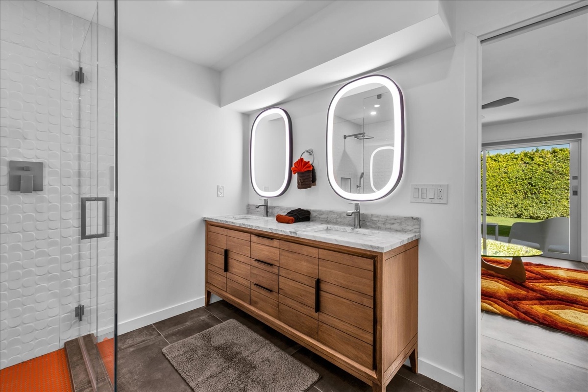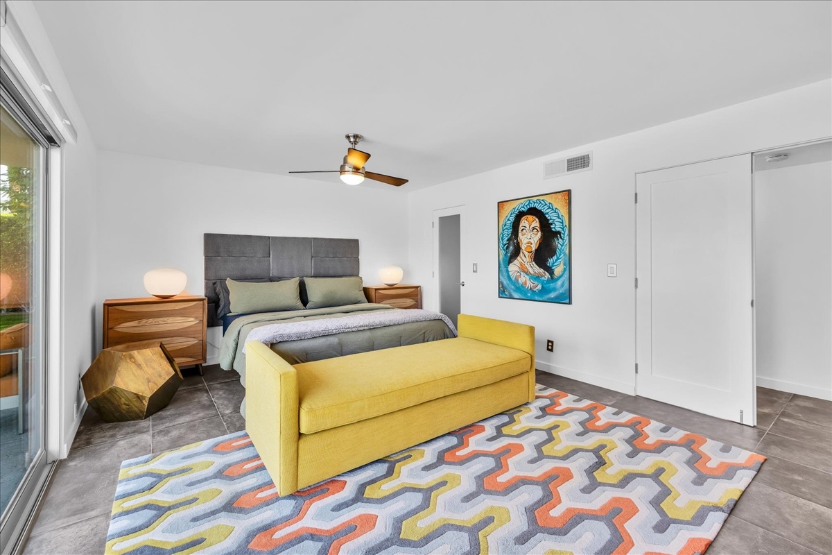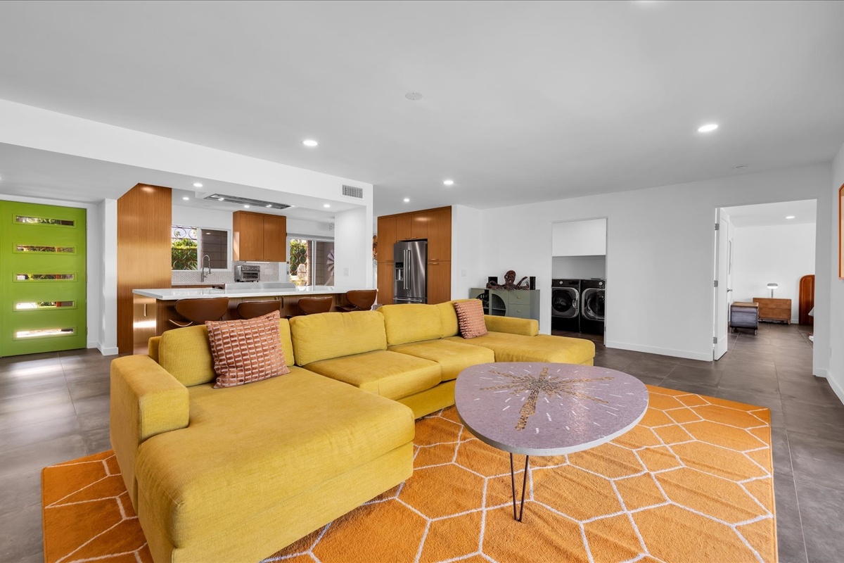 An authentic Mid-Century home invites you to embrace the lifestyle that only Palm Springs can offer. Set in the famous Indian Canyons neighborhood, this remodeled 4-bedroom, 3-bathroom residence sits on an oversized lot where you own the land and pay no HOA fees. Framed by breathtaking, unobstructed views of the San Jacinto Mountains, the backdrop feels straight out of a postcard. Designed for effortless desert living, the home blends iconic Mid-Century architecture with tasteful modern updates. The open-concept living and kitchen area is ideal for entertaining, where seamless indoor-outdoor living takes center stage. The newly remodeled chef's kitchen, featuring custom teak cabinetry, quartz countertops, stainless steel appliances, and a central island are perfect for morning coffee or sunset cocktails. Sleek flooring flows throughout, creating a cohesive and sophisticated aesthetic. Now with two primary suites that offers bright, inviting retreats, each with walk-in closets and direct access to the private yard. The vibrant renovated custom bathrooms make a statement with accent tiles, quartz vanities and backlit mirrors. Energy-efficient upgrades include paid solar panels, Fleetwood sliders, dual-pane windows, custom shades throughout, a Trane A/C , tankless water heater, and a new separate A/C system in the primary bedroom keeping comfort high and utility costs low. Step outside and let the sunshine bathe you in warmth as the sparkling pool and spa beckon. The private, serene yard is a true oasis, complete with fruit trees, multiple lounging areas, and the perfect setting for evening stargazing. Located in desirable South Palm Springs, away from the windy zone and in an active area, within walking distance to shops, dining, and hiking trails. This is the home you have been dreaming of.