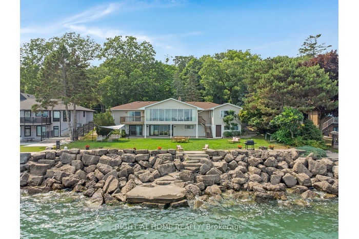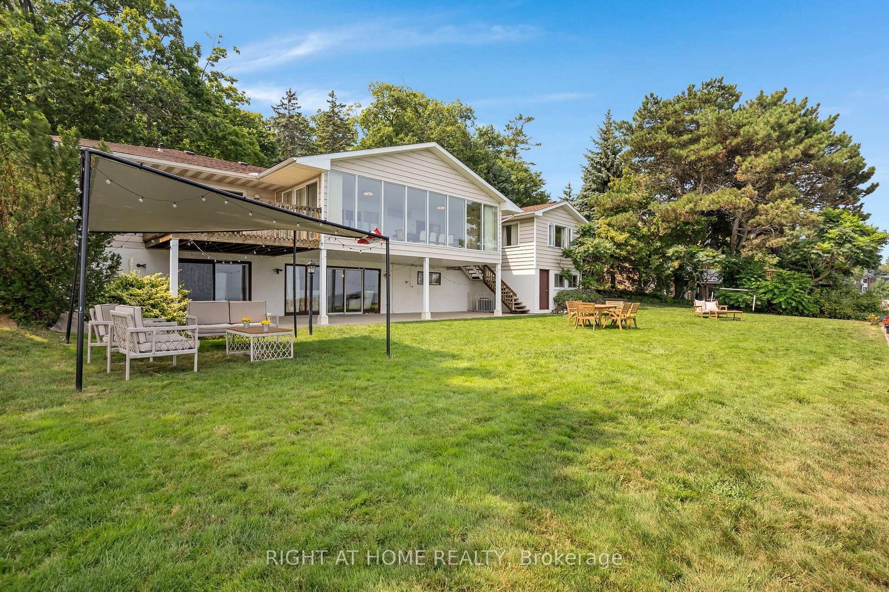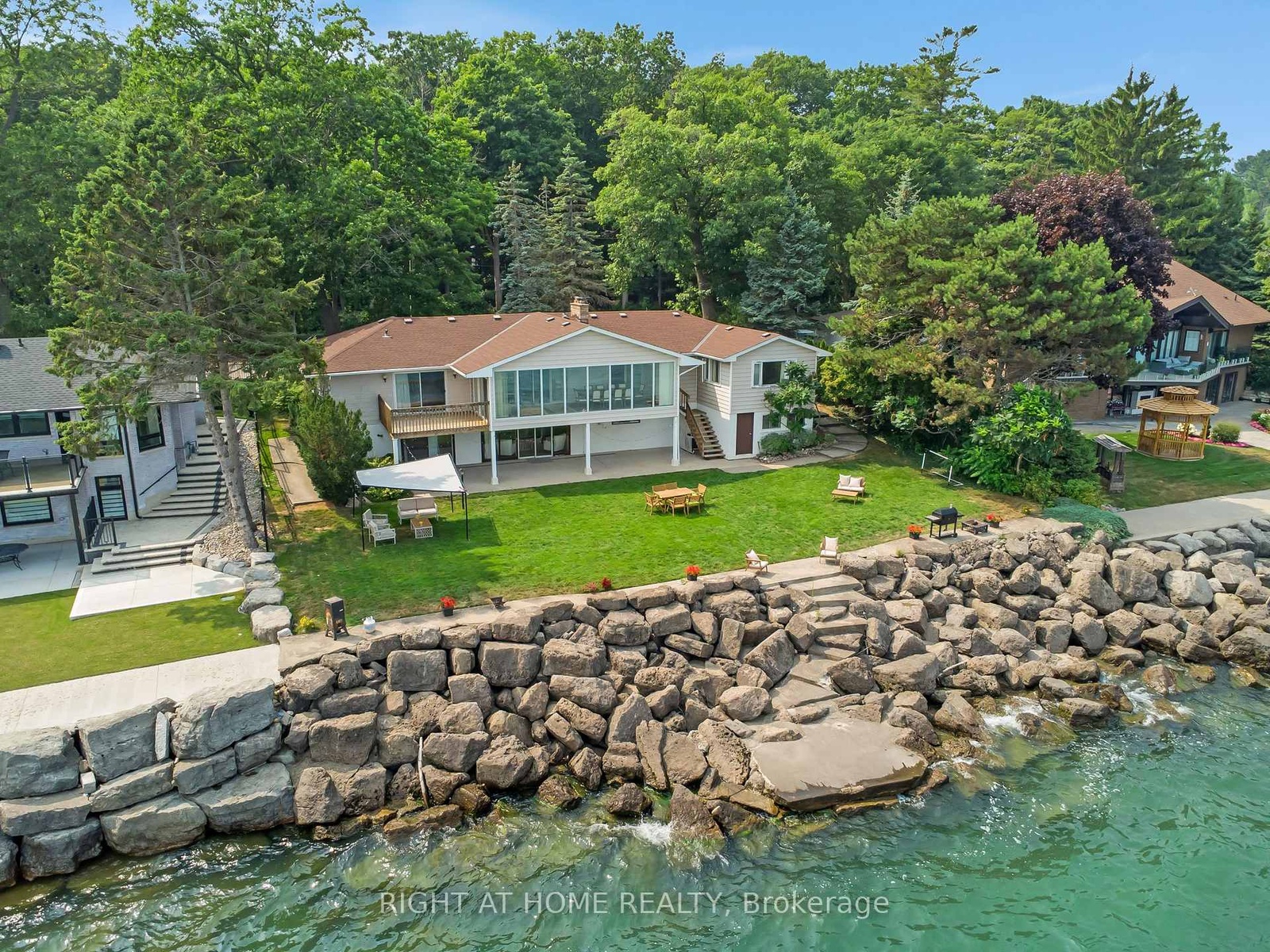 Welcome to an exceptional opportunity on Lakeshore Road, an extraordinary 100ft wide waterfront lot w/direct shoreline access and breathtaking views of Lake Ontario, including the Toronto city skyline. This fabulous raised bungalow w/a walk-out lower level offers over 2,200 sq ft on the main level and sits on a beautifully landscaped 100 x 135 lot. The property also includes modern architectural plans by David Small Designs, presenting a rare chance to renovate or rebuild your dream home on one of the few remaining wide-lot waterfront properties in the area. The home has been meticulously maintained and offers a spacious, light-filled layout. Floor-to-ceiling windows on both the main and lower levels capture sweeping, uninterrupted views of the lake, filling the home with natural light and bringing the outdoors in. The standout dining room addition is wrapped in glass, creating a truly immersive lakefront living experience. The main level features 3 bedrooms and 2 full bathrooms, along with a separate private office ideal for working from home. The primary bedroom retreat includes sliding doors that open to a private deck, where you can enjoy spectacular lake views morning to night. Rich hardwood flooring and elegant design elements add warmth and character throughout the home. The bright, walkout lower level offers even more living space, featuring a spacious recreation room, a games area, and a 3-pc bathroom. With large windows that echo the main floor's stunning views, the lower level feels just as open and connected to the surrounding landscape, making it perfect for entertaining, hosting guests, or creating a peaceful retreat. Outside, enjoy complete privacy and direct access to the waters edge, ideal spot to relax, watch the sunrise, or take in the city skyline across the lake. Located within walking distance to parks, schools, and shopping, this property offers a truly unique opportunity to live in one of the area's most coveted lakefront settings.