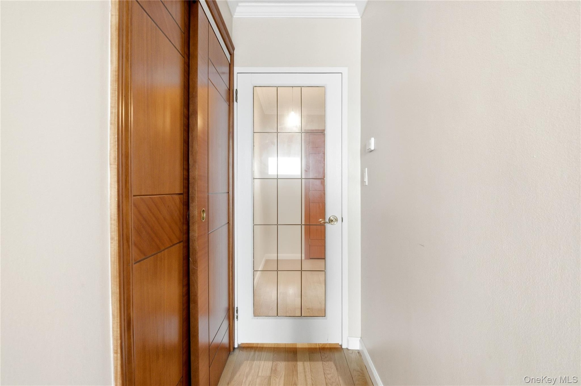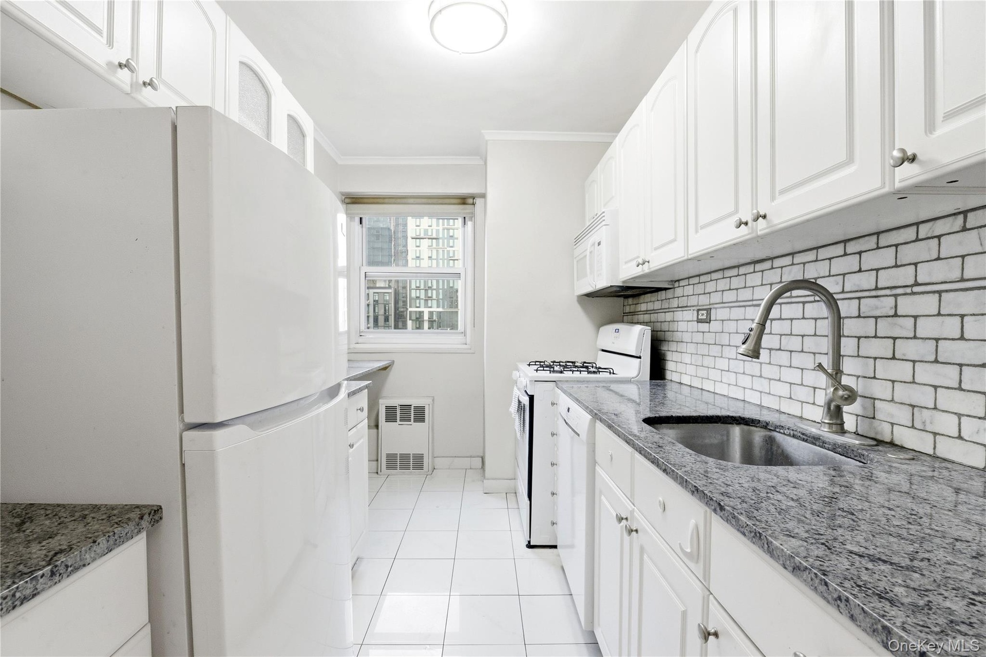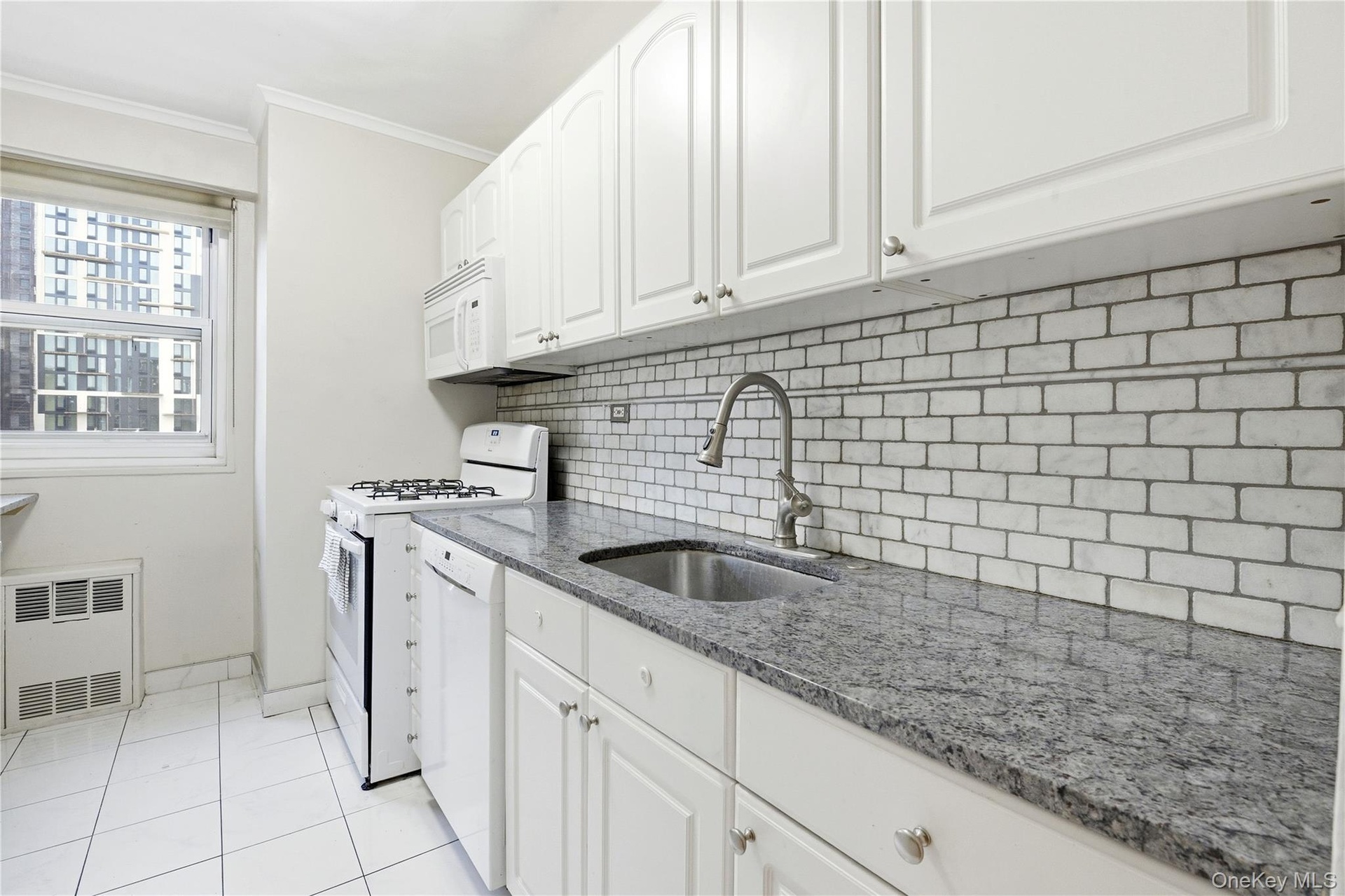 The separate windowed kitchen is thoughtfully finished with white cabinetry, granite countertops, a subway tile backsplash, and full-size appliances including a dishwasher, offering generous storage and workspace. The spacious bedroom easily accommodates a king-size bed along with additional furniture and features large windows with open city views. Hardwood flooring runs throughout the apartment, adding warmth and continuity to the space. The updated bathroom is outfitted with sleek tilework, a glass-enclosed tub and shower, a modern vanity, and contemporary fixtures.The residence also offers ample closet space, through-wall air conditioning, and bright neutral finishes that make styling effortless.