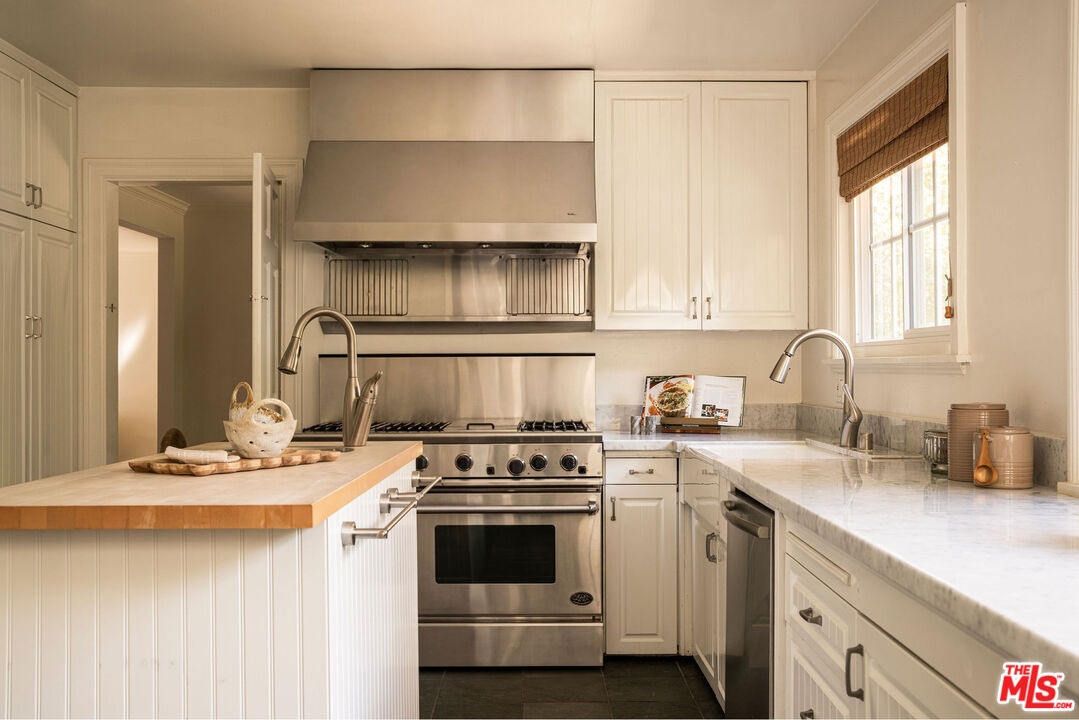 Hidden from the street behind gates and towering 50-foot privacy hedges, this pristinely updated storybook traditional haven promises a charm-filled lifestyle amidst peace and serenity, with three bedrooms + den. A vast circular motor court wraps around the grassy front lawn and leads to the home's exposed-brick entry, its reddish hue complemented by the freshly painted creamy white facade. Inside, fantastic newly refinished dark hardwood floors impressively shine, reflecting natural sunlight welcomed by large picture windows. A bank of French doors lines the formal living room, with its elegant fireplace and dry bar/tasting area. The country kitchen includes a butcher-block island with wine refrigeration, comfy breakfast nook, open shelving, copious cabinetry, farm sink, period tin ceiling, and state-of-the-art stainless-steel appliances. Restored original wainscoting in the adjacent formal dining room adds classic prestige to intimate dinner parties. The primary wing, a true prize of the home, is equipped with a double-door entry, French doors to the backyard, fireplace, built-ins, and a versatile antechamber with a built-in desk, perfect as a television room, office, lounge, nursery, and more. The en-suite spa-inspired bath is complete with radiant floor heating, a glass-enclosed shower and separate oversized tub, subway tile wraparound, and massive department-store-like changing wardrobe with custom organizers, dresser island, makeup desk, and a safe for securing valuables. The guest bedroom is also warm and inviting and features a third fireplace and bath with shower. Outside, dine al-fresco and converse with friends and family surrounded by lush plant life. Or, retreat past terraced rose gardens for calm reflection from a trellis-covered patio, perched above the quaint grounds with delightful views of various treetops and natural ridge line. A detached guest house includes a wet bar, side-by-side laundry, doggy door, and three-quarter bath. In addition to the abundance of storage and deep closets found throughout the home, there is also a bonus storage shed. Parking is for eight to ten vehicles plus a two-car garage. Lovingly updated with modern finishes and gorgeous garden views from every room, this beautiful hidden jewel is move-in-ready and awaits its next chapter. Discover why this ideal location is dubbed Celebrity Row, cherished and private yet just moments to Rodeo Drive and the Westside. Welcome home!