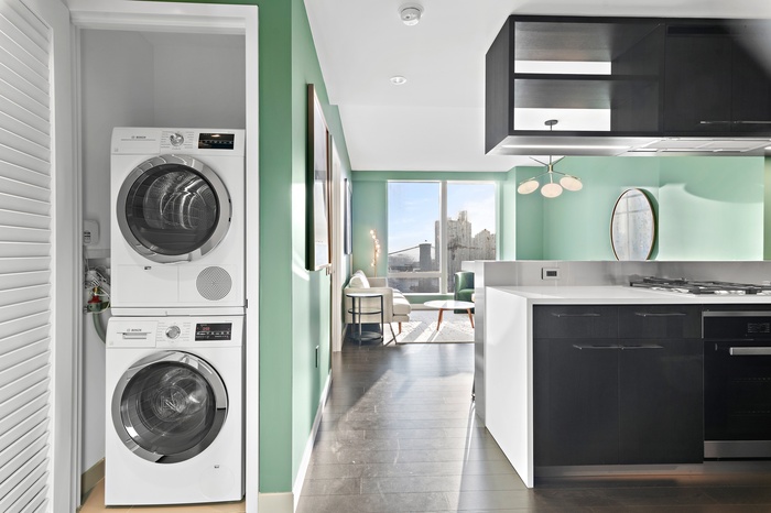 Enjoy all of the marvelous features residence 23P has to offer. With an open gourmet kitchen and breakfast bar, this fully furnished spacious residence facing South, East and West offers amazing views of The East River and Downtown Manhattan showcasing the Manhattan and Brooklyn Bridge. Warm, modern interiors are brought to life by the renowned design team at Meyer Davis Studio. Featuring chic warm green walls that complement the modern furniture, imported stone and custom finishes, premium Miele appliances, oak flooring throughout and an in unit washer and dryer. This distinctive bath features custom wood cabinetry, marble tile walls, mosaic floors with radiant heat and glass vanity top with polished chrome faucets