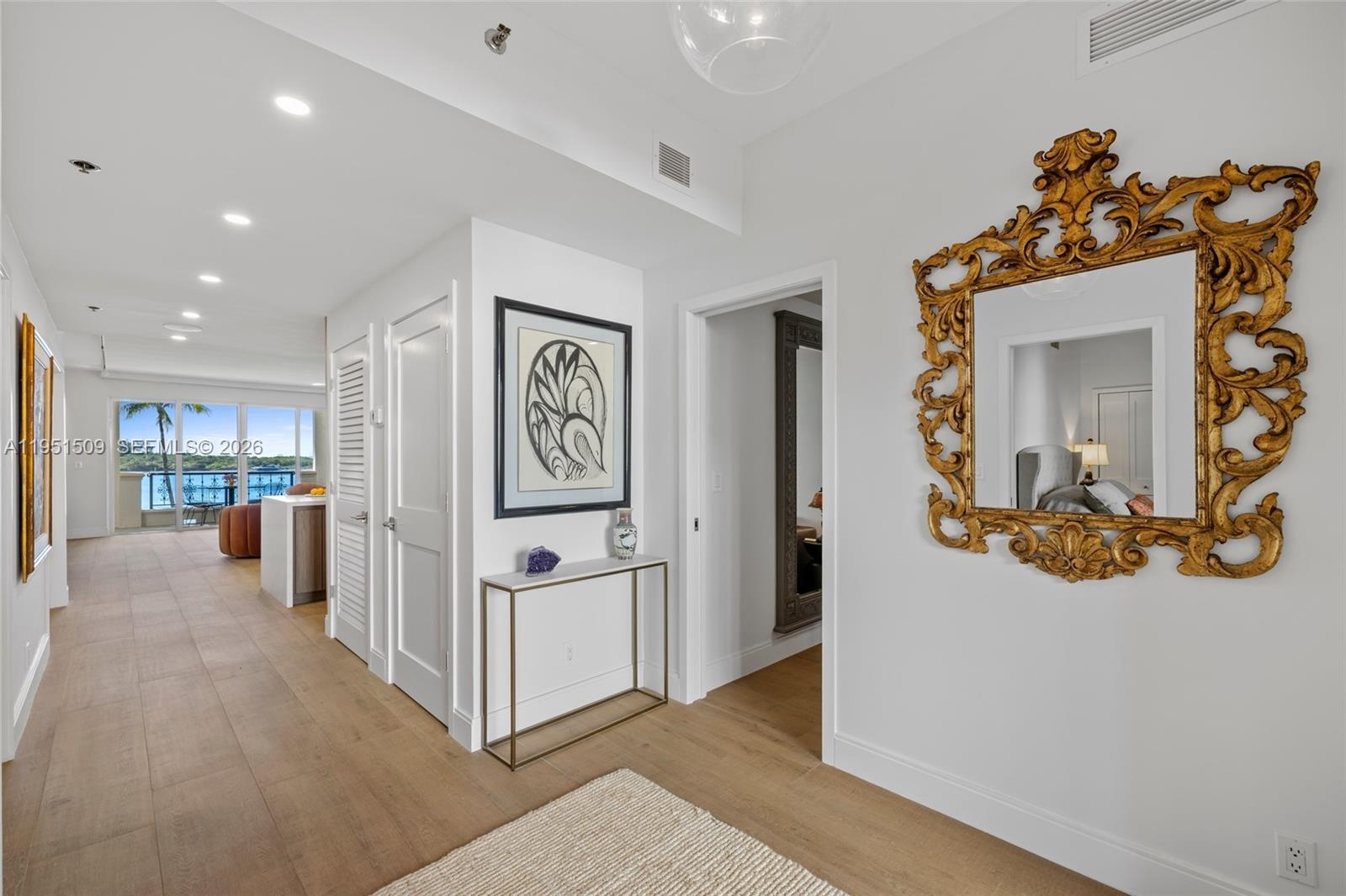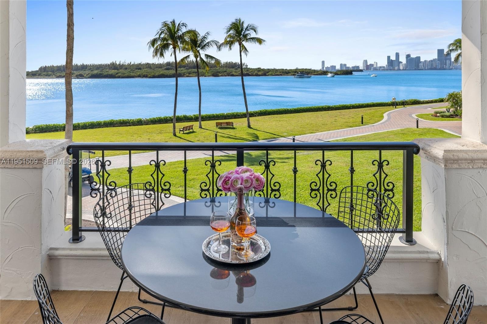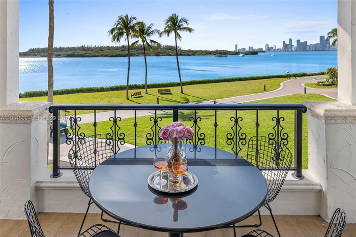 Beautifully renovated pied-a-mer offers mesmerizing sunsets framing the downtown skyline w/ breathtaking views. Fully renovated in 2022 and boasting modern spacious living areas. Clean “wood” porcelain floors throughout and imported Italian wood paneling are just some of the high-end finishes included. Contemporary open eat-in kitchen features Calacatta marble countertops equipped w/ Miele appliances, Liebherr refrigerator & wine cooler. Primary suite offers a sitting area, office space, and private balcony, along w/ a spa-inspired bath/shower a freestanding tub, and stunning book-matched marble finishes and eight-foot doors throughout. Welcoming foyer entry leads to a second BR and a versatile den ideal for a home-office or guest quarters. No expenses were spared in the design and finishes of this perfect Fisher Island condo.