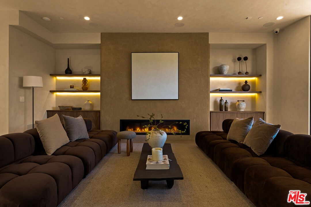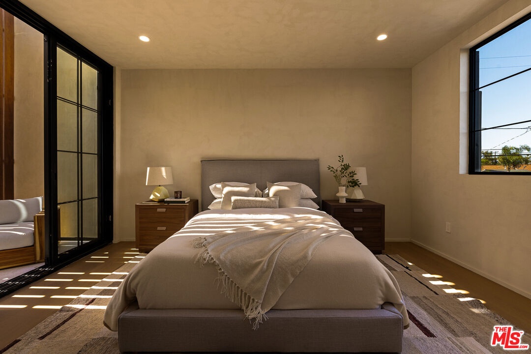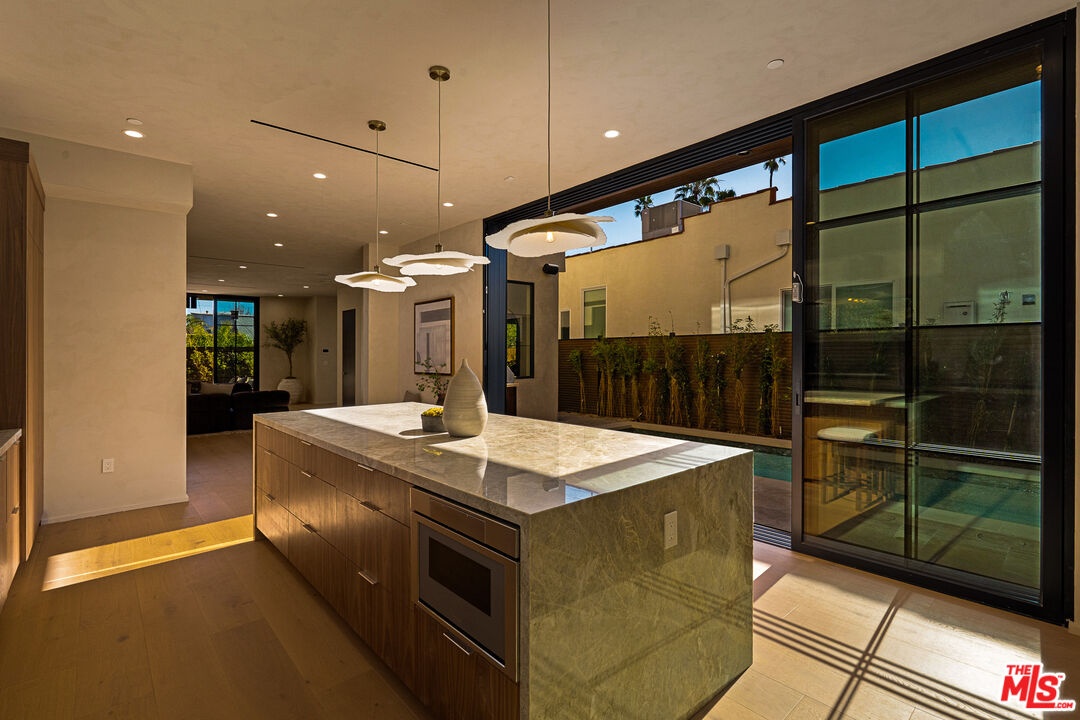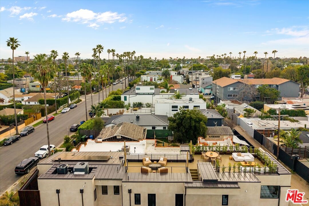 Welcome to this 2026 new construction, private tropical retreat featuring an expansive 895-square-foot rooftop deck with breathtaking 360 degree views of Venice Beach. Every detail has been thoughtfully curated with premium finishes, from Roman clay plaster walls to rich walnut accents, creating a warm yet contemporary aesthetic throughout. Offering over 3,100 square feet of open concept living, the home features 10 foot ceilings, a 77 bottle wine cellar, three fireplaces, and a fully integrated smart home experience. At the heart of the home is an exquisite chef's kitchen with Thermador appliances including dual ovens, custom walnut cabinetry, and a striking quartzite island designed for connection, perfect for conversation while seamlessly bridging the kitchen and living spaces. A dramatic wall of sliding glass doors opens to a resort style outdoor retreat with a sparkling heated pool, built-in BBQ, covered lounge area, and outdoor fireplace, ideal for entertaining and everyday enjoyment. The light filled primary suite showcases vaulted ceilings, a double sided fireplace, a custom walk-in closet, and a private balcony, while the primary bath offers a tranquil escape with a freestanding soaking tub, custom walnut vanities, and a triple head shower. An additional 895 square foot rooftop deck with cafe lighting and a fire pit offers panoramic treetop, city, and mountain views overlooking the heart of Venice. The home includes four en-suite bedrooms, an additional office, and five thoughtfully designed bathrooms, along with a private two-car garage with space for an additional vehicle secured by an automatic electric gate. The landscaped front yard is surrounded by bamboo and palm trees, all set on a wide, tree lined street West of Lincoln just moments from Abbot Kinney, world class dining, and the iconic Venice Beach capturing the essence of elevated Westside living.