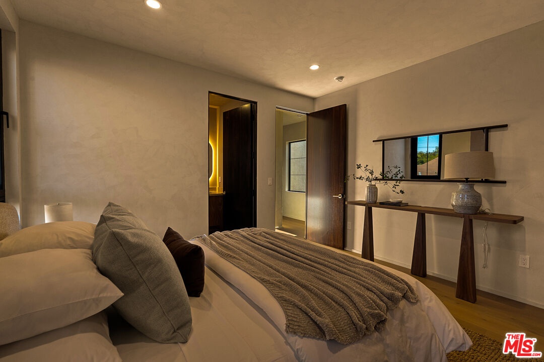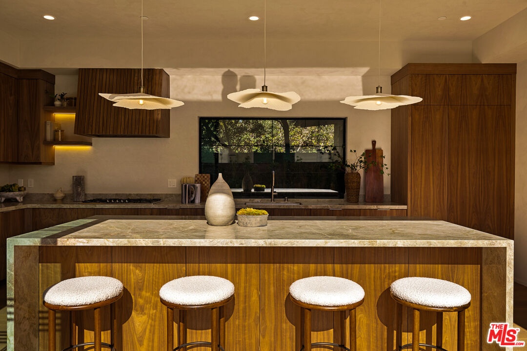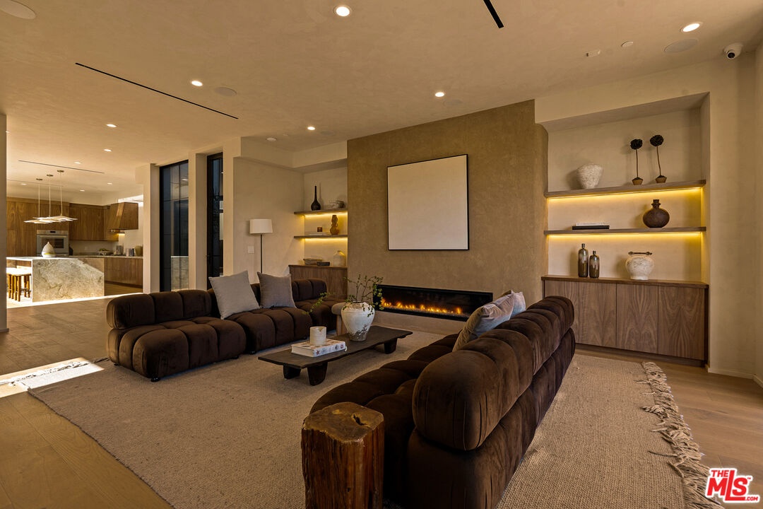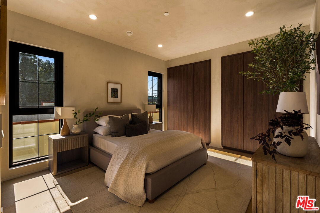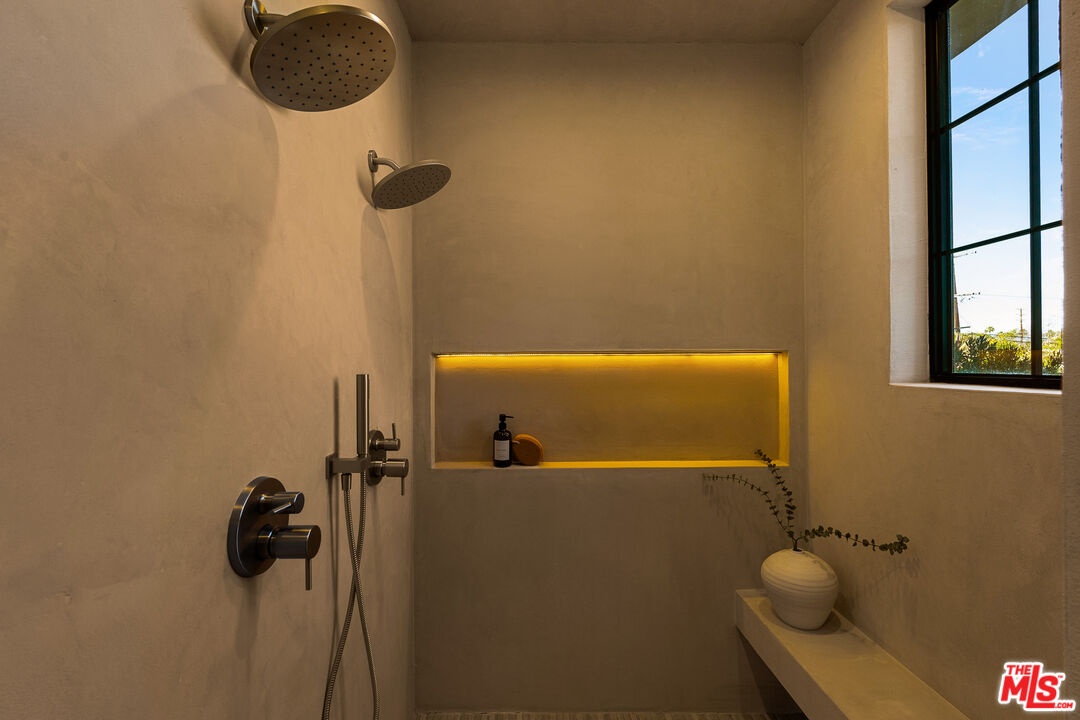 Welcome to this 2026 new construction, private tropical retreat featuring an expansive 895-square-foot rooftop deck with breathtaking 360 degree views of Venice Beach. Every detail has been thoughtfully curated with premium finishes, from Roman clay plaster walls to rich walnut accents, creating a warm yet contemporary aesthetic throughout. Offering over 3,100 square feet of open concept living, the home features 10 foot ceilings, a 77 bottle wine cellar, three fireplaces, and a fully integrated smart home experience. At the heart of the home is an exquisite chef's kitchen with Thermador appliances including dual ovens, custom walnut cabinetry, and a striking quartzite island designed for connection, perfect for conversation while seamlessly bridging the kitchen and living spaces. A dramatic wall of sliding glass doors opens to a resort style outdoor retreat with a sparkling heated pool, built-in BBQ, covered lounge area, and outdoor fireplace, ideal for entertaining and everyday enjoyment. The light filled primary suite showcases vaulted ceilings, a double sided fireplace, a custom walk-in closet, and a private balcony, while the primary bath offers a tranquil escape with a freestanding soaking tub, custom walnut vanities, and a triple head shower. An additional 895 square foot rooftop deck with cafe lighting and a fire pit offers panoramic treetop, city, and mountain views overlooking the heart of Venice. The home includes four en-suite bedrooms, an additional office, and five thoughtfully designed bathrooms, along with a private two-car garage with space for an additional vehicle secured by an automatic electric gate. The landscaped front yard is surrounded by bamboo and palm trees, all set on a wide, tree lined street West of Lincoln just moments from Abbot Kinney, world class dining, and the iconic Venice Beach capturing the essence of elevated Westside living.