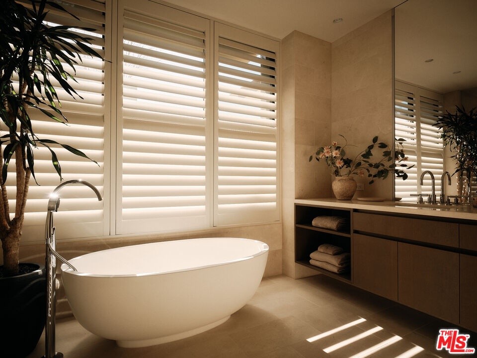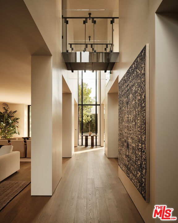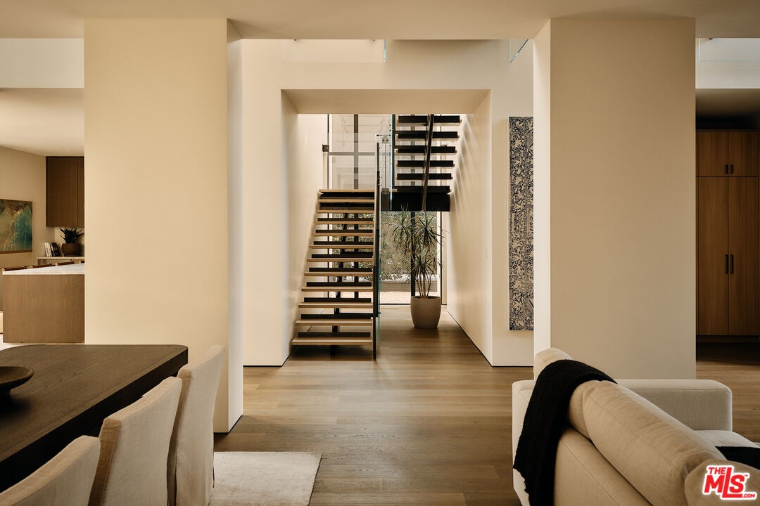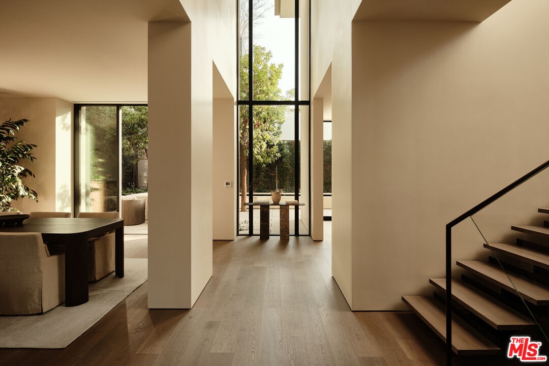 Stone House by Olson Kundig at 8899 Beverly is a singular architectural residence offering a rare combination of privacy, scale, and full-service luxury in the heart of West Hollywood. One of only eight signature homes within this acclaimed development, and the largest of the collection, Stone House is the only one of its kind. The four-bedroom, four-and-a-half-bath home spans over 3,600 square feet and is defined by a refined interplay of light champagne steel and substantial limestone that carries from the exterior through a formal sequence of interior spaces.A distinctive axial layout creates a natural flow throughout the home, centered on a dramatic double-height entry and living space. A sculptural, double-sided fireplace anchors the central living area, opening to both the front garden and the interior. A bespoke custom stair with exposed structural steel is paired with a glass guard, leading to an interior steel bridge above the central living area. Fleetwood operable sliding doors extend the living spaces and kitchen to a private backyard retreat with a plunge pool and spa. Interior finishes are warm and cohesive, with wood flooring throughout and plain-sawn oak cabinetry carried consistently across the home. The kitchen is fully integrated with custom-paneled cabinetry and a premium suite of Gaggenau and Miele appliances. The primary bedroom is a true sanctuary, featuring a fireplace, dual walk-in closets, and a spa-like bathroom finished in Crema Ella marble with a freestanding soaking tub. All four bedrooms feature custom closets and built-ins. As part of the Olson Kundigdesigned 8899 Beverly development, homeowners enjoy access to 24-hour concierge and property management services, a state-of-the-art fitness center, and a landscaped amenity deck with resort-style pool and spa and a custom outdoor kitchen. One of only four remaining homes in the development, Stone House offers a rare opportunity to own a fully private, architecturally significant residence with the services and amenities of a world-class enclave.