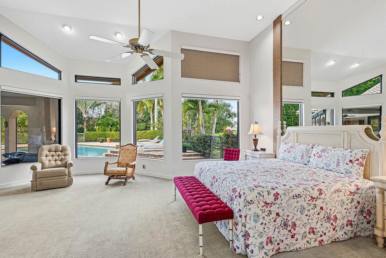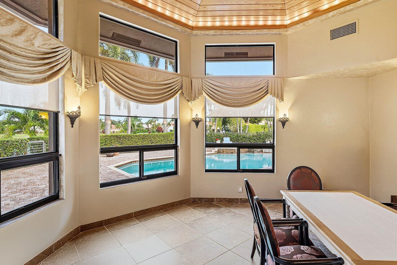Welcome home to this sprawling executive estate in the exclusive, boutique community of Bocaire Country Club. Tucked away on a private and quiet cul-de-sac, this light-filled residence offers over 5,300 square feet of exceptional living and entertaining space on one of the largest lots in Bocaire, nearly three-quarters of an acre, with serene lake and fountain views in a park-like setting complete with a private gazebo set safely away from the golf course. This impressive home features 5 bedrooms, 4.5 bathrooms, a private office, game and card rooms, and a 3-car garage with an abundance of storage, designed with a split floor plan, high ceilings, and expansive living areas ideal for both everyday comfort and hosting gatherings large or small. The card room is a standout feature with a dramatic octagonal wood ceiling that adds architectural character and warmth. Marble floors grace the main living spaces, while the spacious kitchen offers wood cabinetry, granite countertops, and top-of-the-line appliances. The luxurious primary suite is a true retreat, featuring dual walk-in closets, dual commodes, and tranquil views of the sparkling heated pool. Guest quarters include a private bathroom with direct access to the pool, offering ideal privacy for visitors. Enjoy breakfast overlooking the expansive covered patio, or relax year-round in the beautifully landscaped outdoor oasis with pool, lake, and fountain views. Additional highlights include a full-house generator, accordion shutters, and five air conditioning units, providing exceptional comfort, efficiency, and peace of mind. The scale and layout of this home create endless possibilities for entertaining indoors, on the expansive patio and pool area, or throughout the oversized lot. Residents enjoy an exclusive country club lifestyle with resort-style amenities, including a brand-new championship golf course, active golf and tennis programs, a state-of-the-art fitness center, stunning aquatics complex, pickleball and basketball courts, tot lot, and vibrant dining and social events. Must see. Buyer must go under contract before March to take advantage of the current $200,000 initiation fee before it increases to $300,000. *Some images include AI-assisted enhancements.