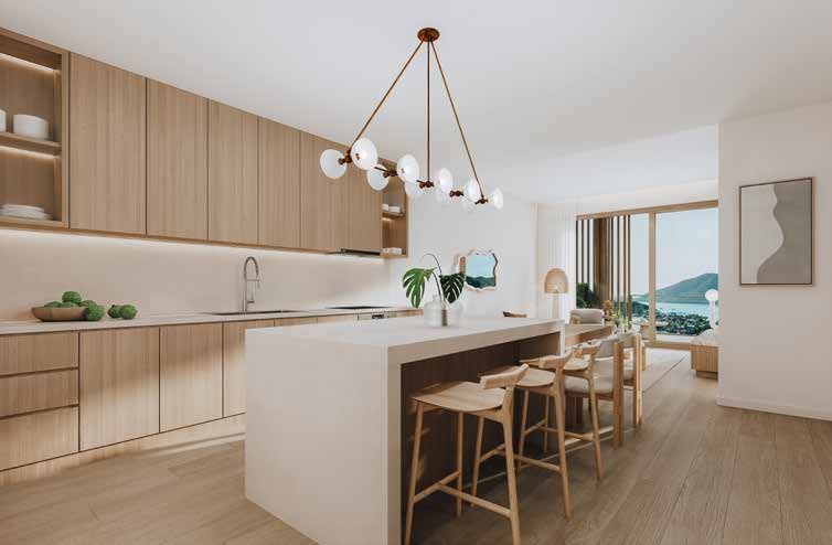 Interiors blend contemporary lines with tactile island influences. Natural textures, soft neutral palettes with subtle coral and ocean blue accents and bespoke finishes create an atmosphere of understated sophistication. The kitchens are fully equipped with premium appliances and refined detailing, while the principal suite offers a private retreat with a beautifully appointed bathroom and ample wardrobe space.