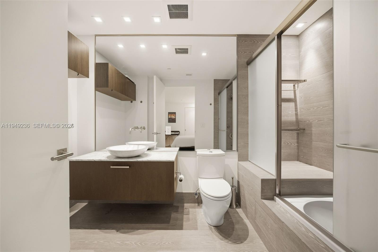 The thoughtfully designed open floor plan features two bedrooms, two-and-a-half baths, and expansive living spaces filled with natural light streaming through a covered balcony overlooking lush garden views. Upon arrival via a private keyed elevator, the residence reveals calming neutral tones complemented by bespoke finishes throughout, including Miacucina Italian glass cabinetry in the kitchen and closets, Miele stainless steel appliances, 48x48 white glass flooring, custom oak wood accent walls, Lutron lighting, and a fully integrated audiovisual system. Every detail has been curated to reflect understated elegance and refined simplicity. Residents enjoy a boutique lifestyle with resort-style amenities, including an infinity-edge lap pool with dual spas, cabana areas, and a marina directly on the bayfront. The residence includes two covered parking spaces with a parking lift accommodating a third vehicle. Ideally located minutes from Downtown Miami, Brickell, and Coral Gables, this is a rare opportunity to experience gracious service, unparalleled luxury of waterfront living.