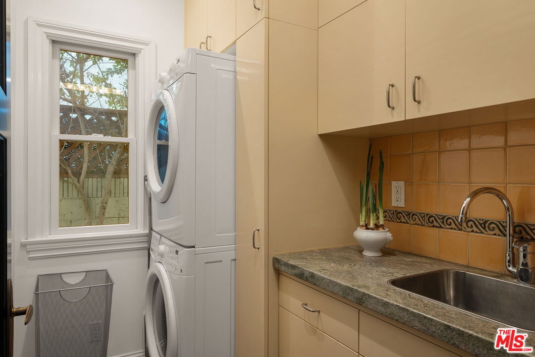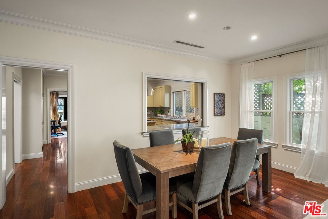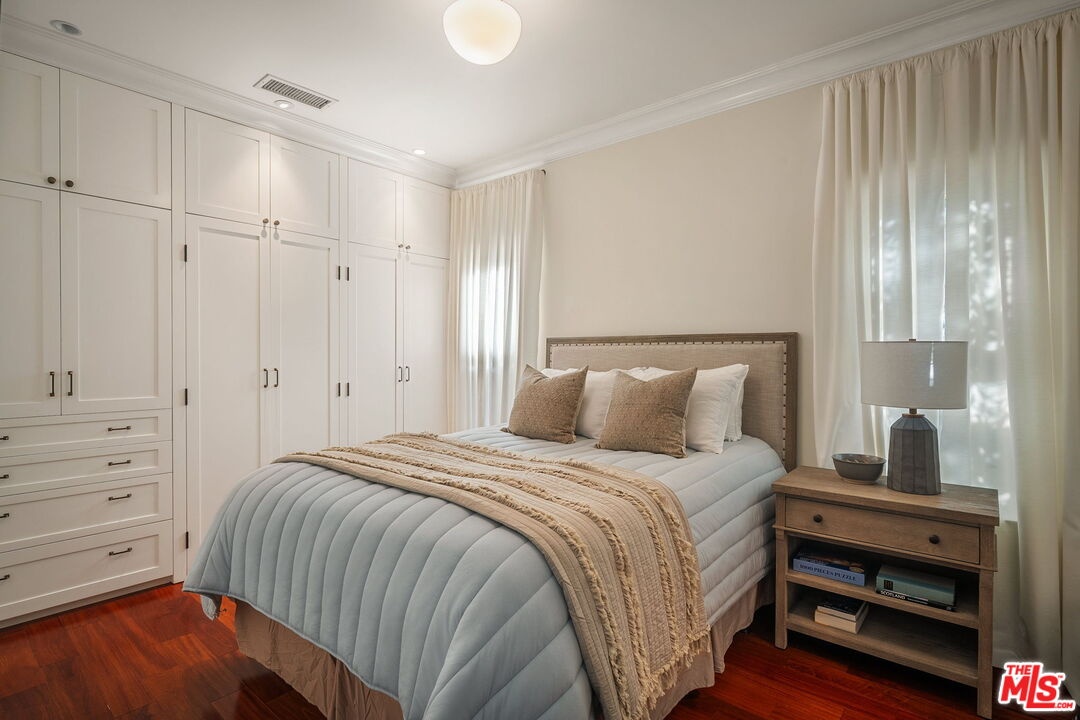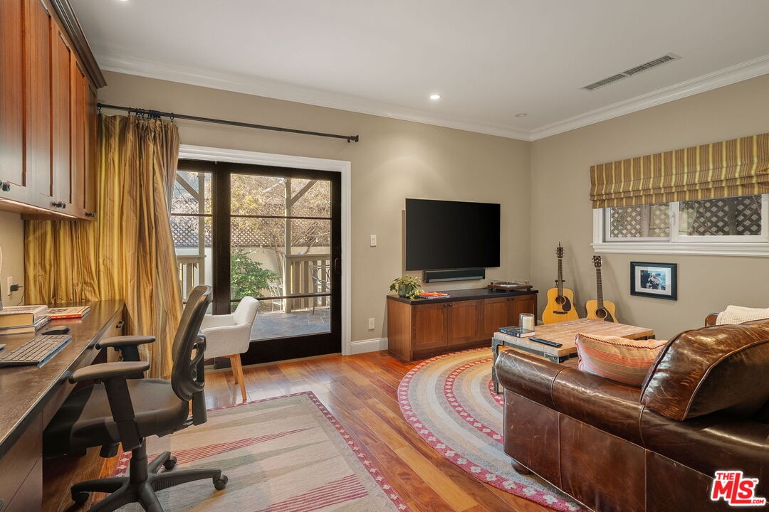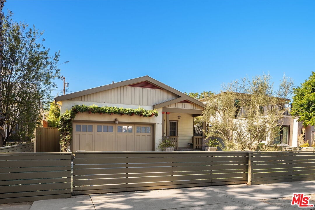 Welcome to a sophisticated California craftsman located in the highly coveted "Woods Streets" area of Mar Vista. This smartly designed floor plan balances open living areas with private spaces, beginning with an inviting front porch finished with gorgeous green and grey slate. Inside, you will find a living room featuring a cozy fireplace and custom bookshelves (with a built in ladder), along with a convenient powder room. The chef's kitchen is a standout, boasting a large center island, stunning Verde Cascada counters, custom cabinetry, Viking and Sub Zero appliances, including two ovens. Beautiful Camaru Brazilian hardwood floors and crown molding extend throughout the home. The spacious master bedroom suite includes a generous walk-in closet and a lovely bathroom equipped with Rojo Alicante marble counters, handmade Italian tiles, a soaking tub, and a separate shower. The gracious second bedroom also features a full bath. Off of the kitchen is a large relaxing den with a built-in desk/office area that opens to a stone patio with a built-in BBQ. There is laundry in the garage as well as a dedicated laundry room in the hallway and a large finished attic providing storage space. The property also offers direct entry to the 2-car garage, has a securely gated front yard, and features low-maintenance landscaping.