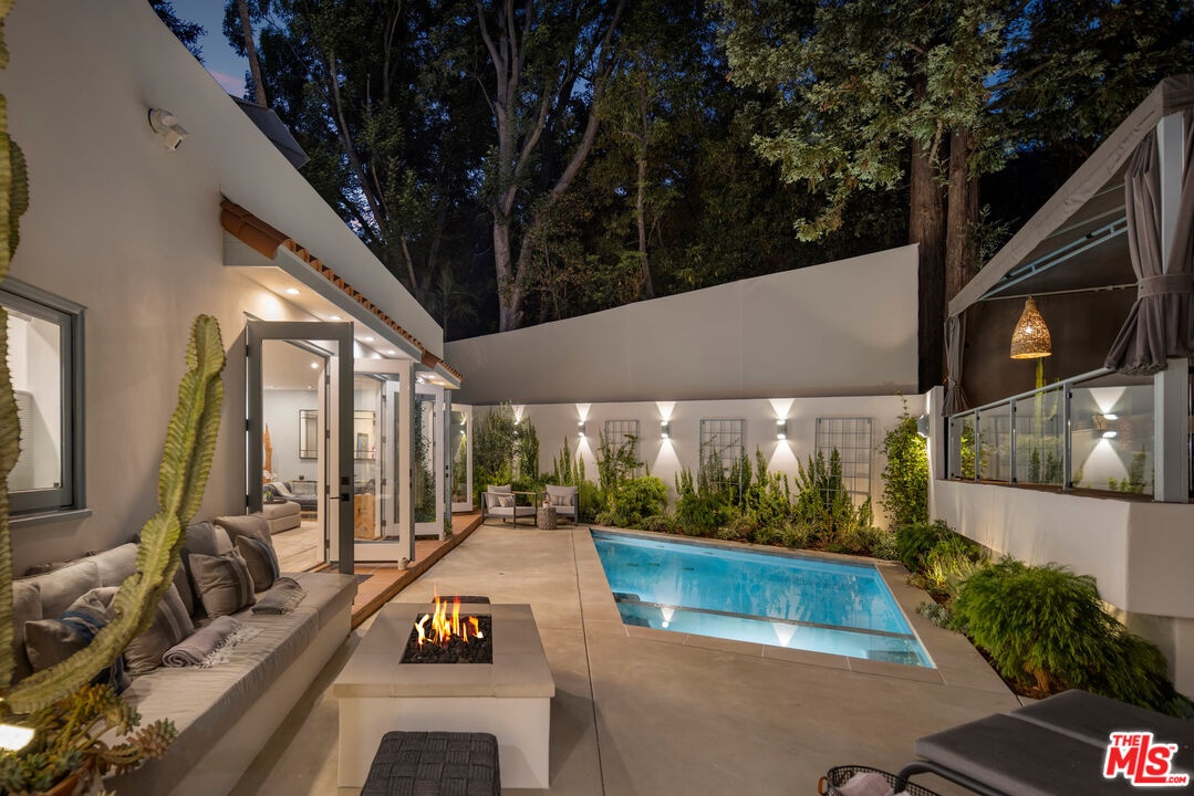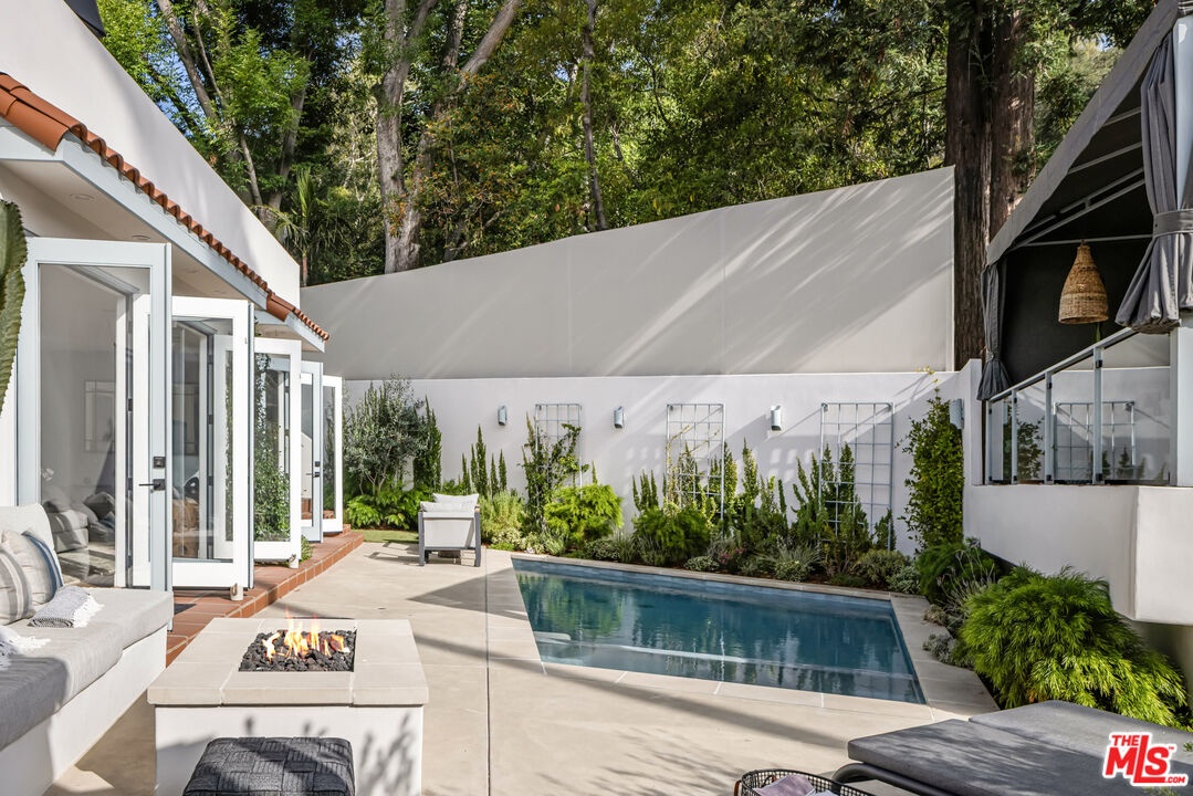 Nestled in the vibrant heart of Laurel Canyon, just minutes from the legendary Sunset Strip, this newly renovated ~3300sqft Spanish contemporary smart home embodies the essence of Hollywood Hills living. Located in the coveted Wonderland School District and eligible for Mulholland Tennis Club membership, this residence blends modern luxury with true bohemian spirit. The four bedroom and four bathroom main house features a spacious open-concept living and dining area, bathed in natural light, flowing seamlessly to an indoor-outdoor backyard oasis. Entertain effortlessly with a fire pit, pool & spa, and a rooftop BBQ & cabana lounge. The chef's kitchen boasts top-tier appliances, two luxurious primary suites offer spa-inspired ensuite bathrooms with steam showers, while a generous guest bedroom (with ensuite) and additional full bathroom on the main floor provide ample space for family or visitors. The detached two-car garage and extra private parking for two more vehicles, four spots in total, add convenience and functionality. The upstairs primary suite opens to a sun-soaked rooftop deck with treetop canyon views, perfect for sunset sound baths, morning yoga, or al fresco dining. The backyard boasts a separate ~600 sq. ft. guest house, complete with its own entrance, bedroom, bathroom, kitchen, and private outdoor space. Live the California dream in the canyon, where timeless charm meets contemporary elegance.