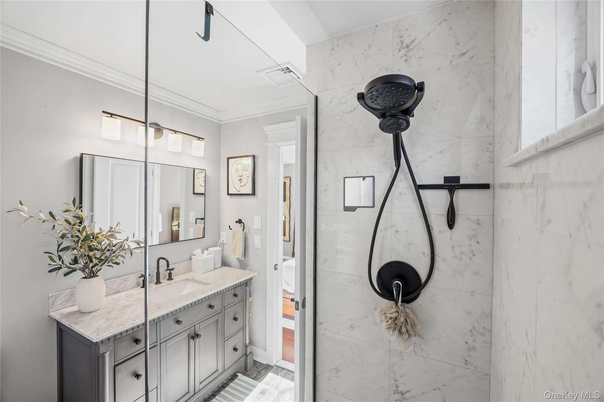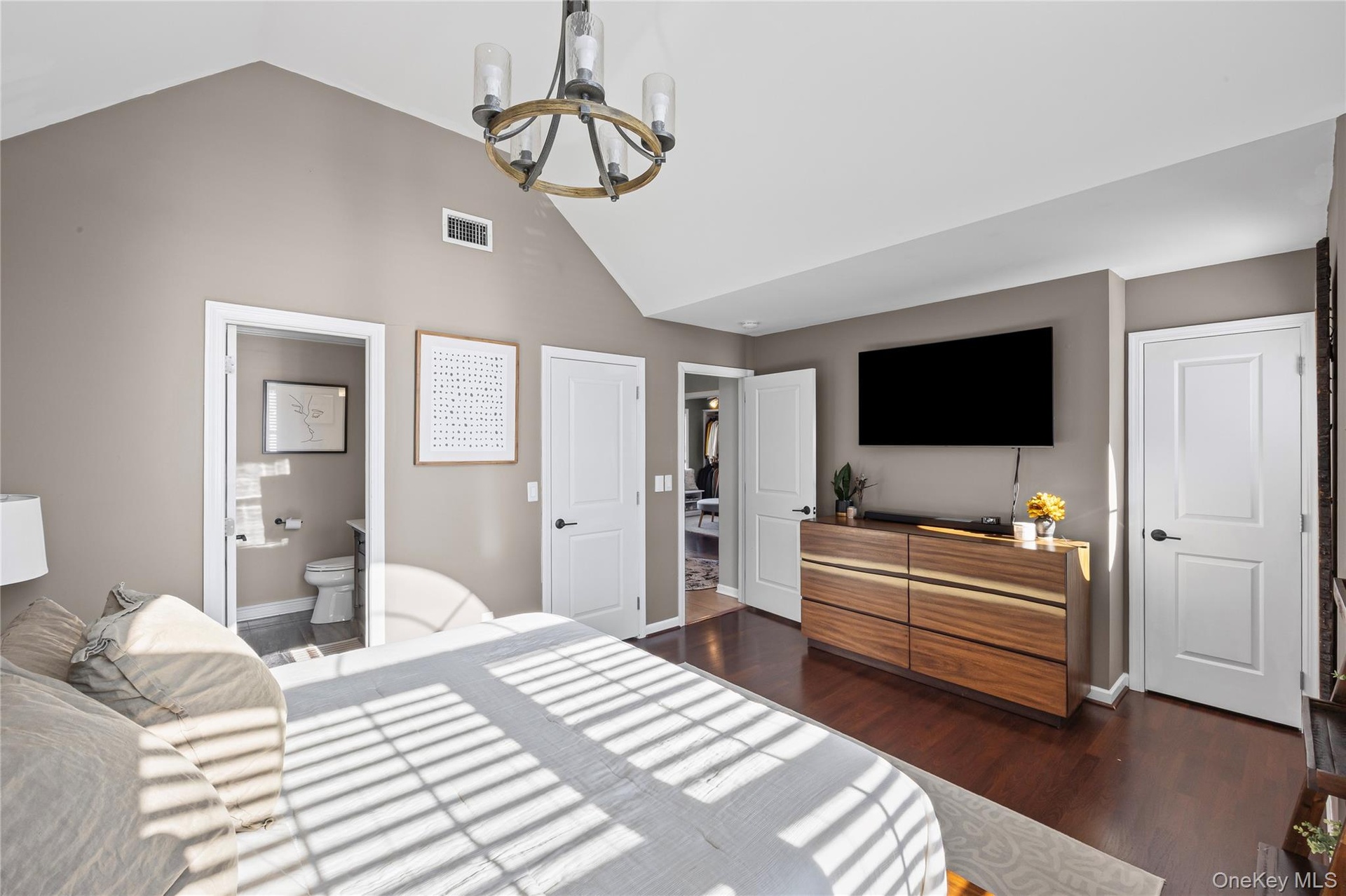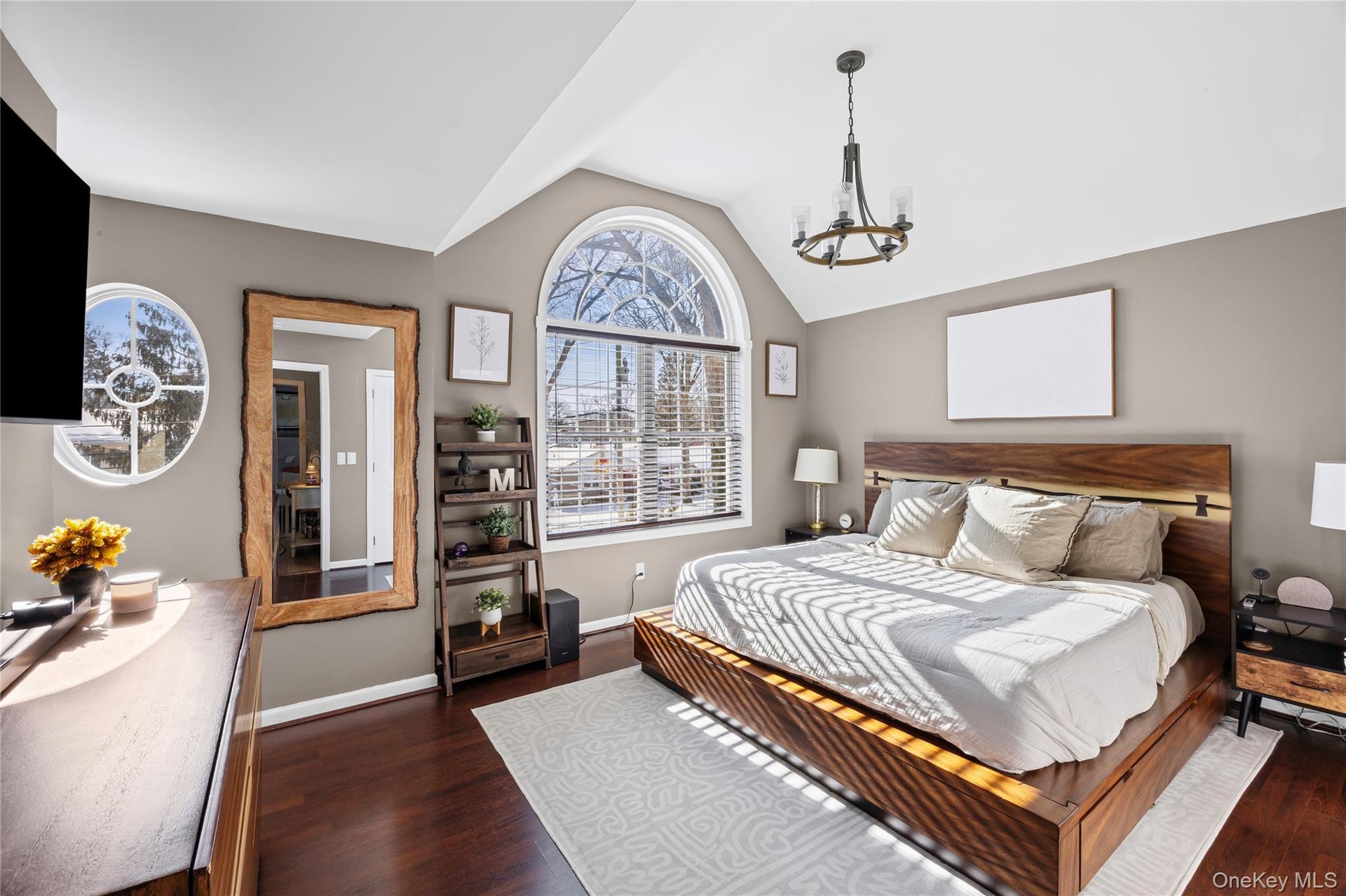 The Primary Bedroom Welcomes You with Beautiful Vaulted Ceilings and Specialty Windows. The Remodeled Bathroom and Ample, Customized Closet Space Offer Both Luxury and Practicality,