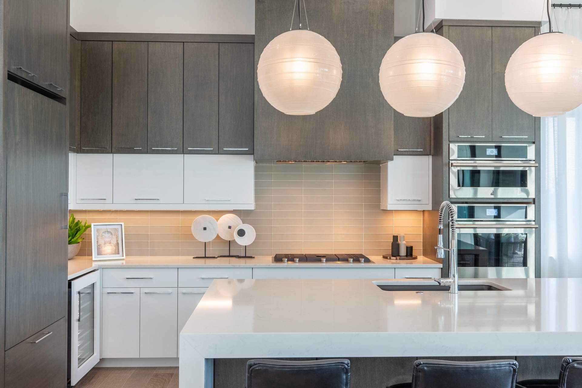 Light oak floors, vaulted ceilings, and subtle industrial finishes define the interior. The main floor includes a European-style kitchen, spacious primary suite, guest room or office, laundry, and an open living area. Upstairs offers two en-suite bedrooms with walk-in closets and an airy loft space.