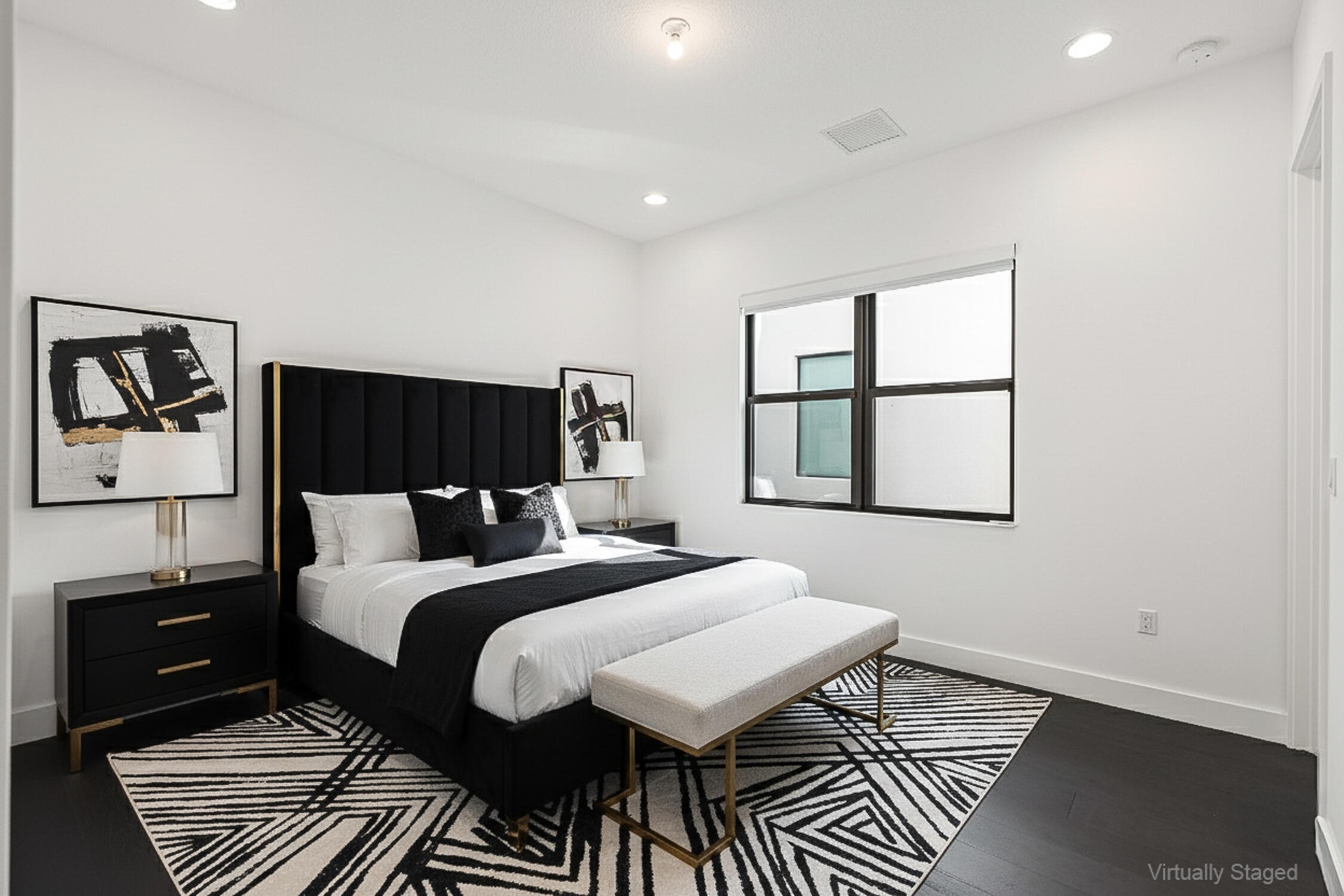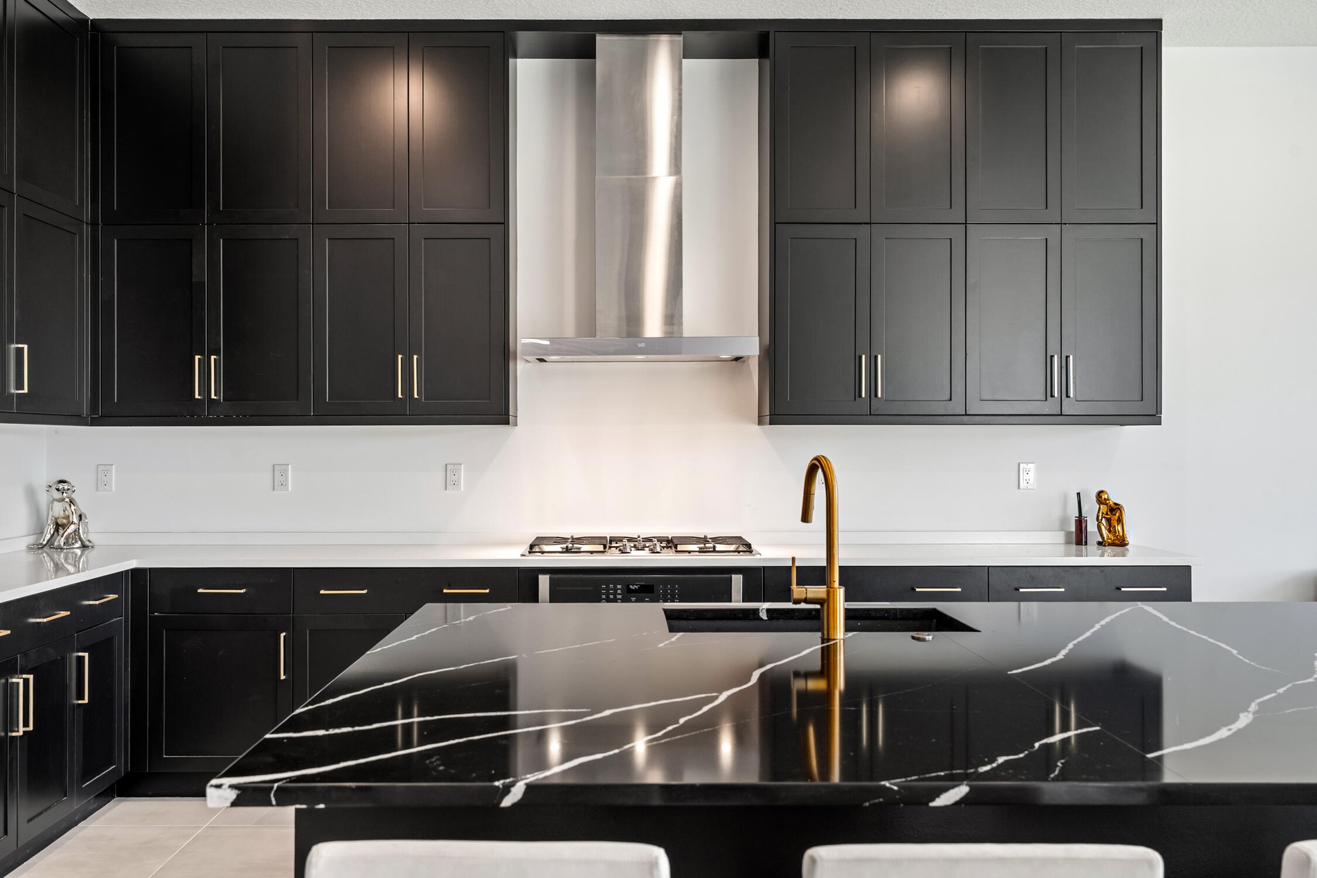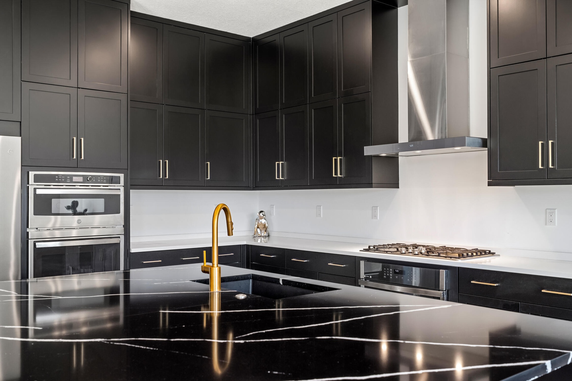 Inside, you are greeted by soaring ceilings, a light-filled open layout, and premium designer upgrades throughout - including custom millwork, statement lighting, and elegant under-stair accents. The bold, show-stopping kitchen features a striking black, white, and gold motif with upgraded cabinetry, expansive quartz countertops, a stainless steel undermount sink, and GE® Profile appliances, including a 36" gas cooktop and French door refrigerator.