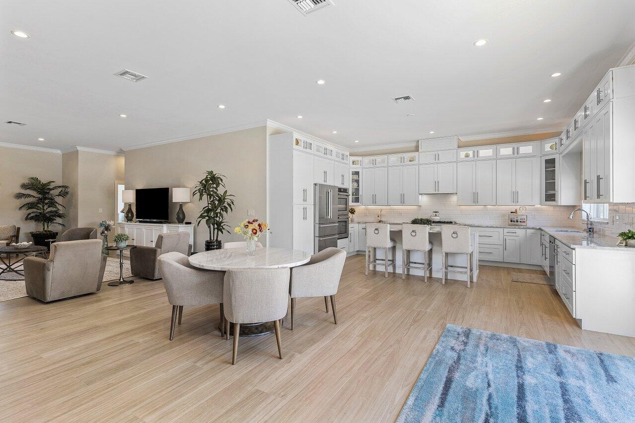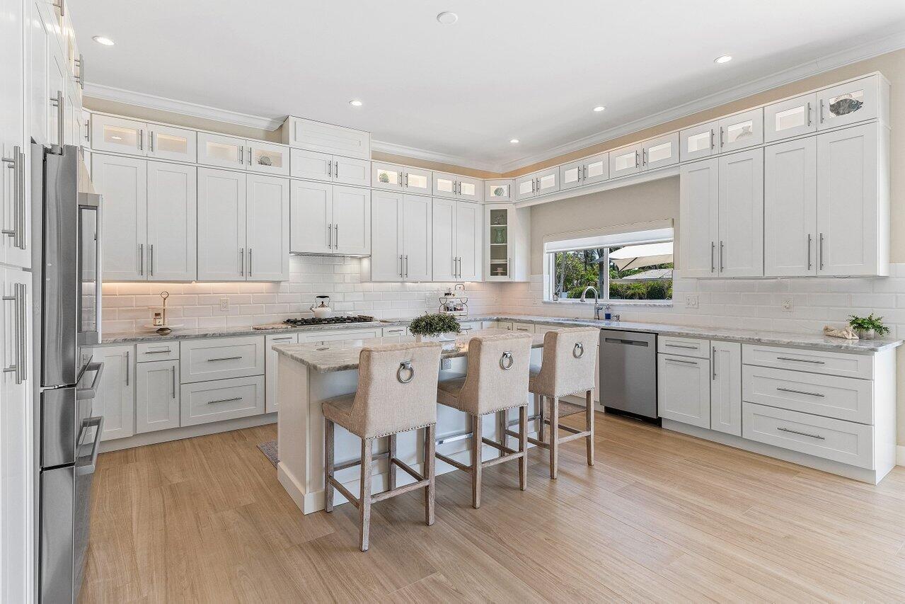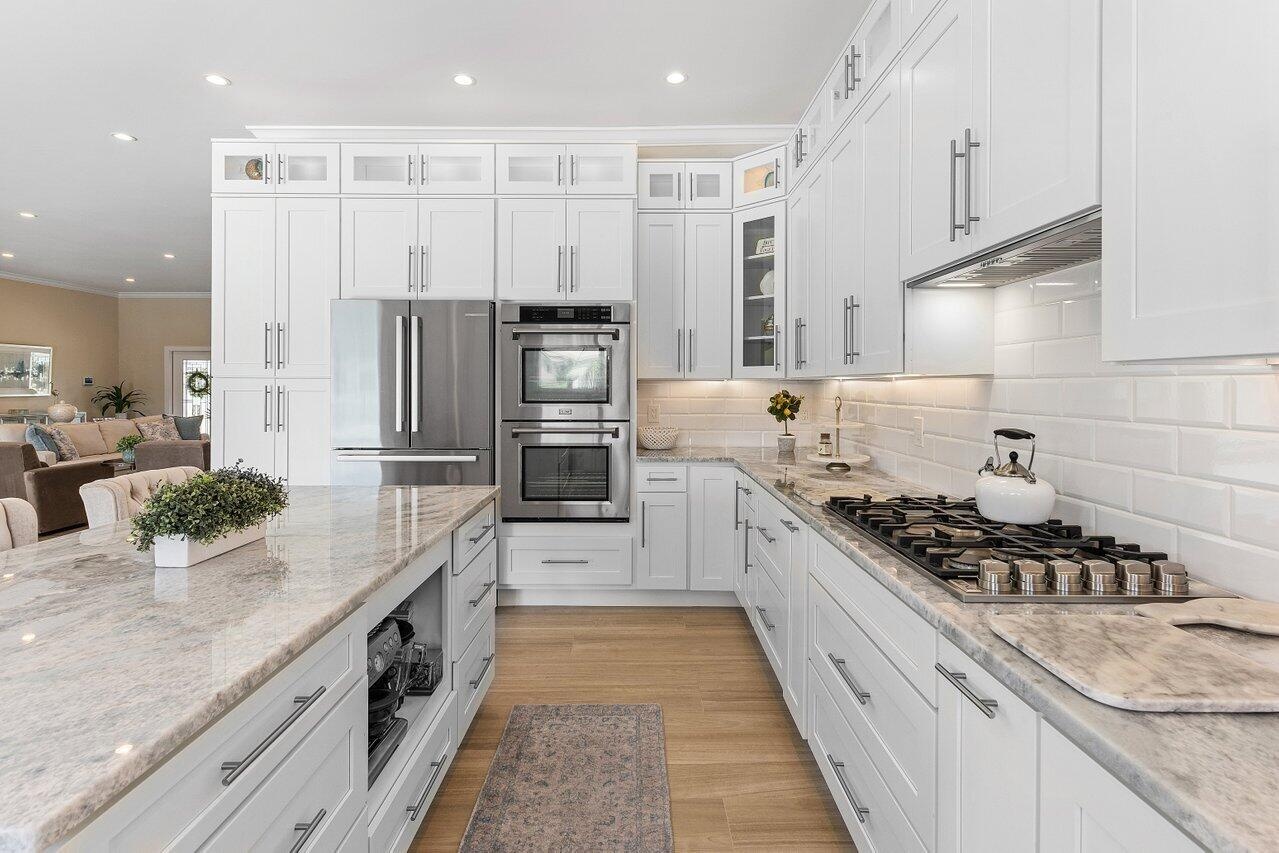 The chef's kitchen boasts a 6-burner gas range, island seating for three, marble countertops, and stainless appliances overlooking the main living and dining areas with seamless connection to the outdoor spaces. Whether you're hosting a gathering or enjoying a quiet evening, you'll appreciate the numerous areas inside and out designed to relax or entertain.