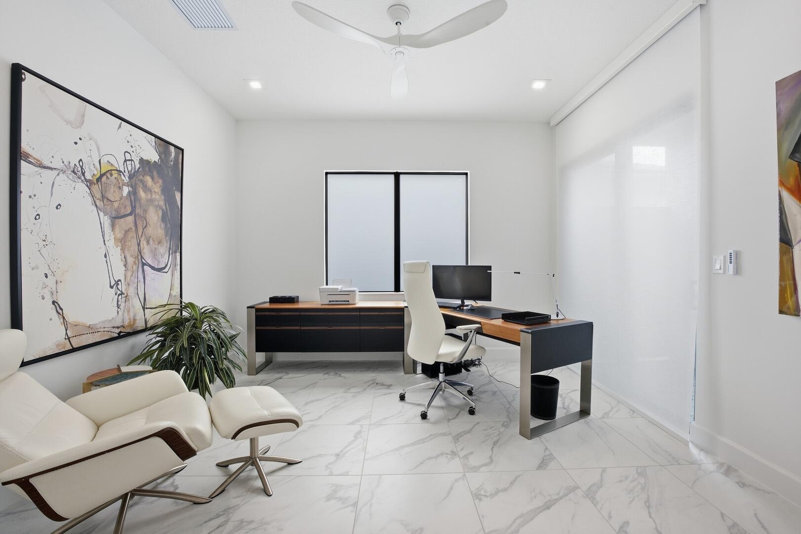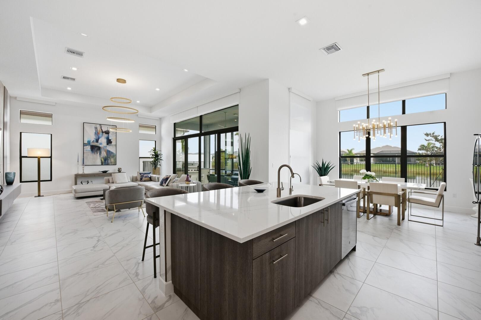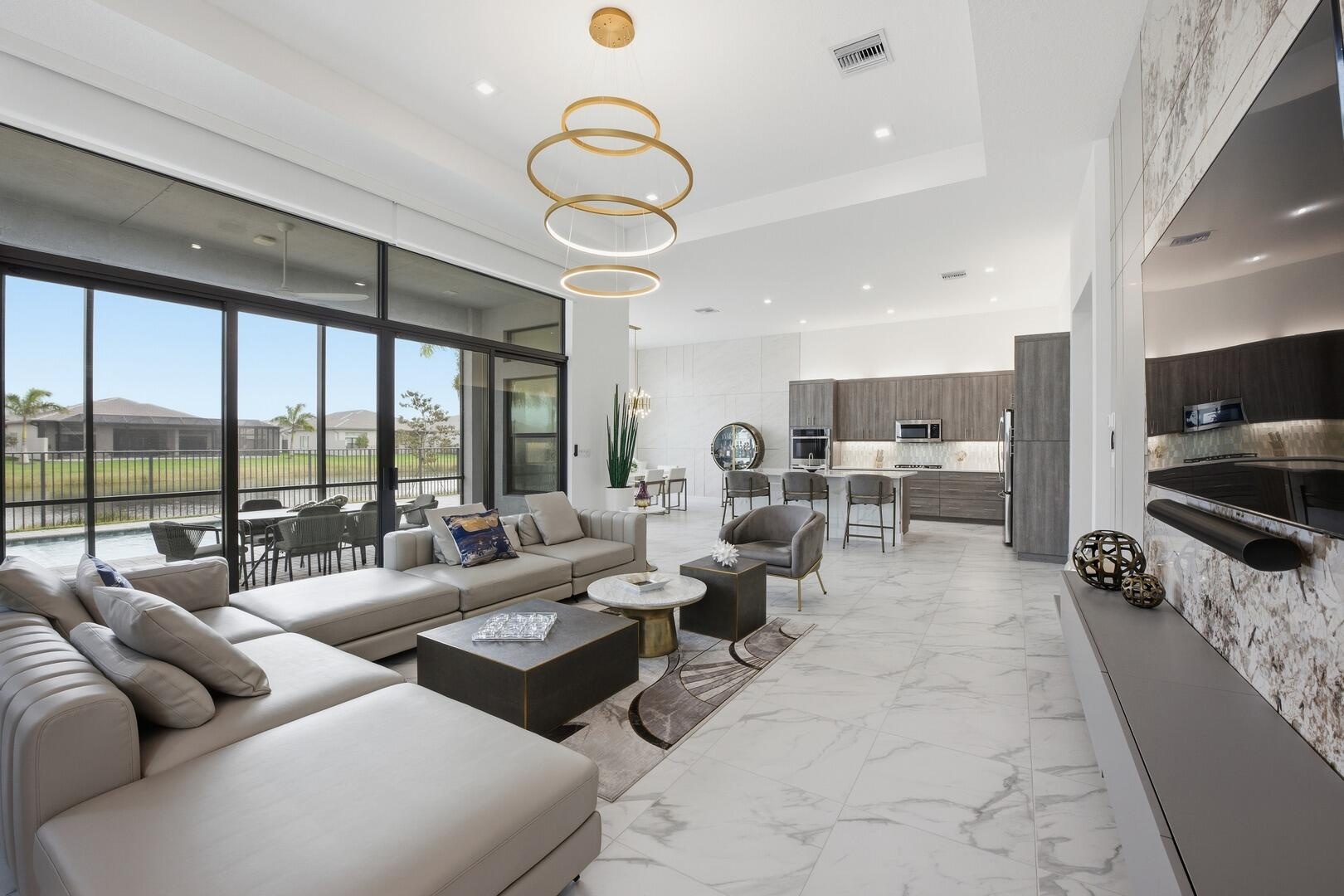 Experience elevated luxury in this impeccably designed residence in Valencia Grand, created for refined living and seamless entertaining. A dramatic frosted-glass double-door entry opens to an inviting foyer, immediately highlighting the home's upscale details. The spacious great room showcases a coffered ceiling, abundant natural light, and a chic tiled accent wall, offering a bright, sophisticated atmosphere. The dream kitchen is a chef's delight, offering quartz countertops, a tiled backsplash, cabinetry with pull-outs and pot drawers, above-and-below cabinet lighting, a double oven, stainless steel appliances, a 6-burner gas stove, pantry, and a spacious snack bar. The primary suite is a serene retreat with dual custom walk-in closets, a spa-like bath with double quartz vanities, and a walk-in shower. The 3rd bedroom includes a slider to a private atrium. Additional highlights include smooth walls, 24-inch porcelain tile throughout, high-hat lighting, motorized shades, impact windows, and a whole-house water filtration system. Step outside to the screen-enclosed patio with outdoor speakers, a full outdoor kitchen, and a heated salt-water pool with sun deck, all overlooking a fenced yard with tranquil water views your own private oasis.