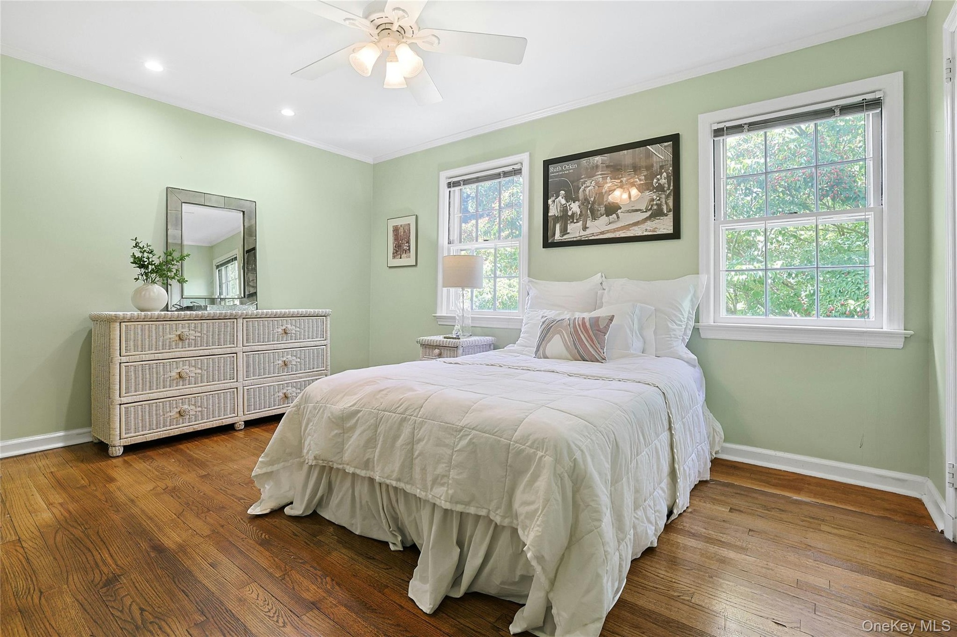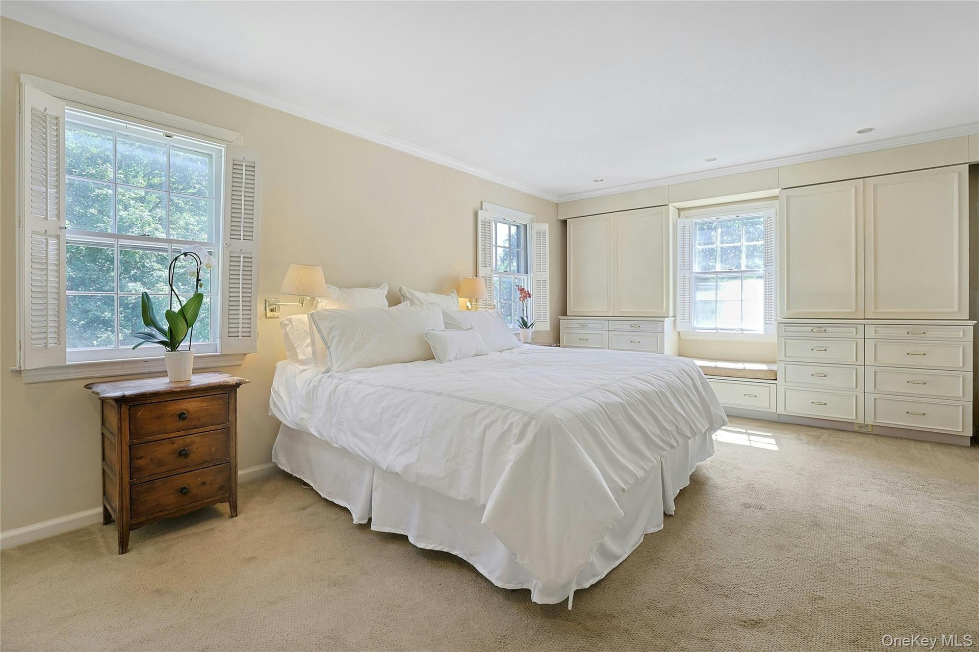 Classic Devoe Road colonial! A covered front portico welcomes you to this timeless traditional 3-bedroom, 2.5-bath colonial-style home. The spacious living room, anchored by a wood burning fireplace and lined with custom bookshelves enjoys radiant sunshine from the oversized true divided light picture window overlooking the front of the residence. The living room adjoins the formal dining room, lined with chair rail moldings and enhanced with crown and base moldings, gleaming hard wood floors and double French doors opening to a rear deck to make alfresco entertaining effortless. The gourmet eat-in kitchen is heartily equipped with a Bosch cooktop, double in-wall ovens and dishwasher, plus a Sub-Zero refrigerator, set along natural stone countertops and complemented by a built-in buffet with glass-front display cabinets, all topped with a tin ceiling. The inviting den features high ceilings, large picture windows, built-in display cases, a flagstone floor and a sliding glass door accessing the rear deck. A neat home office with loft supports work from home or sleep/study. A powder room is discreetly tucked in the entryway. A tidy mudroom with covered exterior entry and interior garage access finishes the main level. Upstairs reside three generously proportioned bedrooms and two full bathrooms, including a front-facing bedroom with ceiling fan and hardwood flooring, and a front-corner bedroom with two exposures, ceiling fan, and wall-to-wall carpeting with hardwood flooring beneath, both of which share a rear-corner bathroom endowed with both a bathtub and a separate shower stall. The opposite corner hosts the primary suite outfitted with a wall of closets and built-ins, including a cozy window bench and a private ensuite bath. The lower level provides lots of room for recreation and utility. A rear-facing divided light picture window brings natural light into two large adjoining recreation rooms with egress from a door to the flat rear yard. A laundry closet and a utility room with a bunker-like storage closet complete the lower level. This classic 1950s home has a flat easy driveway and rare, flat-as-a-pancake yards surrounded with lush and mature landscaping. A new roof was added in 2025, as was a new Roth above-ground oil tank. The neighborhood is one of the most sought-after locations in Chappaqua with close proximity to schools and access to a sidewalk to shops, town and train. A prime offering.