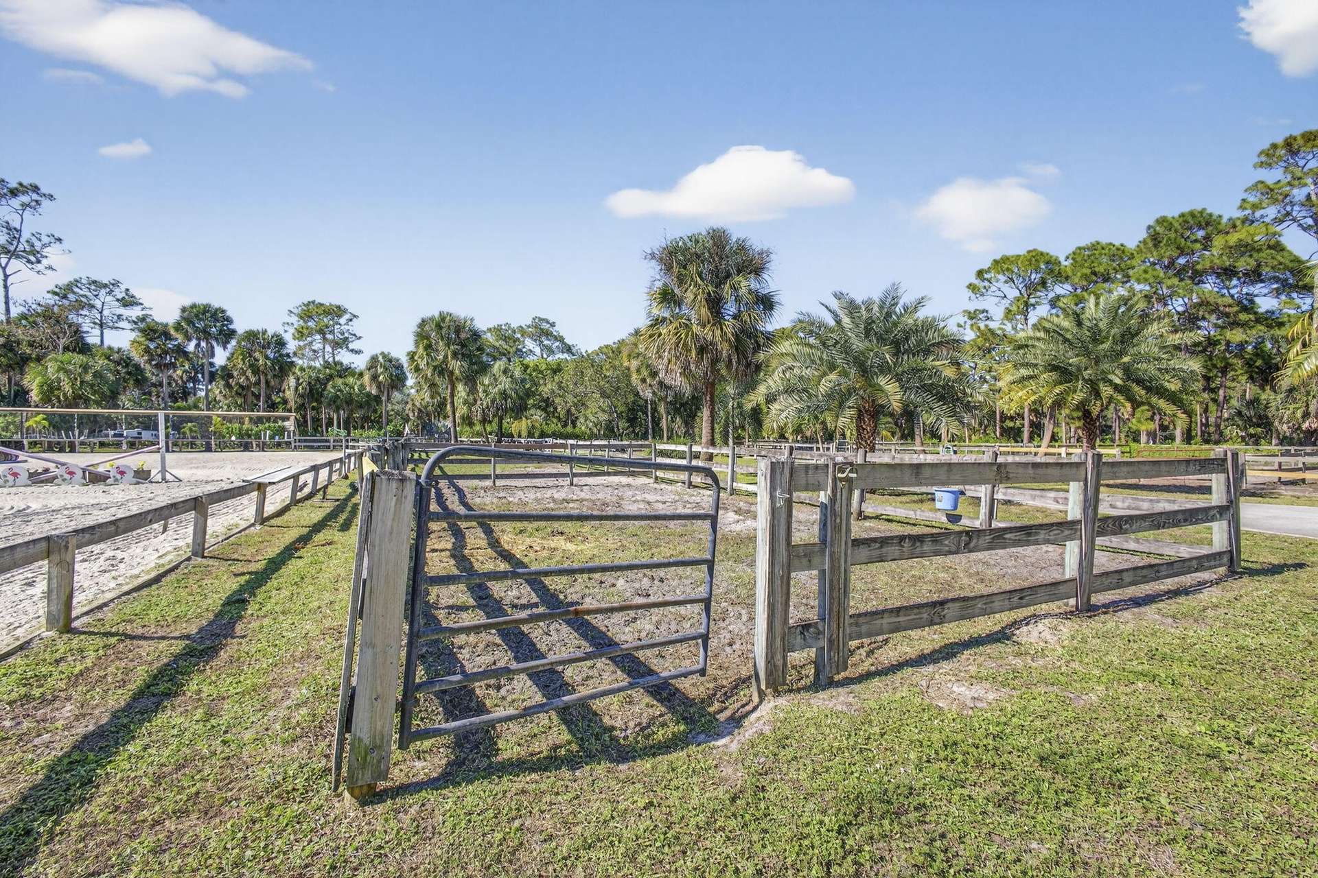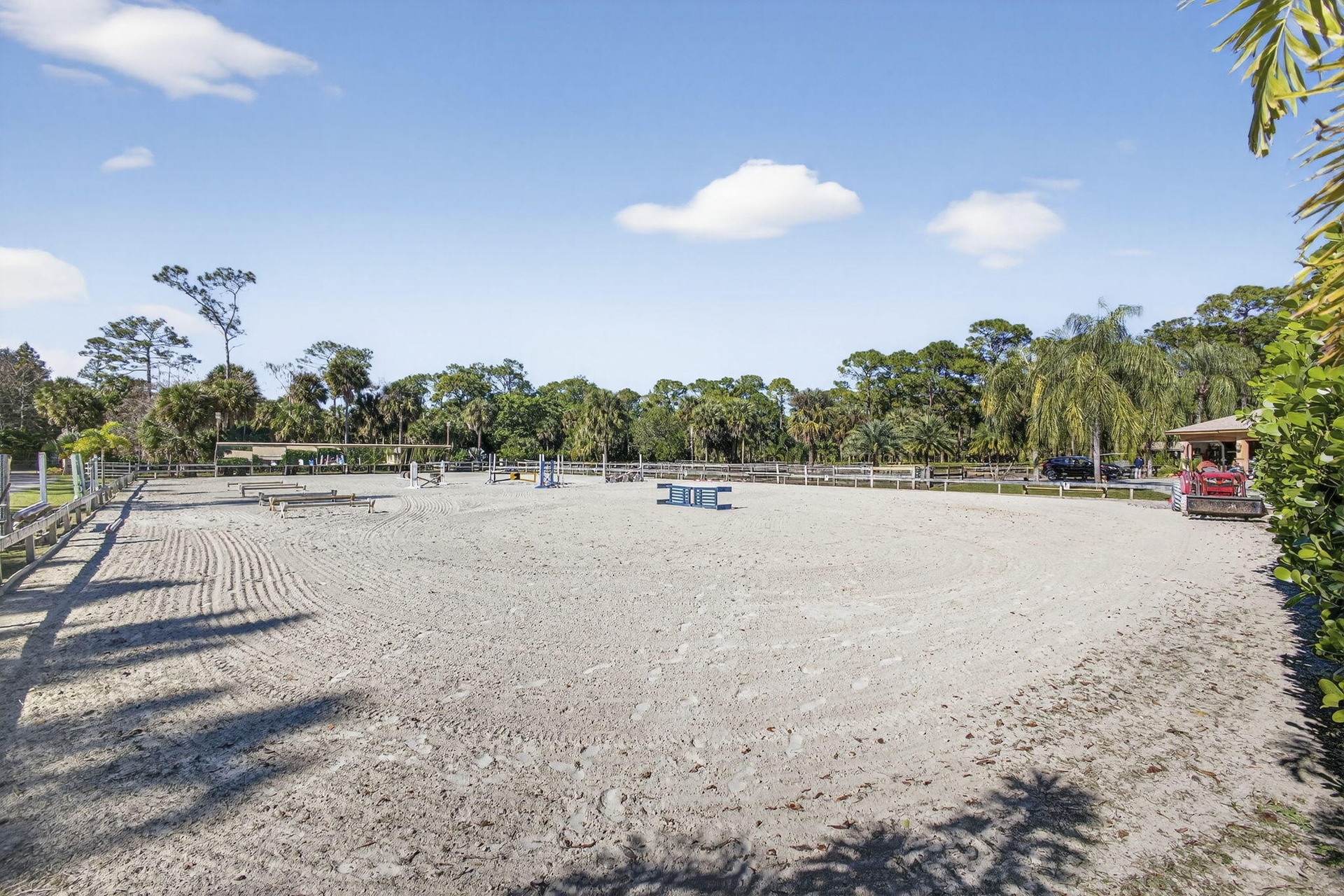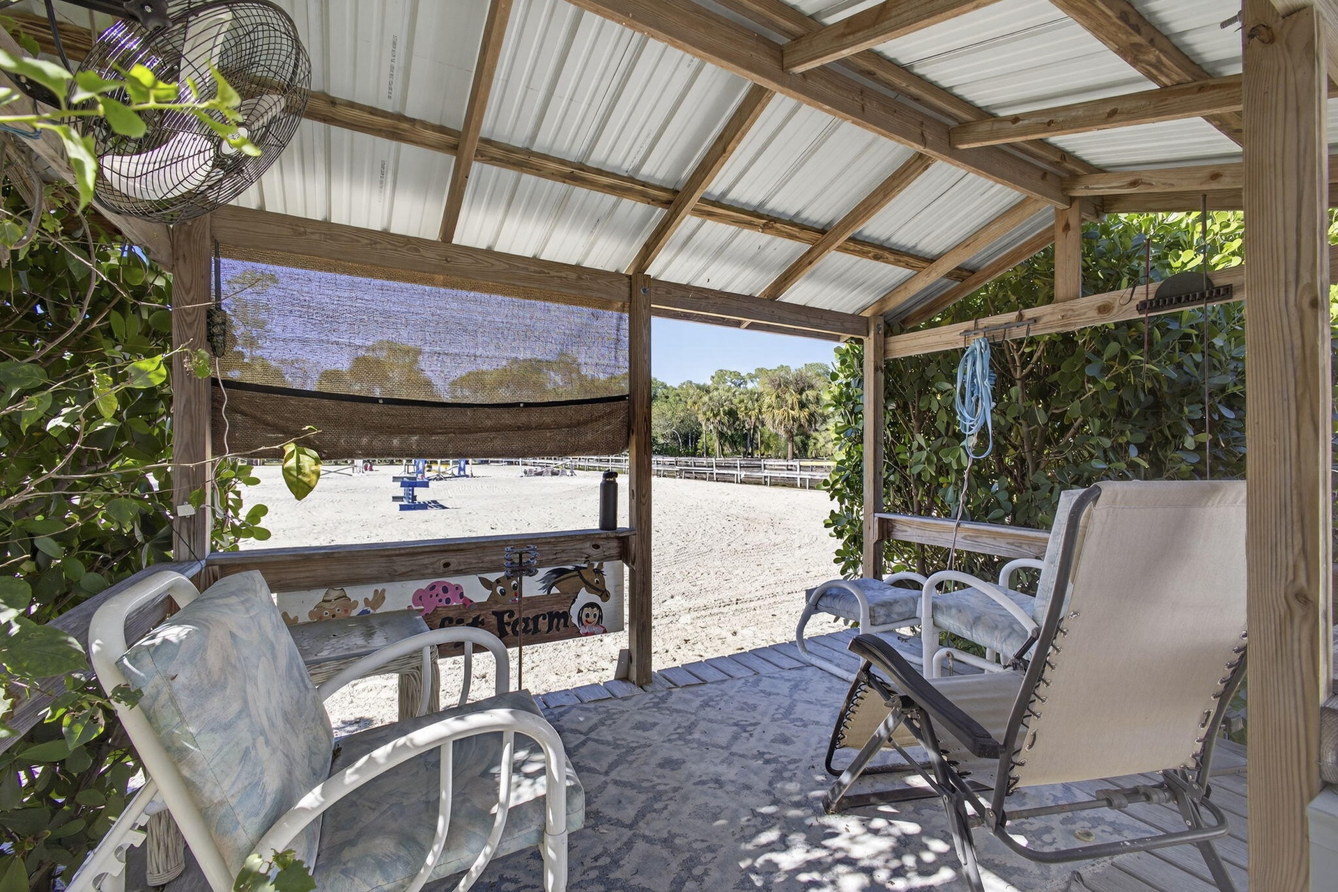 Arena 100' x 200' is irrigated by 6 water cannons and is fully lighted. Lovely viewing Pavilion to watch the riders.