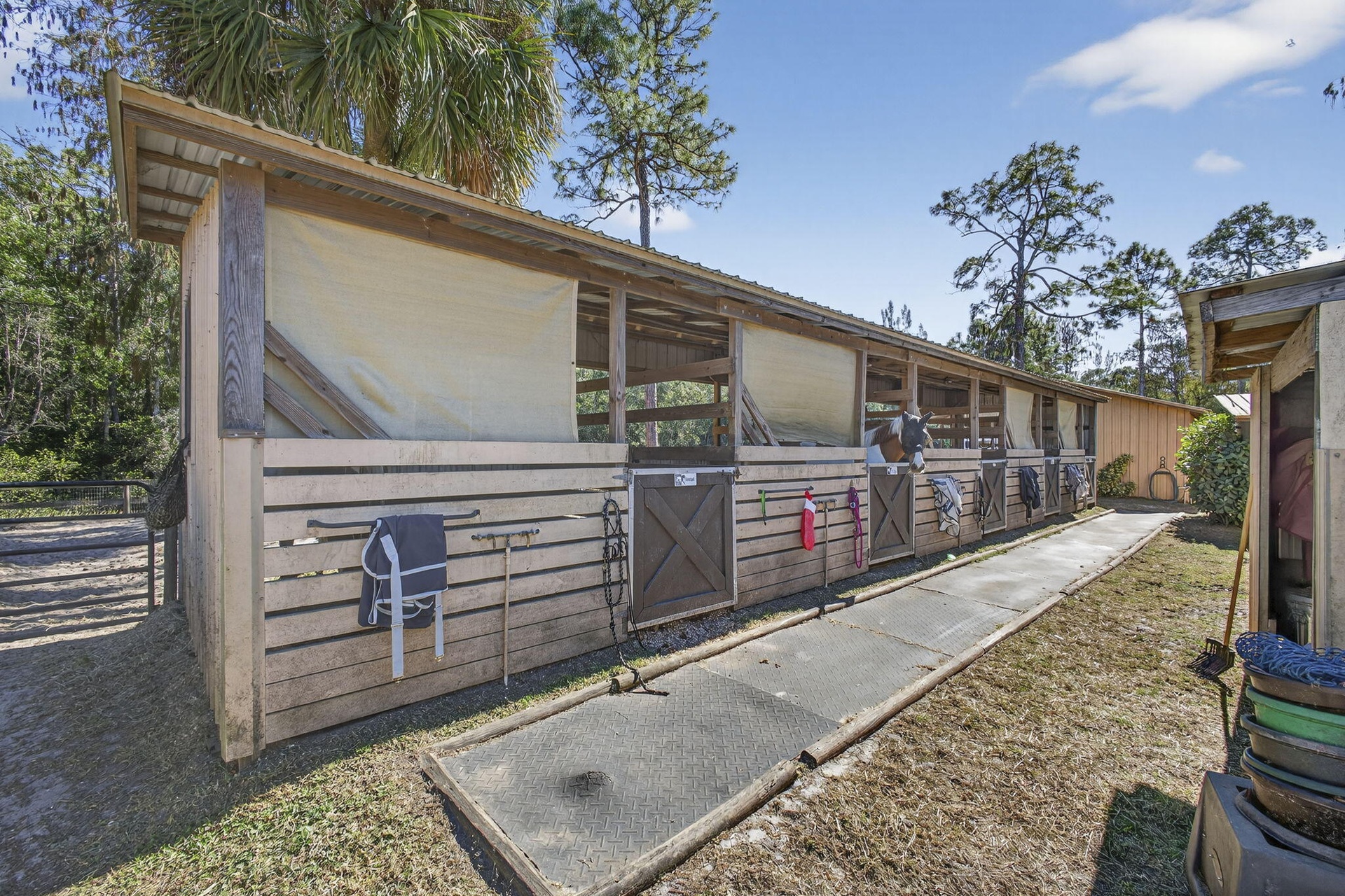 20 HORSE STALLS, ALL WITH RUN-OUTS, GROOMS QUARTERS, TACK ROOM, FEED ROOM, BATH ROOM. ARENA 100 X 200, 50' ROUND PEN, 2 WASH RACKS INSIDE (W/ HOT WATER) 2 WASH RACKS OUTSIDE. FULLY IRRIGATED 8 ZONES CANAL FED.