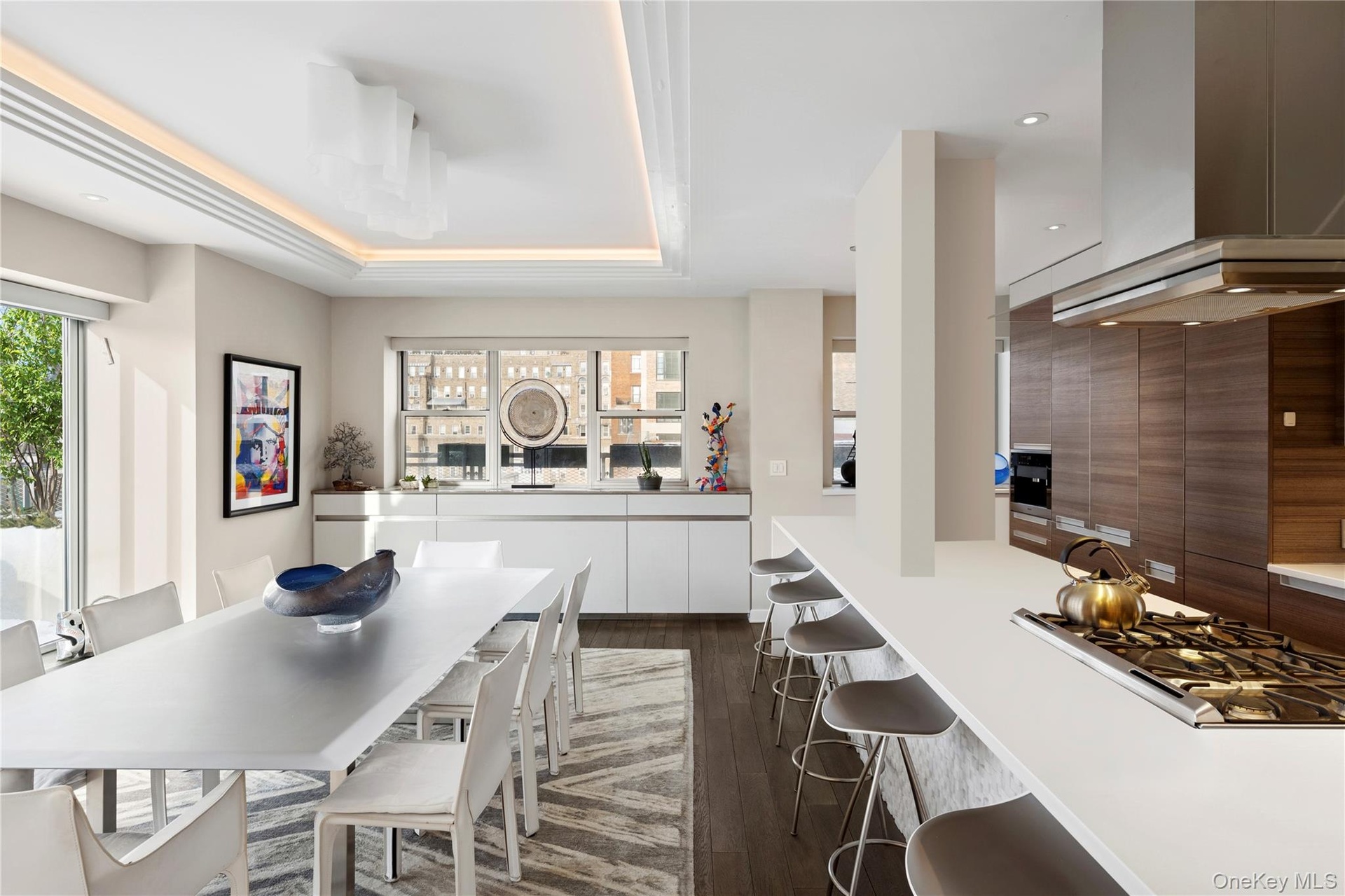The chef’s kitchen features sleek Poggenpohl cabinetry, top-of-the-line appliances, Caesarstone countertops, a built-in coffee station, and a water filtration system, blending refined design with everyday functionality.