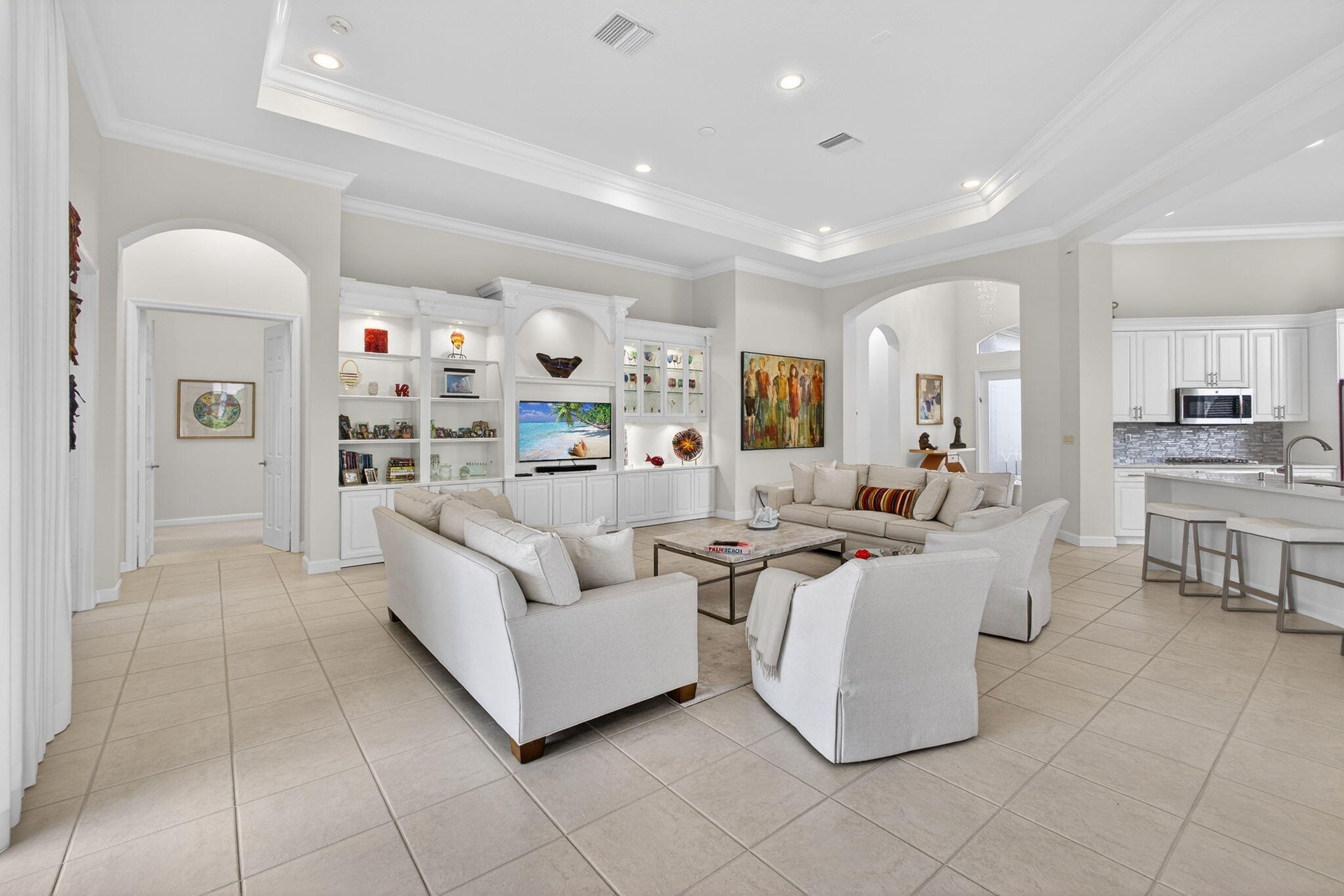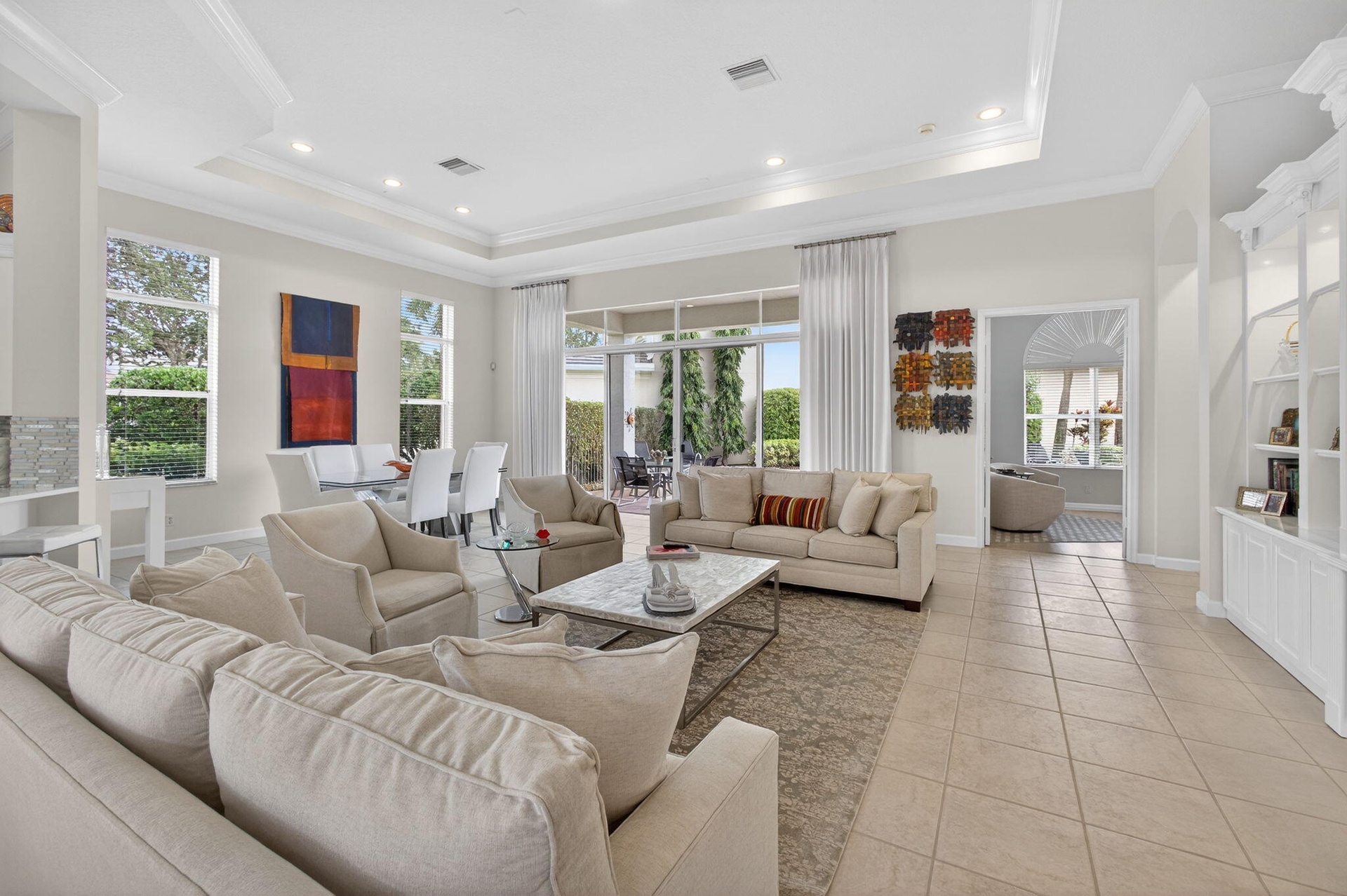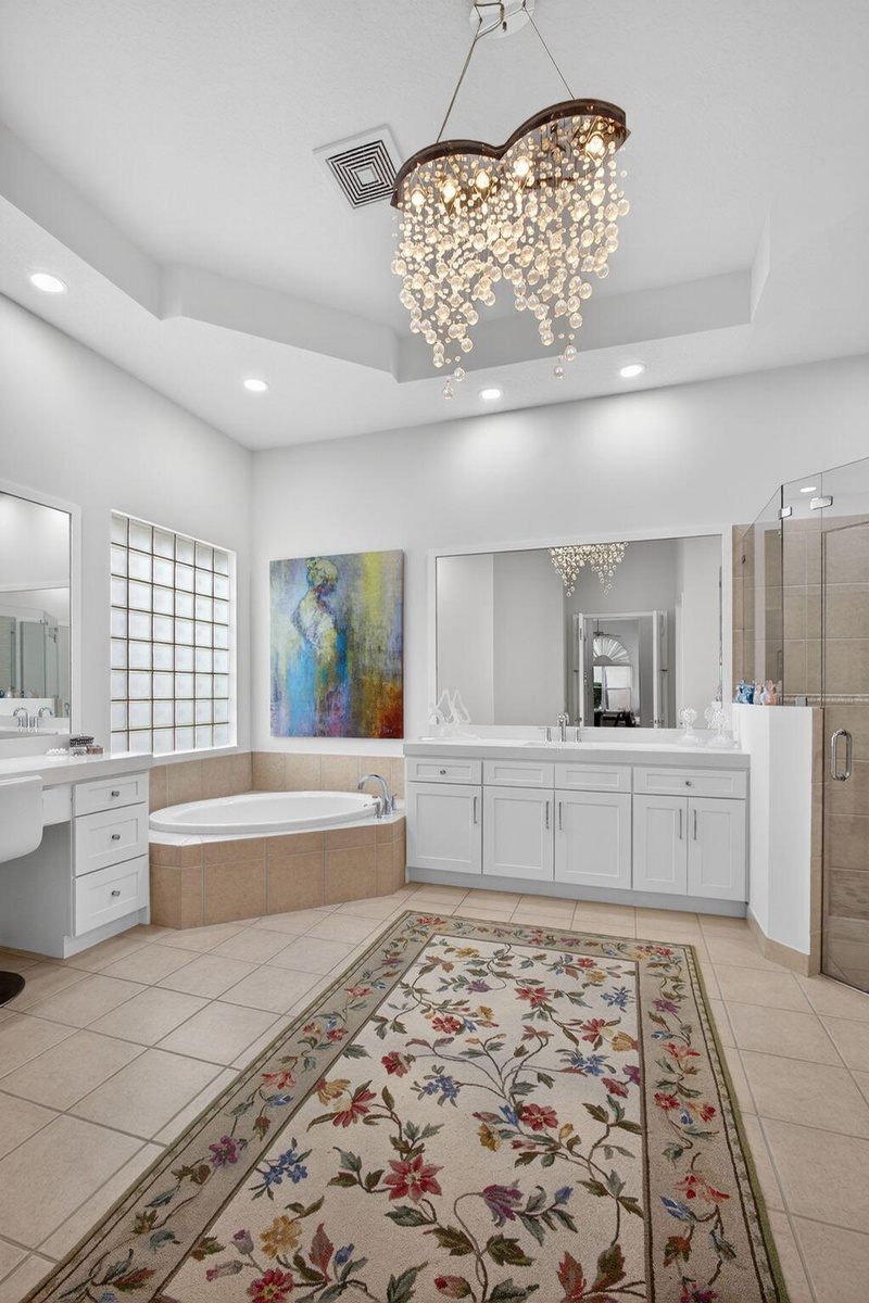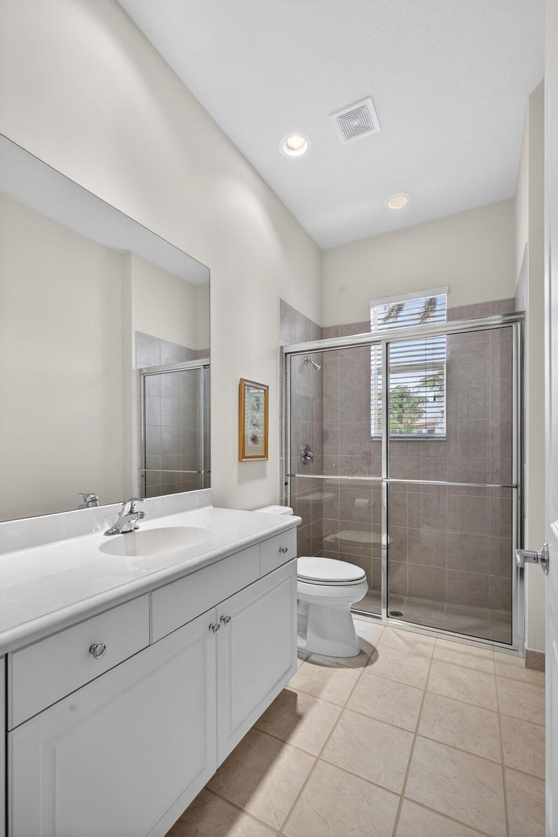 Exciting Country Club at Mirasol home with golf membership, set on an oversized, professionally landscaped cul-de-sac lot. Enjoy extended brick patios and a heated pool with waterfall, perfect for outdoor living. Soaring ceilings and a dramatic open floor plan offer ideal space for everyday living and entertaining. Features include three en-suite bedrooms plus a private powder room with marble sink and custom lighting. Crisp all-white interior painted in 2023 with crown molding and recessed lighting. The primary bath was renovated in 2024 and includes an expansive walk-in closet. White kitchen and bar remodeled in 2023 with updated appliances. New roof, gutters, and two AC units (2024â€''2025). Library with custom cabinetry, central vacuum, hurricane protection, impact front windows. Exciting Country Club of Mirasol ranch residence with golf membership, ideally situated on an oversized, professionally landscaped cul-de-sac setting. Enjoy extended brick patios and a beautifully heated pool with waterfall, creating a perfect outdoor retreat. Inside, you'll love the soaring ceilings and dramatic open floor plan, ideal for both everyday living and entertaining. Special features include three spacious en-suite bedrooms with full baths, plus an additional private powder room featuring a marble sink and custom lighting. The home was completely painted in a crisp all-white interior in 2023, enhanced by crown moldings and abundant recessed lighting throughout.The impressive primary bathroom was renovated in 2024 and features approximately 25 feet of luxurious space, along with an expansive 30-foot walk-in closet offering exceptional storage. The white kitchen and bar area were remodeled in 2023 with updated appliances, creating a bright and inviting gathering space. Major updates include a new roof and gutters, along with two central air units completed in 2024 and 2025. The library showcases elegant white office cabinetry and rich wood floors. Additional highlights include central vacuum, hurricane shutters, and impact glass windows on the front of the home. Bedroom furniture is included.