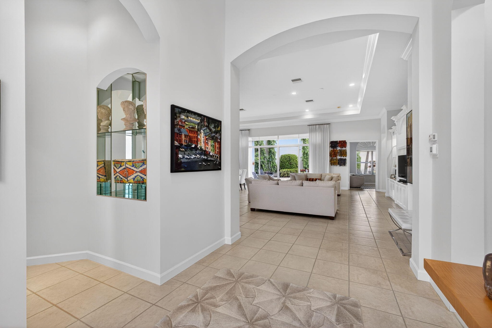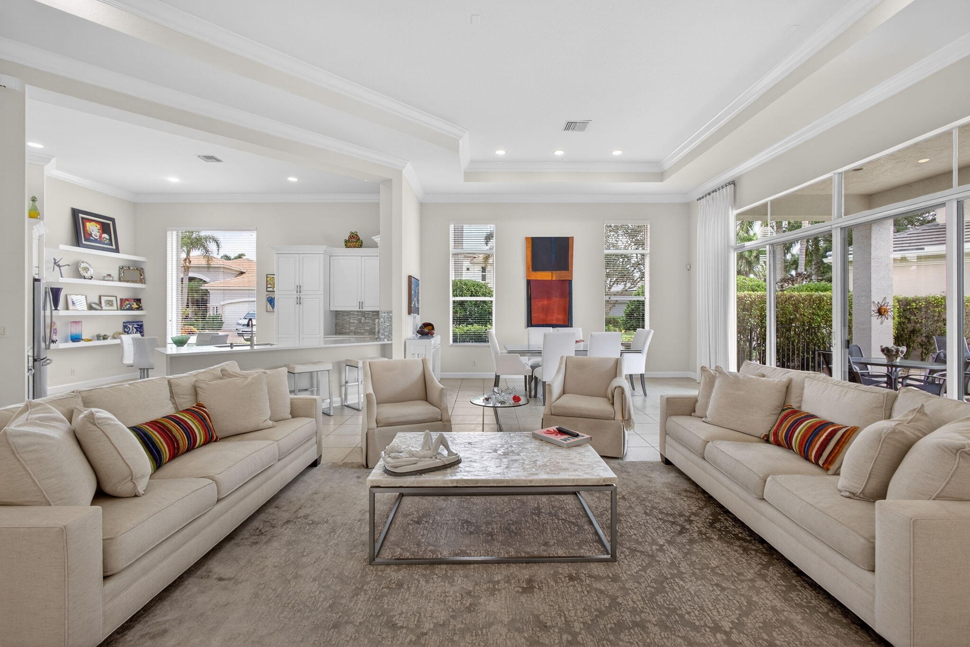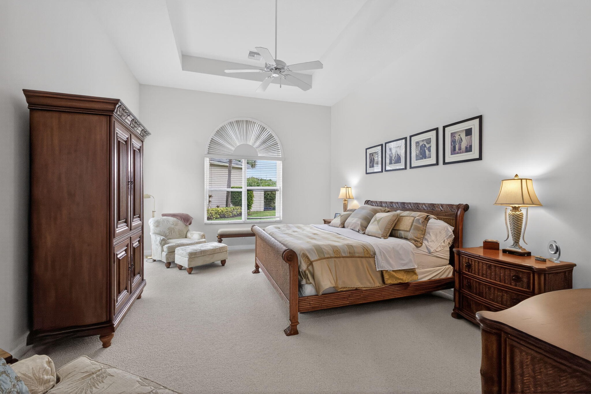 Exciting Country Club at Mirasol home with golf membership, set on an oversized, professionally landscaped cul-de-sac lot. Enjoy extended brick patios and a heated pool with waterfall, perfect for outdoor living. Soaring ceilings and a dramatic open floor plan offer ideal space for everyday living and entertaining. Features include three en-suite bedrooms plus a private powder room with marble sink and custom lighting. Crisp all-white interior painted in 2023 with crown molding and recessed lighting. The primary bath was renovated in 2024 and includes an expansive walk-in closet. White kitchen and bar remodeled in 2023 with updated appliances. New roof, gutters, and two AC units (2024â€''2025). Library with custom cabinetry, central vacuum, hurricane protection, impact front windows. Exciting Country Club of Mirasol ranch residence with golf membership, ideally situated on an oversized, professionally landscaped cul-de-sac setting. Enjoy extended brick patios and a beautifully heated pool with waterfall, creating a perfect outdoor retreat. Inside, you'll love the soaring ceilings and dramatic open floor plan, ideal for both everyday living and entertaining. Special features include three spacious en-suite bedrooms with full baths, plus an additional private powder room featuring a marble sink and custom lighting. The home was completely painted in a crisp all-white interior in 2023, enhanced by crown moldings and abundant recessed lighting throughout.The impressive primary bathroom was renovated in 2024 and features approximately 25 feet of luxurious space, along with an expansive 30-foot walk-in closet offering exceptional storage. The white kitchen and bar area were remodeled in 2023 with updated appliances, creating a bright and inviting gathering space. Major updates include a new roof and gutters, along with two central air units completed in 2024 and 2025. The library showcases elegant white office cabinetry and rich wood floors. Additional highlights include central vacuum, hurricane shutters, and impact glass windows on the front of the home. Bedroom furniture is included.