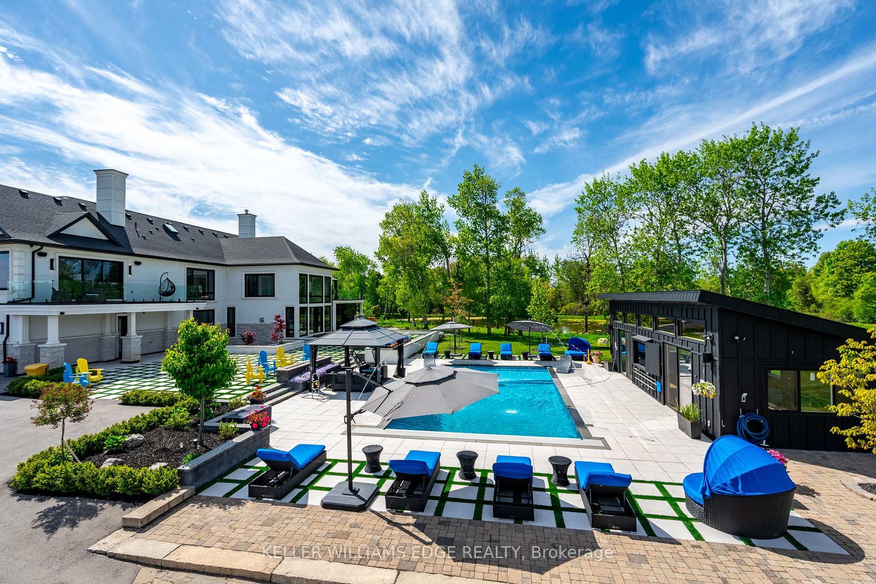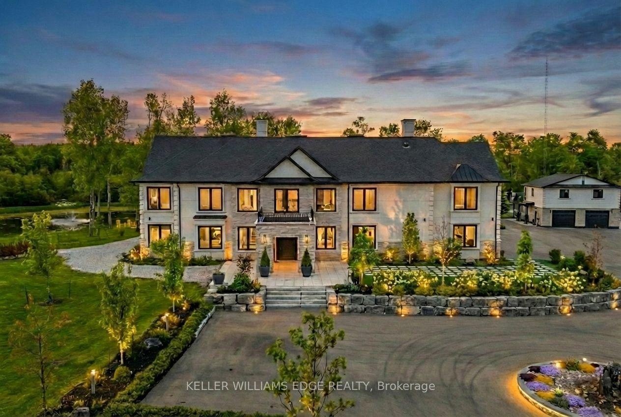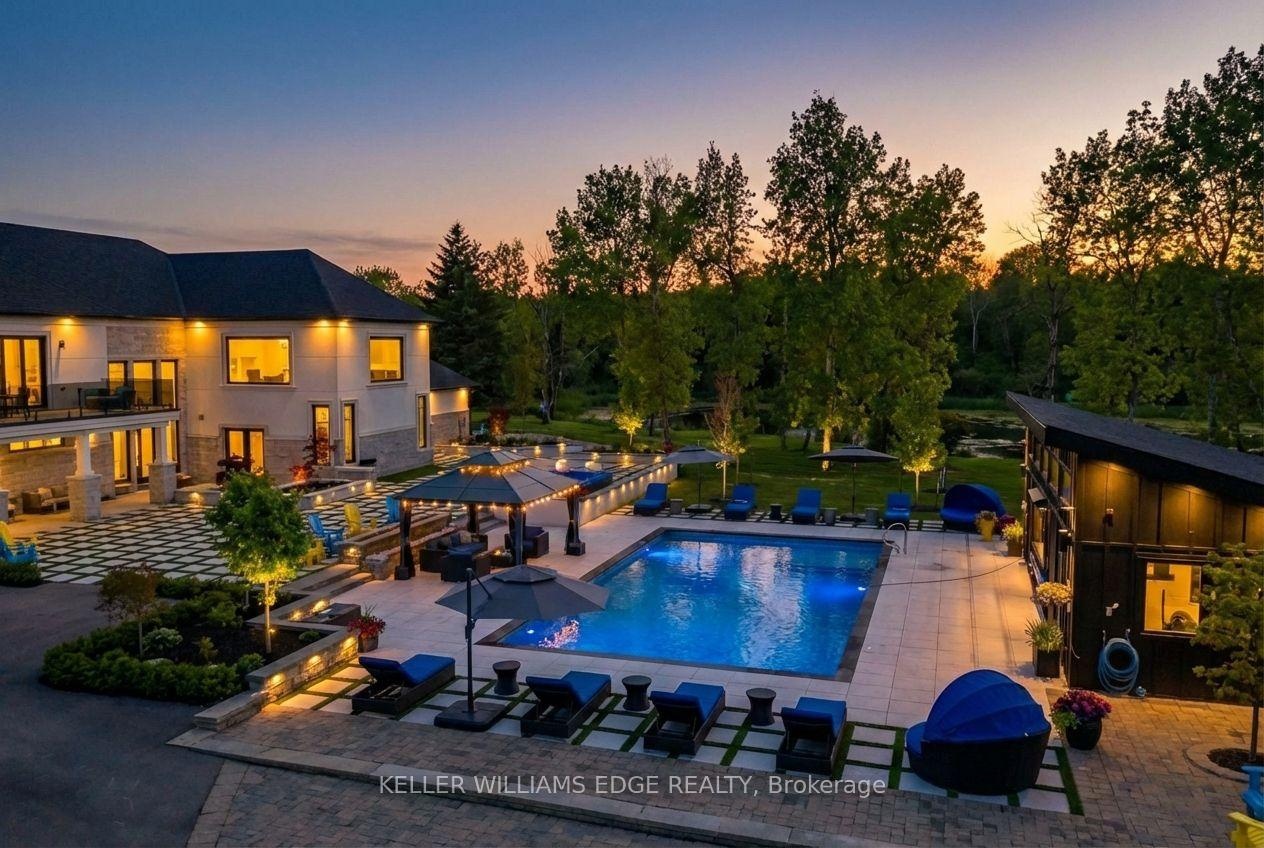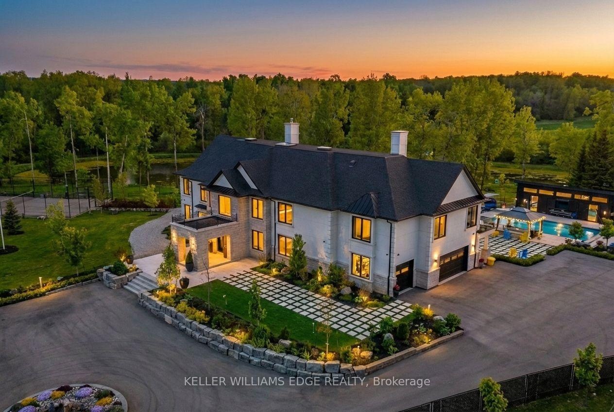 A truly rare offering. Set on 5.76 acres of private, tree-lined grounds, this custom-built estate presents an exceptional opportunity to own a secluded executive retreat minutes from the GTA. Thoughtfully designed and meticulously crafted by its original owners, the residence balances architectural presence with everyday livability, offering space, privacy, & quality that is difficult to replicate. A dramatic 22-foot foyer with a striking floating staircase creates a commanding first impression, while expansive floor-to-ceiling windows frame serene natural views & flood the home with sunshine. The layout is intentionally designed for both grand-scale entertaining and comfortable family living. At the centre of the home is a remarkable chef's kitchen featuring dual oversized islands with seating for up to fourteen, premium appliances, & seamless flow to the sunroom & outdoor kitchen, ideal for hosting, gatherings, & year-round entertaining. This estate offers an extensive collection of resort-style amenities, including a private spa with a 10-person jacuzzi, steam room, & sauna, plus a fully equipped home theatre, gym, games area, & full bar. A private elevator enhances convenience across all levels. Above the garage, a three-bed guest suite provides flexibility for extended family, guests, or live-in support. The outdoor experience is equally impressive: heated saltwater pool, two fire pit areas, tennis & basketball courts, walking trails surrounding a tranquil private pond, & multiple outdoor spaces designed for relaxation and entertaining, all within complete privacy. The property is equipped with solar & geothermal systems, full smart-home integration, & dual septic systems, reflecting a commitment to sustainability, efficiency, & long-term ownership. A rare legacy estate offering privacy, land, & lifestyle without sacrificing proximity to major urban centres. An exceptional opportunity for the discerning buyer seeking space, discretion, & enduring value.