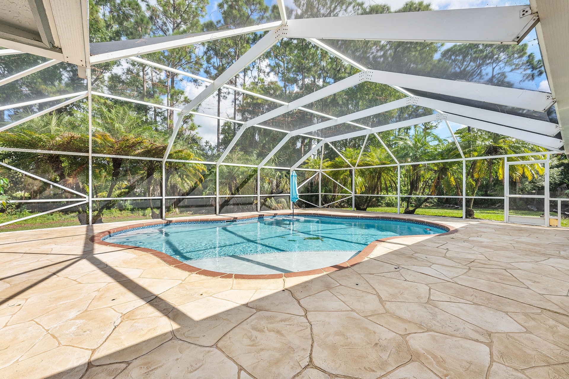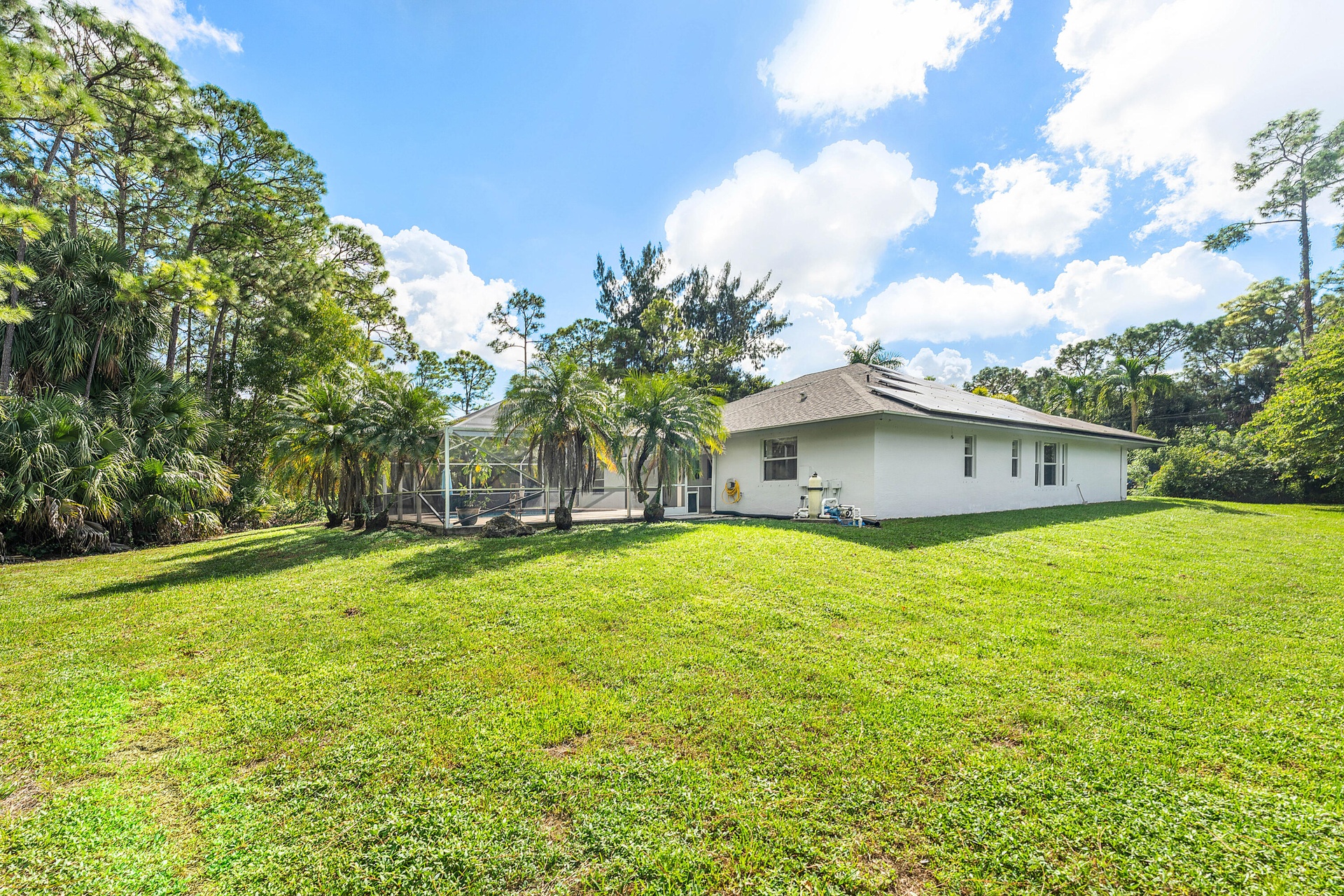 Located at the absolute end of a quiet street with zero through-traffic, this 1.31 acre fenced estate offers a level of privacy and autonomy that is increasingly rare. The centerpiece of the outdoor lifestyle is a massive, screen-enclosed deck featuring a saltwater pool and an oversized covered patio, creating a seamless space for large-scale entertaining or quiet relaxation. Outside the enclosure, the custom fire pit and expansive acreage provide a secluded retreat under the stars. With no HOA, there is ample, secure space for an RV, boat, and multiple vehicles, catering perfectly to an active, mobile lifestyle. The 3,227 total square foot interior is completely carpet-free, featuring high-end wood and tile flooring throughout. The kitchen is designed for the home chef with double ovens and generous counter space, while the floorplan offers unmatched versatility. A large flex wing includes a wet bar, wine fridge, and ensuite bath, serving as a sophisticated home office or media suite, supplemented by a fifth-room potential with its own window and closet. Recent efficiency upgrades include a brand-new water softener system, solar panels, and a new A/C unit. Located minutes from Wellington's equestrian venues, this turn-key residence includes high-speed internet and FPL electric up to $400 per month, offering a refined rural lifestyle without compromising on modern convenience.