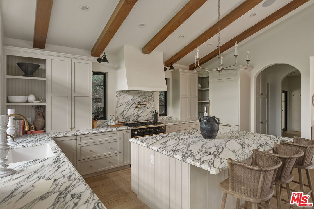 Nestled in Brentwood, this Spanish-style residence evokes timeless sophistication -- an architectural gem with interiors worthy of the pages of a design magazine. Classic rustic charm meets modern refinement throughout, with soaring beamed ceilings, wide plank oak floors, graceful archways, and an abundance of natural light streaming through oversized windows. A dramatic double-height entry sets the tone, opening to an expansive great room crowned with beams and framed by a wall of French doors that invite effortless indoor-outdoor living. Carefully curated lighting and integrated surround sound create an inviting ambiance to elevate every moment. The space flows seamlessly from the living area, anchored by a striking floor-to-ceiling fireplace, to a dining nook with built-in banquet seating and onward to the showpiece kitchen. The gourmet kitchen is as beautiful as it is functional, featuring natural stone surfaces, custom cabinetry, and gleaming brass fixtures that feel like jewelry. A substantial center island with bar seating serves as the heart of the home, while a premium ILVE double oven range with a custom hood brings culinary ambitions to life. Just down the hall, a versatile den offers possibilities for a variety of lifestyles, ideal for use as a home office, media lounge, gym, or playroom. The main-level primary suite is a serene retreat, opening through French doors to the lush backyard. Indulge in a spa-inspired en suite bath with dual stone-topped vanities, a glass-enclosed tiled shower, and a generous walk-in closet with custom organization. Upstairs, three spacious secondary bedrooms await, including two with private balconies. A beautifully appointed shared bath features dual vanities and a shower-tub combination. Outside, the fenced backyard lives like a private oasis, enclosed by mature hedging and offering a grass lawn alongside an expansive pergola-shaded patio for lounging, dining al fresco, or enjoying game-day gatherings. Additional highlights include a stylish powder room, a fully outfitted laundry room, and an attached two-car garage with direct home access. Supremely located with convenient access to the best of Brentwood's amenities and top-rated schools. Popular boutiques and renowned restaurants are just moments away in Brentwood Village and along San Vicente Blvd, while the beach is just a few minutes' drive. This exceptional residence embodies the romance of the Spanish-style with the ease of modern luxury in one of the Westside's most desirable neighborhoods.