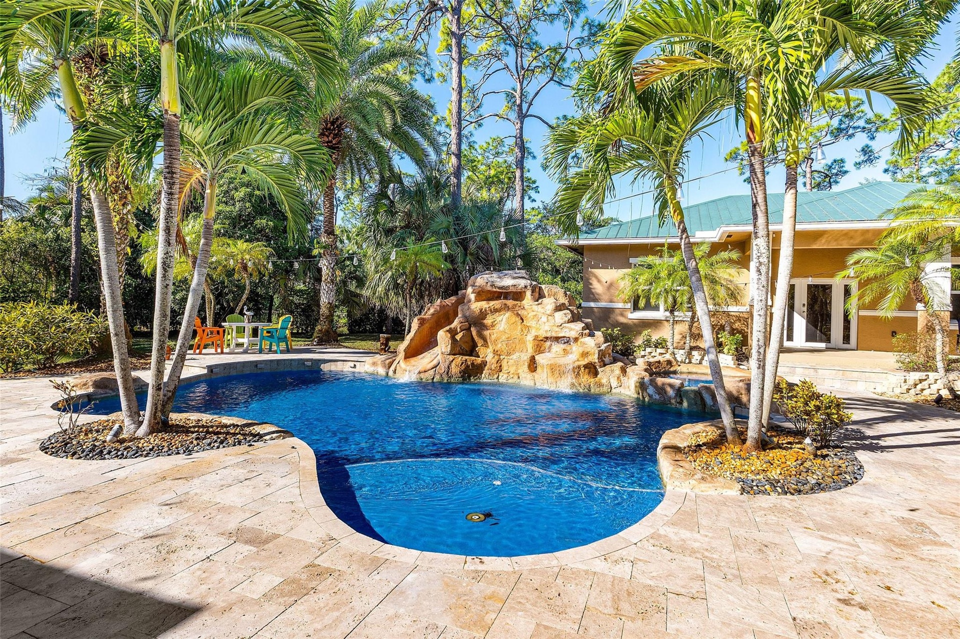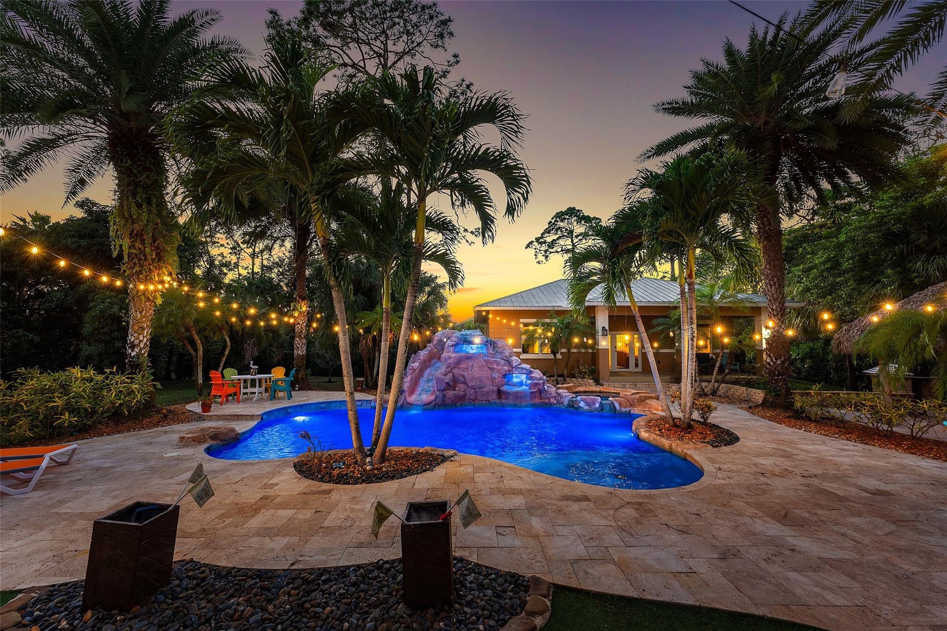 Beautiful family compound with a guest house set on 1.09 acres, perfect for multi-generation households. Large living areas framed by impact glass create seamless indoor/outdoor flow with tranquil views of the tropical pool & backyard. A striking exterior features a long driveway, manicured lawn, & stunning double-door entry. The open kitchen/family room offers wood cabinetry, top-shelf appliances, a fireplace & generous space. The impressive primary suite boasts a spa-like bath, custom closets, & serene pool views. Enjoy a private backyard retreat with a tiki hut, oversized pool with waterfall & slide, multiple outdoor living spaces & when the sun goes down the magic begins. Fabulous guest house with a front porch, great room, full kitchen & bath—ideal for guests or in-laws.
