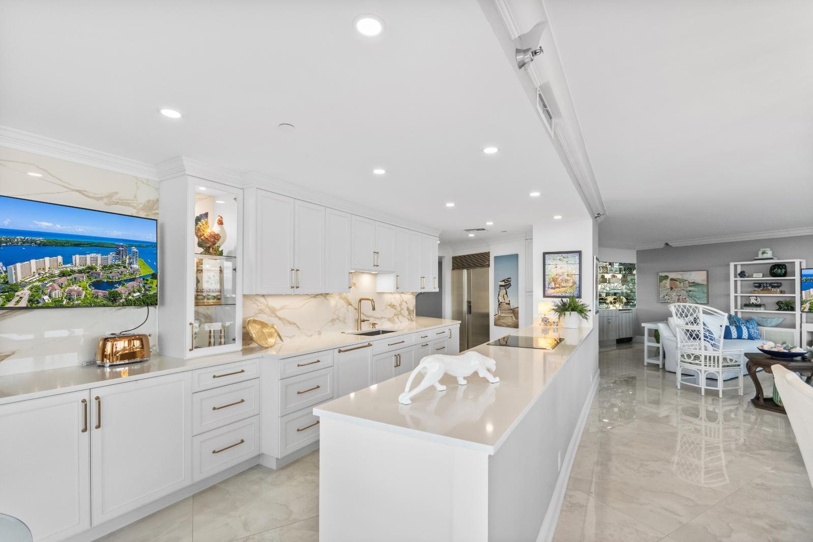 Step into luxury living in this beautifully renovated 14th-floor residence, showcasing unobstructed southeast waterfront views from every main room. This spacious 3-bedroom condo features three private en-suite bathrooms plus a powder room, offering comfort and convenience for both residents and guests. A magazine-worthy chef's kitchen serves as the heart of the condo, complete with Sub-Zero refrigeration, Monogram cooktop, premium cabinetry, and abundant counter space. The kitchen opens seamlessly to the elegant formal dining area, as well as a cozy breakfast nook and bar seating, perfect for casual mornings or entertaining on a grand scale. The expansive living area has views of the Atlantic Ocean and Singer Island, creating a truly breathtaking backdrop. Each bedroom has its own walk-in closet, walk-in shower, and serene water views, while the primary suite elevates luxury with two walk-in closets, a dual-sink vanity, large walk-in shower, soaking tub, and marble flooring. Additional highlights include a full-size laundry room with extra storage, generous closet space throughout, and a secure, gated community and 24-hour concierge service. Residents enjoy many amenities including a resort-style pool, hot tub, fitness center, community room, and more. Building elevators are currently being remodeled, with lobby and social room renovation plans underway, adding even more appeal to this exceptional property. All of this just moments from premier shopping, dining, golf, and miles of pristine shoreline. A rare opportunity to own a high-rise coastal retreat with unmatched views and upscale finishes.