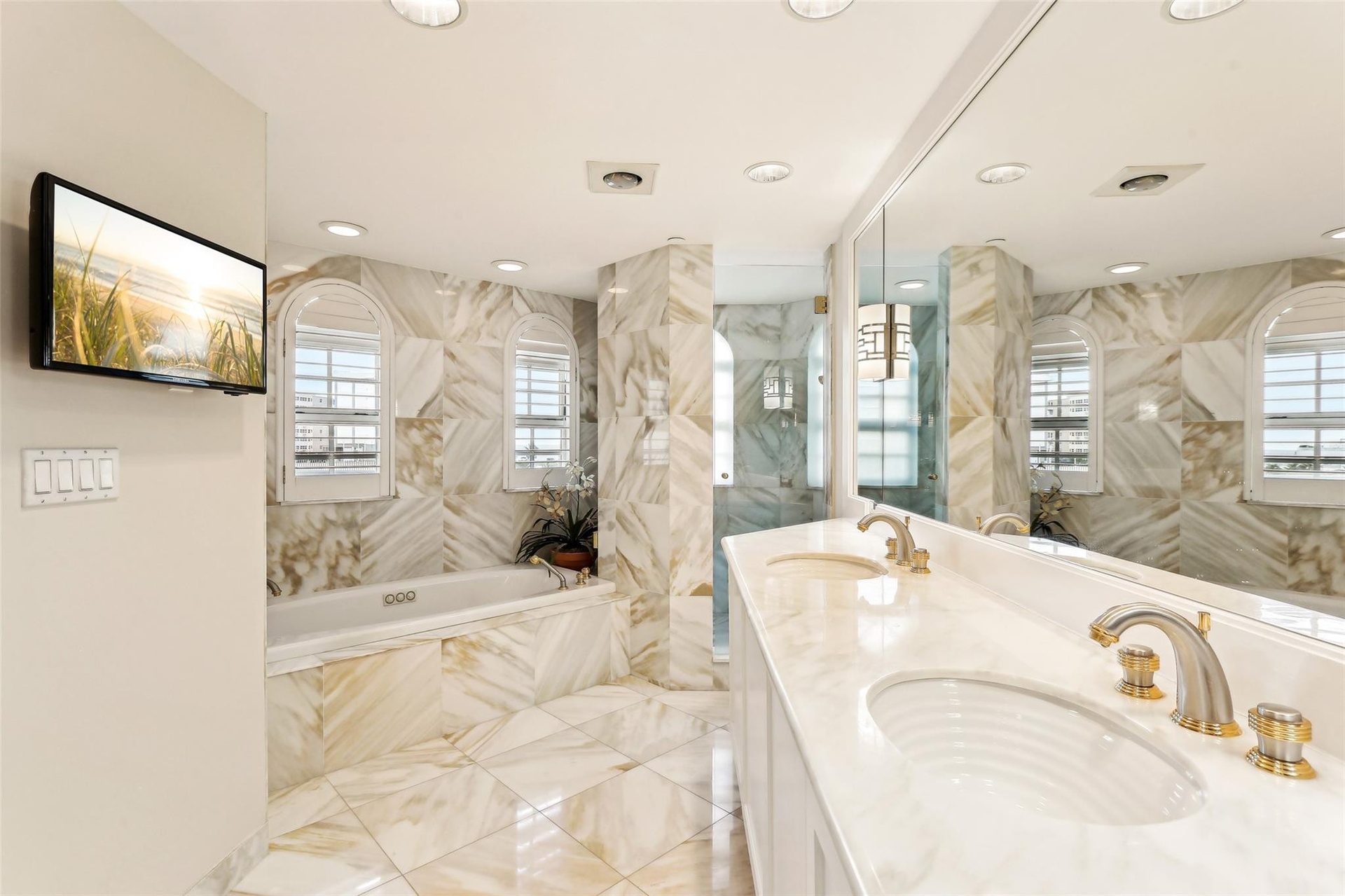 - Primary bath with double sinks done in onyx tile.