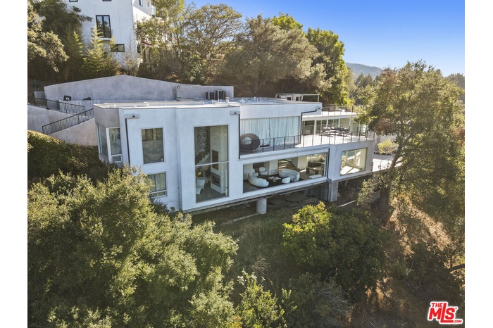 Suspended above the city within one of Beverly Hills' most exclusive, celebrity-favored gated enclaves, 9716 Oak Pass Road is a striking contemporary estate offering exceptional privacy, architectural distinction, and breathtaking panoramic views. The community is gated, and the residence itself is further secured behind its own private gate and drive, creating a rare and dramatic sense of arrival. Spanning approximately 6,244 square feet across three dramatic levels, this modern sanctuary is wrapped in walls of glass that capture canyon vistas from nearly every room, delivering a seamless indoor-outdoor lifestyle throughout. A signature architectural highlight is the glass-enclosed skybridge hallway suspended above the infinity-edge pool, serving as a sculptural centerpiece on the main level and elevating the home to true statement-level design. The residence offers a total of four bedrooms, including an expansive and private primary suite retreat with commanding views, oversized walk-in closets, and a spa-inspired bath. Three additional guest bedroom suites provide exceptional comfort and privacy. Designed for both refined daily living and elevated entertaining, the home features a gourmet chef's kitchen, sophisticated formal and informal living areas, a private executive office anchored by a dual-sided fireplace, and a dedicated private theatre/media room. Multiple view terraces and decks extend the living experience outdoors, while the floating infinity-edge pool appears to merge with the skyline, creating a resort-style setting high above Beverly Hills. Set among notable neighbors within an elite and discreet hillside enclave, this exceptional contemporary residence delivers a rare combination of privacy, prestige, and iconic architecture on one of Beverly Hills' most coveted streets.