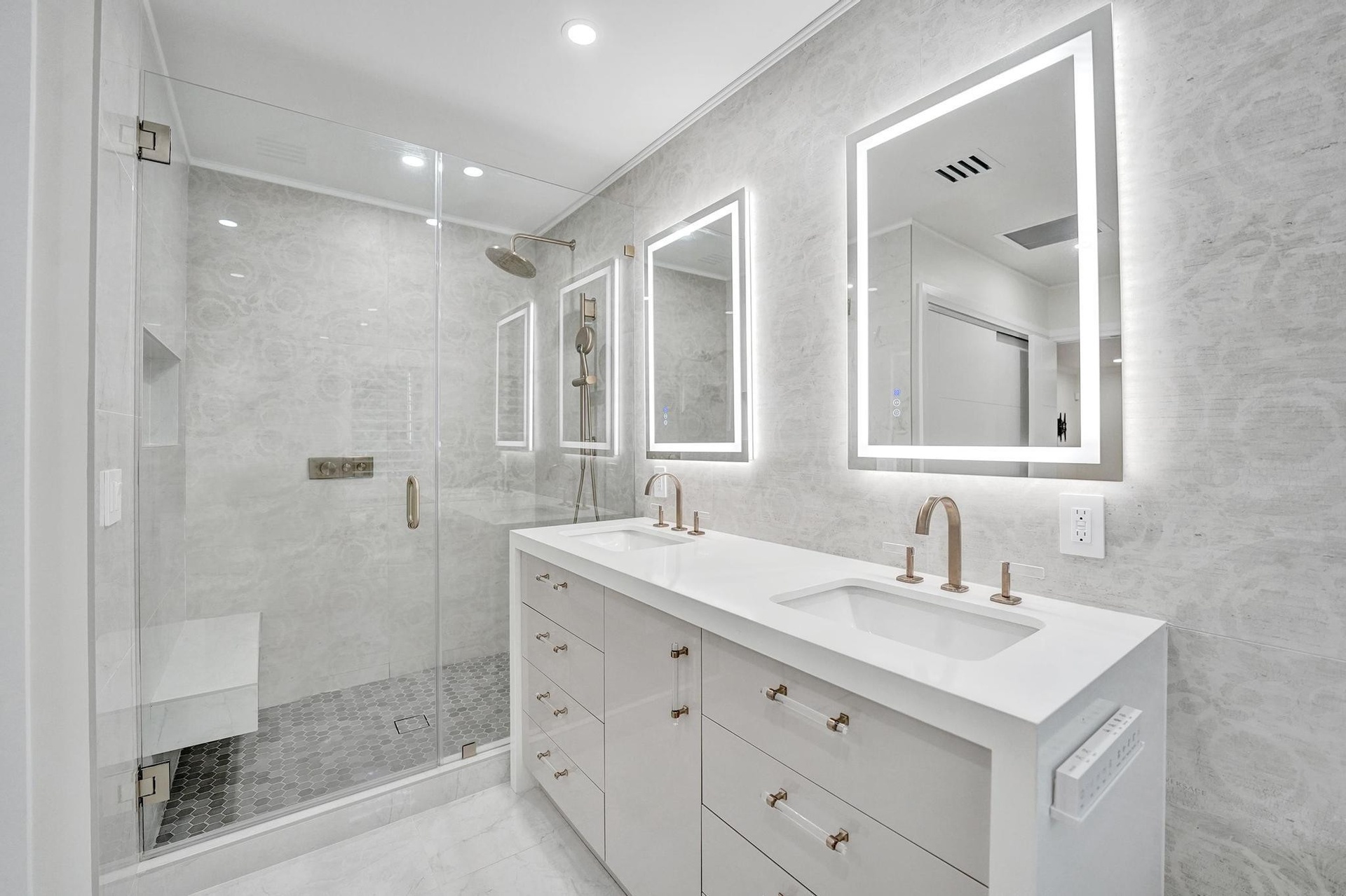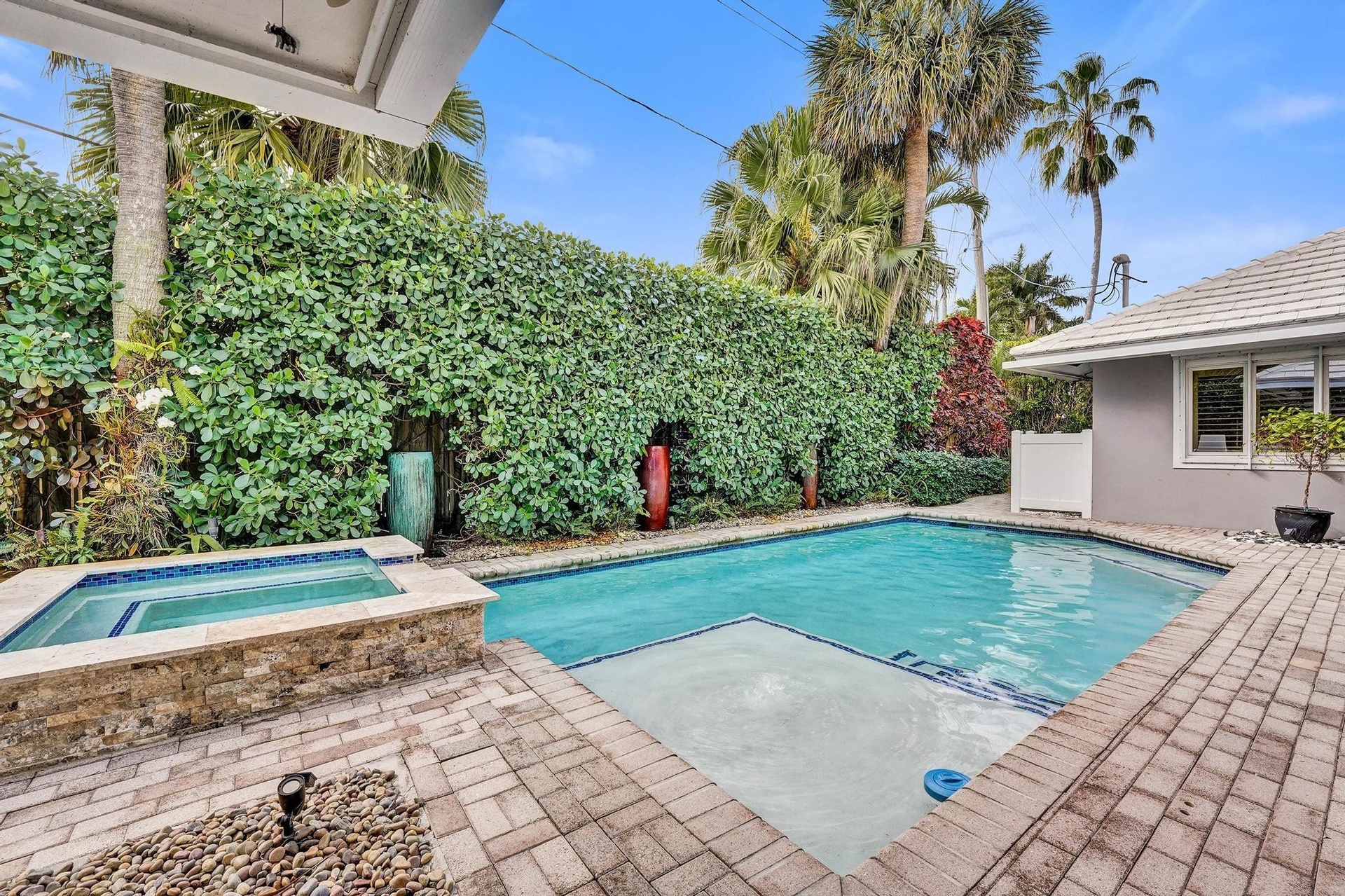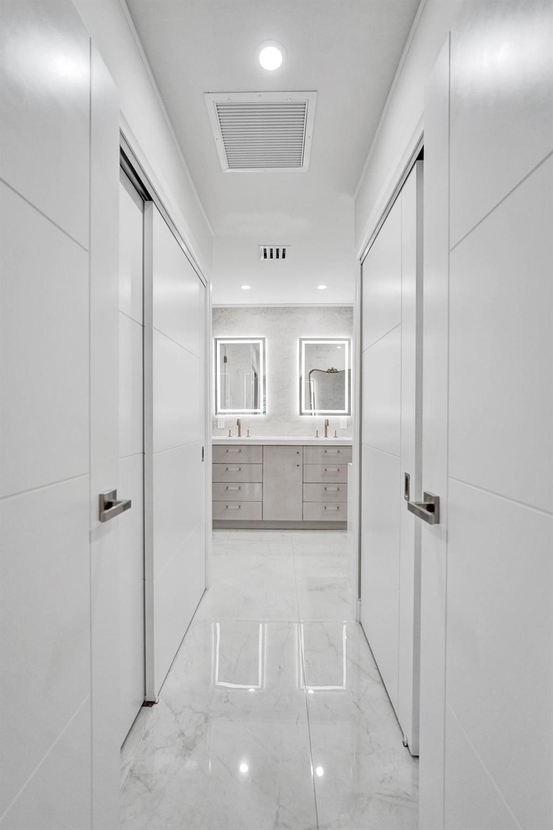 Inspired Coral Ridge Country Club fully renovated home showcasing luxury upgrades and calming designer finishes throughout. Gourmet kitchen remodeled with custom cabinetry, quartz counters, illuminated drawers, display shelving, LG & GE Monogram appliances, induction cooktop with concealed Wolf exhaust, and XO wine cooler. Features TWO primary suites with custom closets and spa-like ensuite baths finished with porcelain and Versace tile, Brizo fixtures, herringbone sinks, and European toilets. Private backyard retreat offers poolside dining, heated pool, sundeck, and hot tub, framed by lush landscaping with custom lighting. Home is wired for audio and includes water filtration, upgraded lighting, custom closets, temperature-controlled 2CG, well water irrigation, and more.